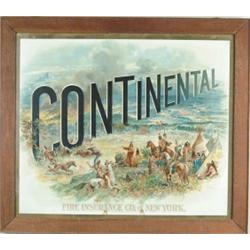 CONTINENTAL FIRE INSURANCE CO. SIGN. Seldom found textured paper sign from this insurance company with terrific illustration of Native American Indians and bison fleeing an advancing forest fire. In its original oak frame, lithographed by J. Ottmann Lithography Co., NY, circa 1895. SIZE: Image 32 1/2” w. x 27 1/2” t. CONDITION: Two small water stains to lower margin; otherwise, very good; could use a thorough cleaning. PF 1-3660 (600-900)
