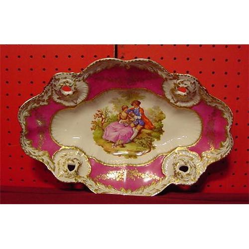 Circa 1870-1880 Beautiful Continental Porcelain Serving Dish. This just came out of a New Yoyk Estate.It could be Dresden,Limoge or any of those French or German Porcelain Factories. A very Beautiful piece in Excellent Condition. Well Painted Scene of Early Couple sitting in the forest(woods) with both with a romantic adoring look with wonderful costumes and flowers. This piece is signed in the scene "gragonard". It also has a mark on the back that appears to be a "C" engulfed in a "H" with the "H" having streamers. Measures 15" X 9 1/2". EXCELLENT CONDITION. GOOD QUALITY.