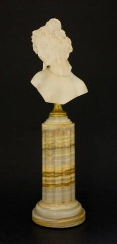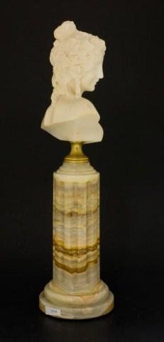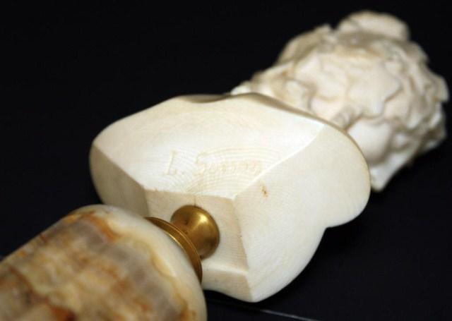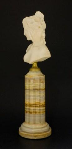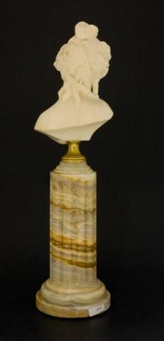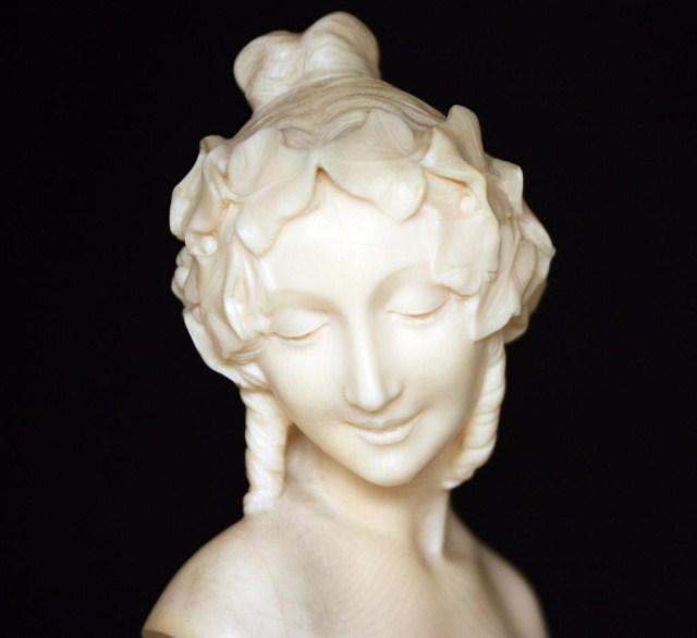 Louis Sosson, French (worked 1905-1930) sculptor and accomplished ivory carver. Worked for Edmond Etling . Depicts a woman with her head tilted to the right. She has a ivy garland in her hair. Has marble column base. Signed to back L. Sosson. Circa 1900. Measures 10 1/4" height.