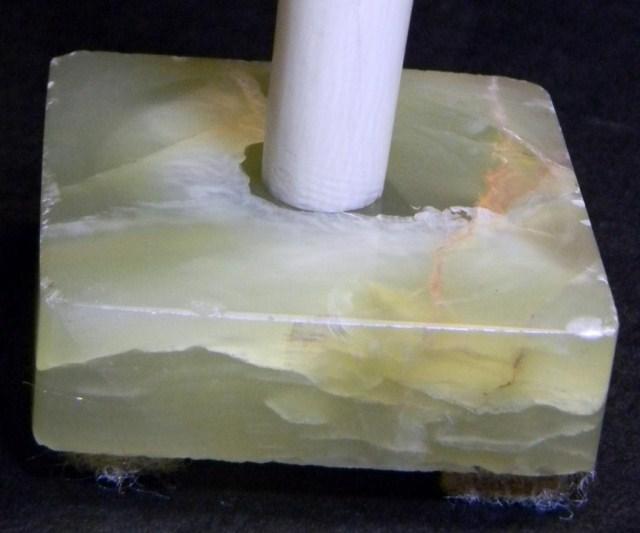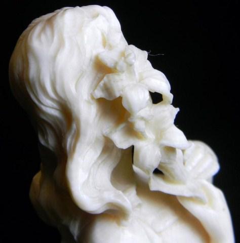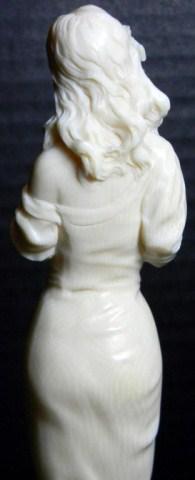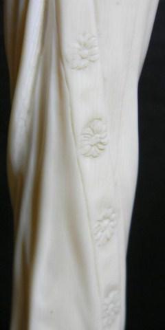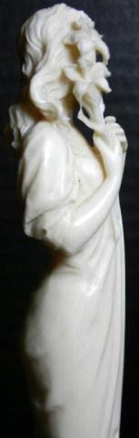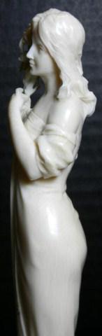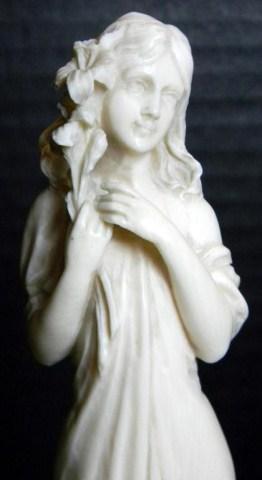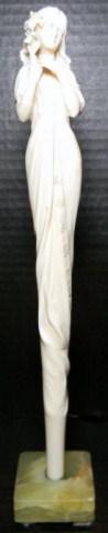 Depicts a tall slender woman in a robe like floral dress. In her right hand she is holding a flower near her face. Has a green onyx base. Measures 12 5/8" height. Great condition.