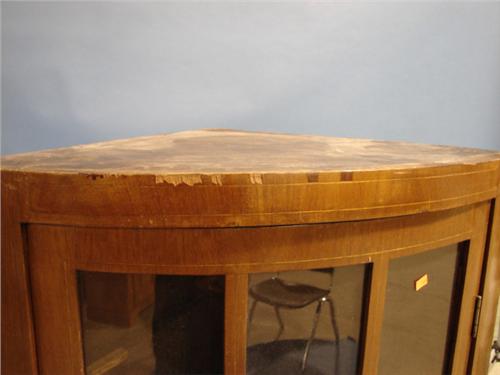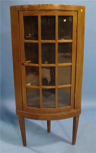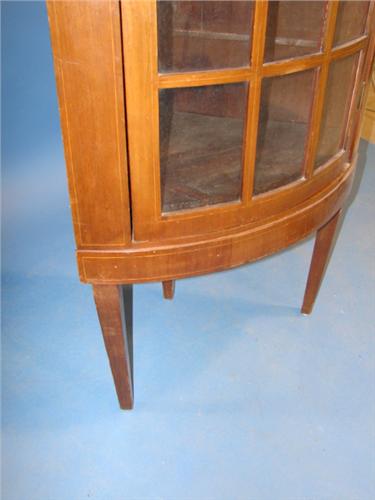 CONTINENTAL MAHOGANY CORNER CUPBOARD ON TAPERED LEGS. Bowed front. 12 pane glass door. Dovetailed construction. Inlaid decoration. Two board back. Has three wooden shelves. Shows some loss to veneer at top. 62.5” H, 32” W, 19” D