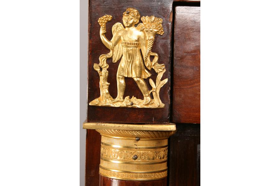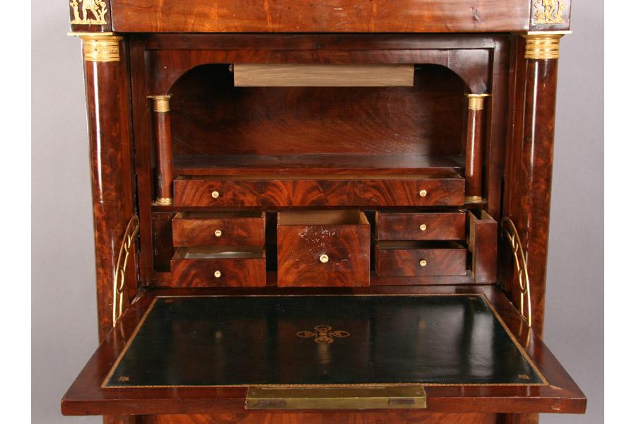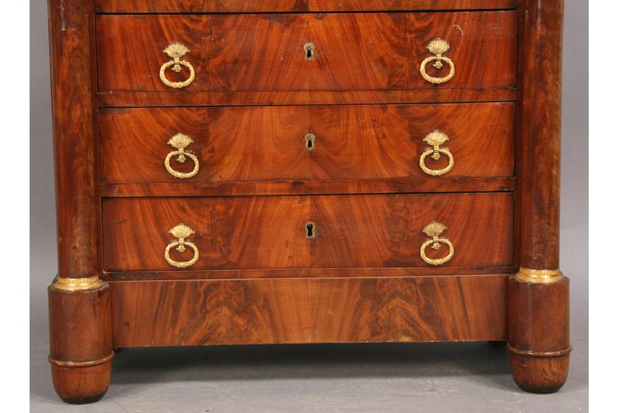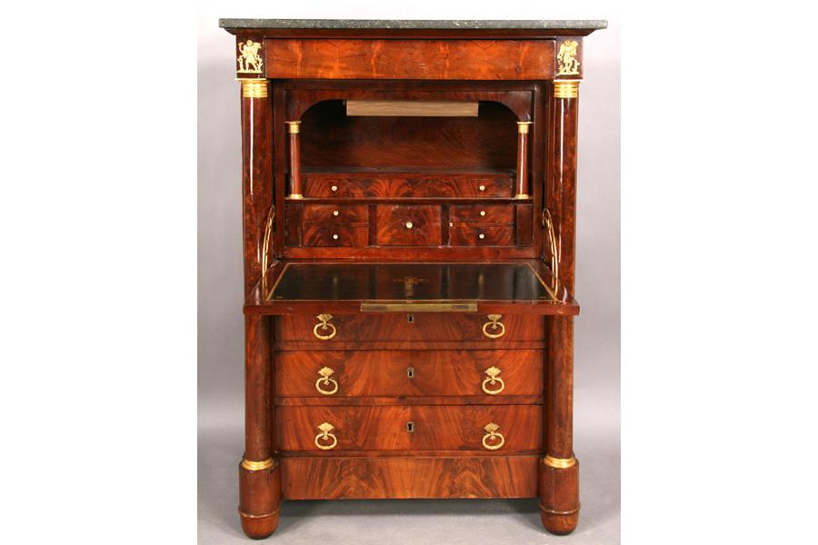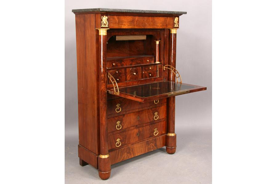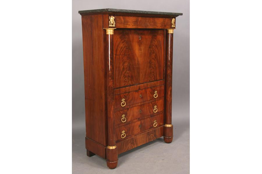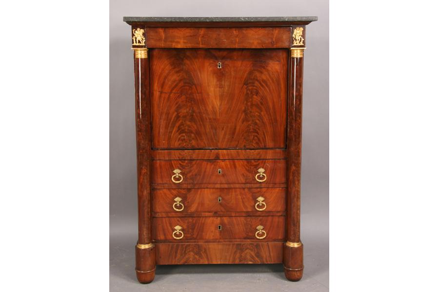19th century mahogany marble top abattant, the fall front desk flanked by bronze mounted columns over three drawers. Ht: 55" Width: 37" Depth: 17" ***PLEASE NOTE: All property shall be paid for by the purchaser within five (5) business days of the sale. Kamelot Auctions accepts cash (In house only), personal checks, certified checks and money orders. We do not accept credit cards or Paypal under any circumstances. Please note our policy regarding payments from International buyers: The only acceptable method of payment is a bank wire/bank transfer. For invoices more than $1000, there is no additional fee for this service. For invoices less than $1000, please include an additional $25 wire fee. We will be happy to forward our bank wiring information after the completion of the auction. Thank you for your understanding and cooperation. All purchases must be removed within 15 business days after an auction. Property not removed from our facility after 15 business days will be moved to an off-site storage facility at a charge of $10.00 per day payable by the buyer. Kamelot does NOT provide shipping services or estimates. However, we recommend the following independent shipping services: Antique Transport Co. at antiquetransport@cs.com, Farren Transport at farrentransport@comcast.net or All Points Shipping at jb@allpointsshippingnj.com for quotations and shipping arrangements for furniture and other large items that would require a blanket wrap shipping company. For quotations and shipping arrangements for smaller items that would traditionally be shipped through UPS, please contact The UPS Store at store4744@theupsstore.com or The Packaging Store at hrpa112@aol.com. Clients are welcome to pick up their items from our location or make their own shipping arrangements.