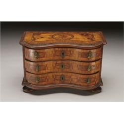 CONTINENTAL PARQUETRY INLAID WALNUT MINIATURE SERPENTINE COMMODE, the inlaid moulded top with star motif above three long drawers with drop handles raised on squat bun feet, ht. 8.5" - 21.6 cm., 18th century