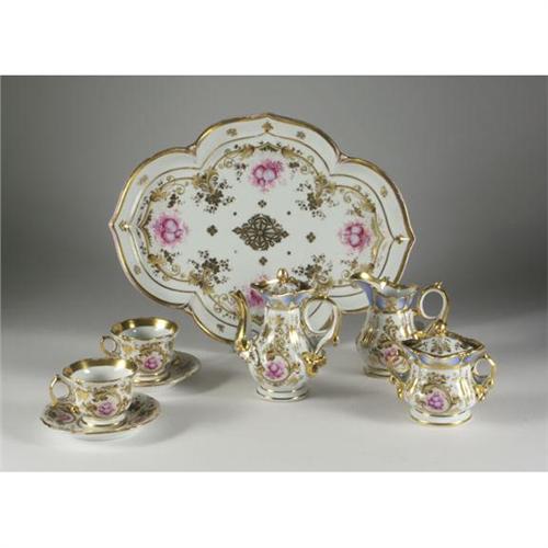 PORCELAIN: A continental porcelain chocolate set with tray to include a chocolate pot 7'' x 6'', a creamer 5.25'' x 5.5'', a sugar bowl with lid 5.5'' x 5.5'', two cups 2.75'' x 3.5'', and saucers, 5.75'', and a large tray, 17'' x 13.5'', hand painted rose and swag motif with gilt detailing, creamer bears an impressed under glaze mark of ''CF2'', unattributed, some wear to gilding commensurate with age, circa late 19th century.