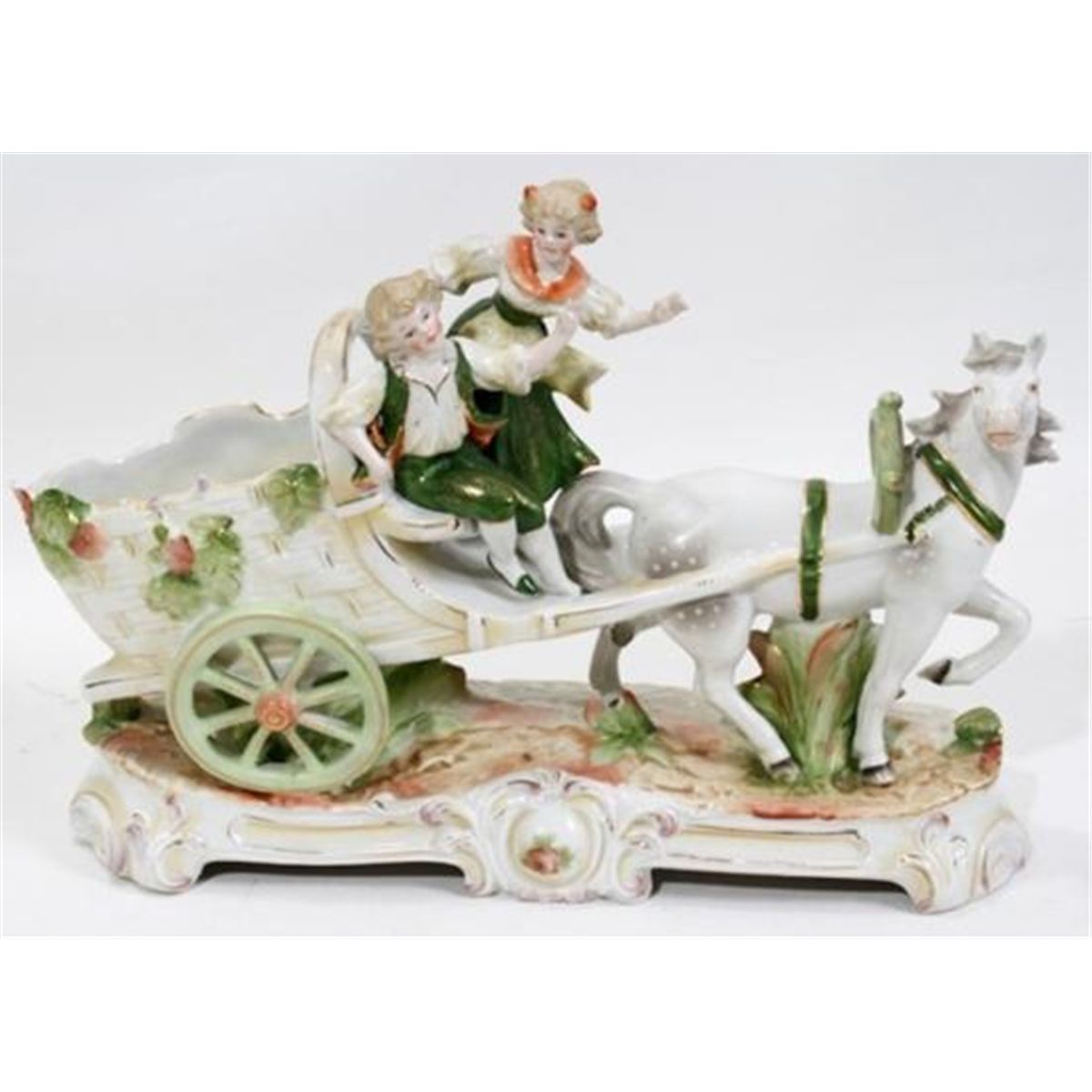 CONTINENTAL PORCELAIN FIGURE PLATEAU, EARLY 20TH C., H 8~, L 10~:In the form of children seated on a cart pulled by a horse; hand-painted accents. RP210