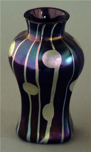 CONTINENTAL PURPLE ART GLASS VASE pale blue/silver line and dot decoration, 5 1/2" high