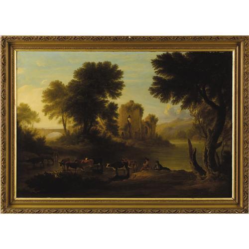 <B>CONTINENTAL SCHOOL</B></I> (Late Eighteenth Century)<BR><I>Landscape</B></I><BR>Oil on panel<BR>32-1/4 x 47-1/2 inches (82 x 121 cm)<BR>Unsigned<BR><BR>A large scale extensive landscape depicting two boys at the river's edge, cows at left and center wading in the river which flows right around an island with an abandoned building, curving back to the left with sandy banks and sloping mountains in the background. <B>Condition Report:</B> Normal signs of wear as appropriate with age, with minor losses at edges due to framing.<BR><BR><b>Shipping:</b> Requires 3rd Party Shipping (<a target="_blank" href="http://www.heritageauctions.com/common/shipping.php">view shipping information</a>) <BR><BR><B>Importa
