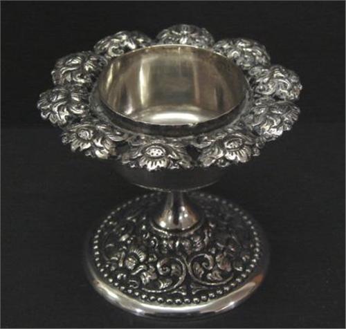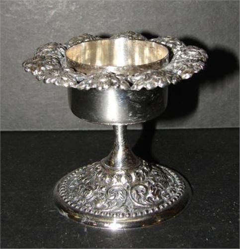 SMALL CONTINENTAL SILVER CANDLEHOLDER. Has figural floral ring around exterior of top with relief floral decorated base. 2.5” H