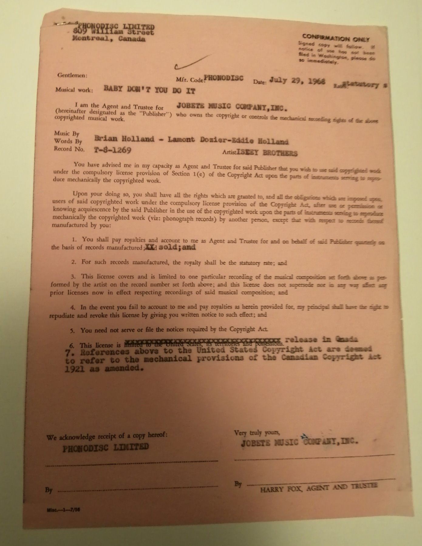 A contract for royalties between Jobete music company inc and the Isley Brothers agent for the song 'Baby don't you do it' released in 1968.