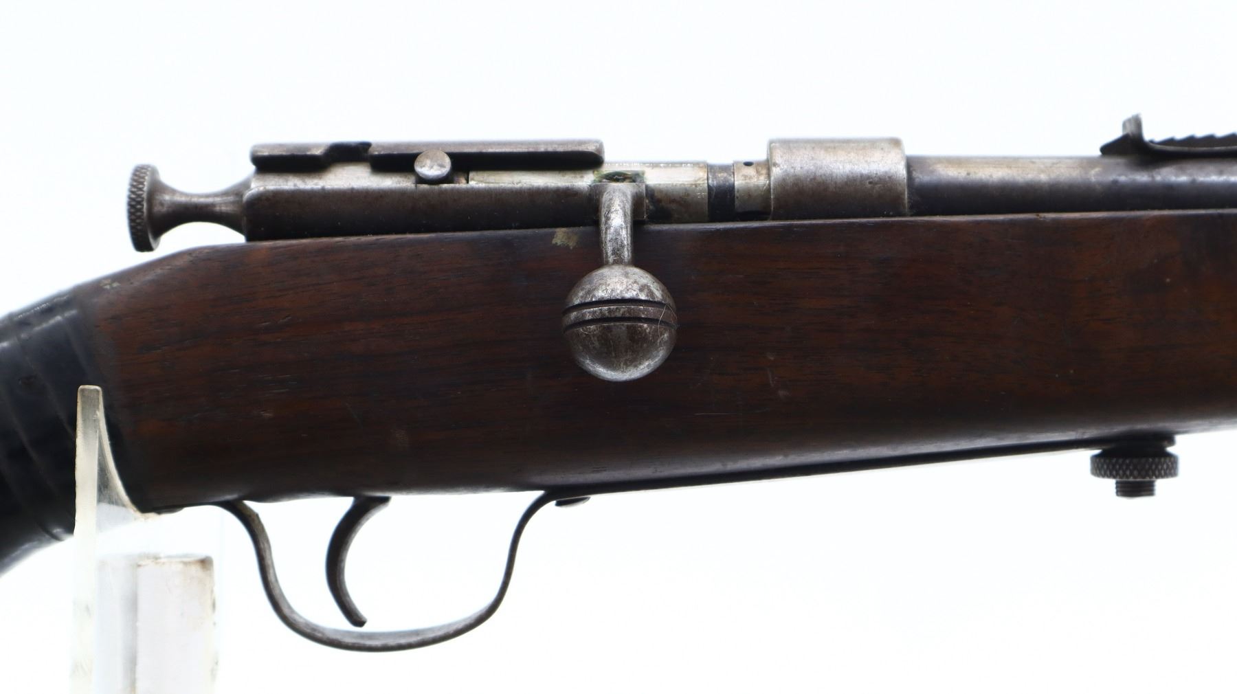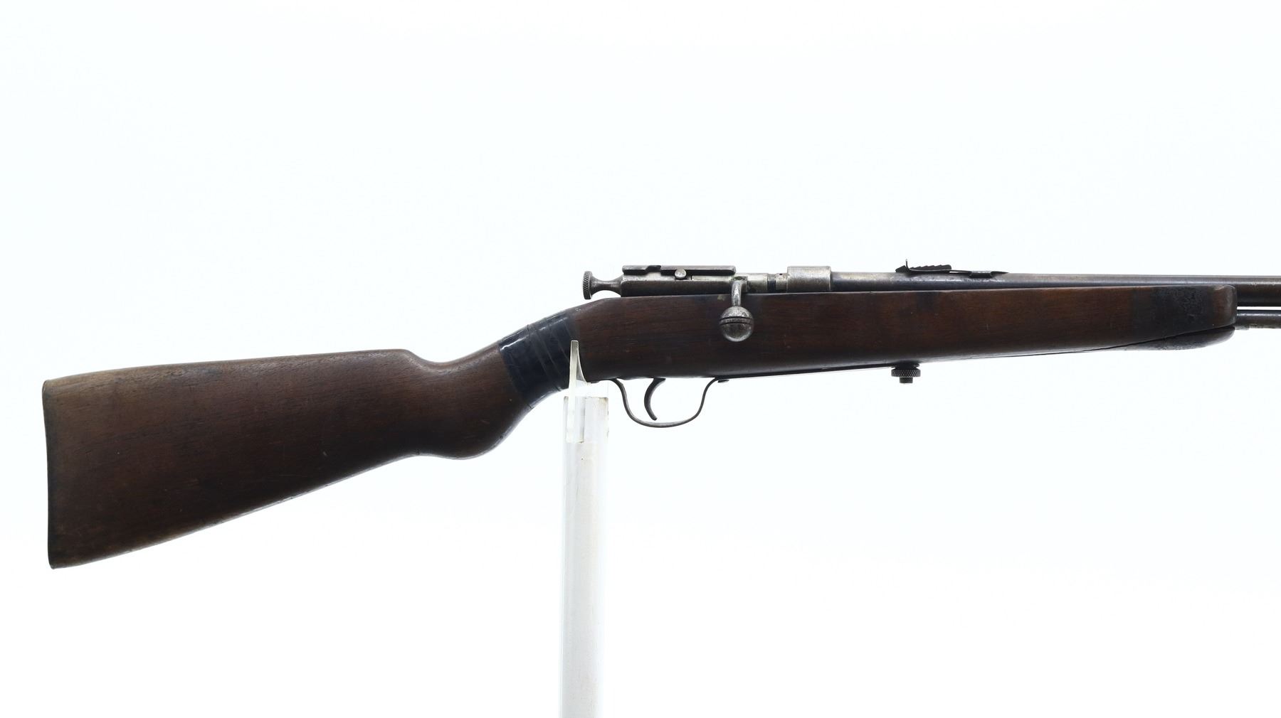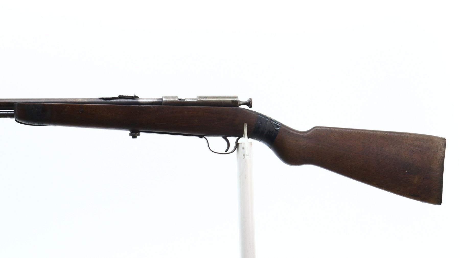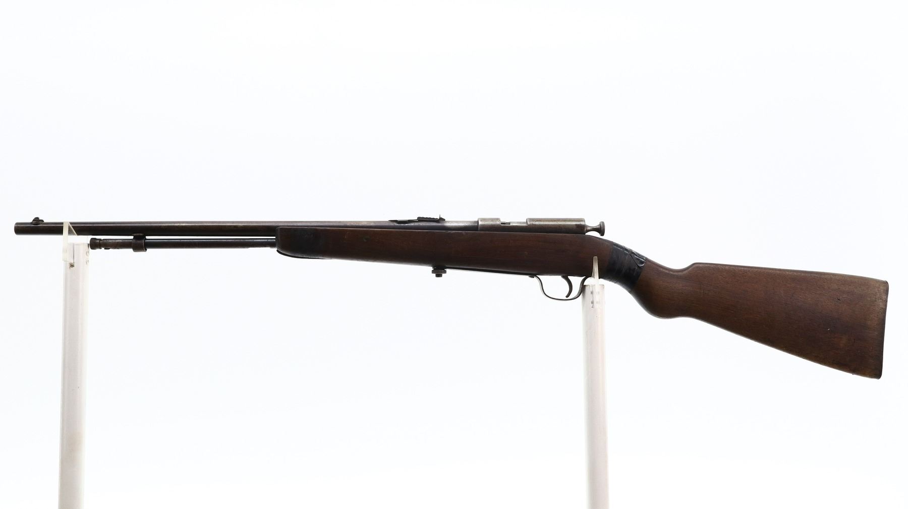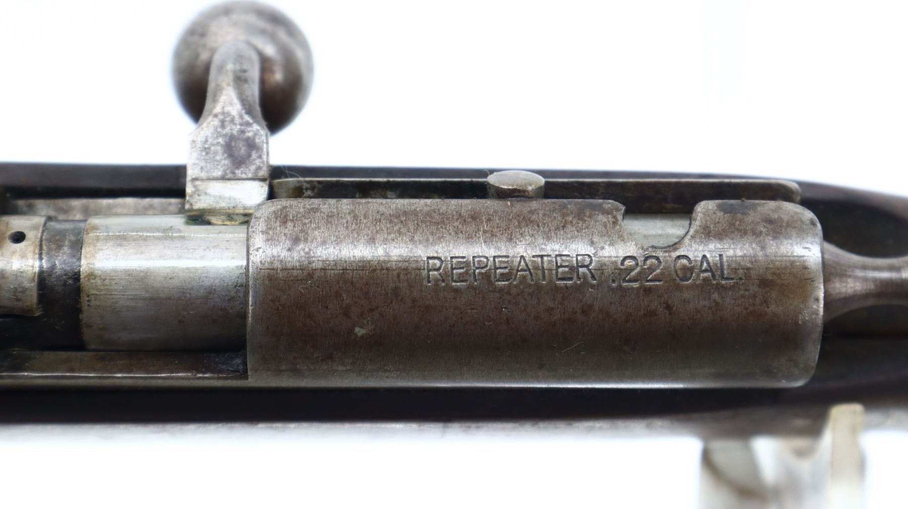 2+/10, COOEY, MODEL: REPEATER, CALIBER: 22 LR, BORE IS FAIR, LIGHT PITTING. BLADE FRONT SIGHT, ADJUSTABLE U NOTCHED REAR SIGHT. ONE PIECE SMOOTH WOOD STOCK, FOREARM CRACKED, PISTOL GRIP, CRACKED AND REPAIRED WITH TAPE, SMOOTH STEEL BUTT PLATE. METAL FINISH TURNING BROWN WITH PITTING, RUST, HANDLING MARKS AND WEAR. STOCK SHOWS MARKS, SCRATCHES AND WEAR. , ACTION: BOLT ACTION RIFLE, BARREL LENGTH: 20", SERIAL# NA, CONDITION: 2+/10, CLASS: CANADIAN NON RESTRICTED
