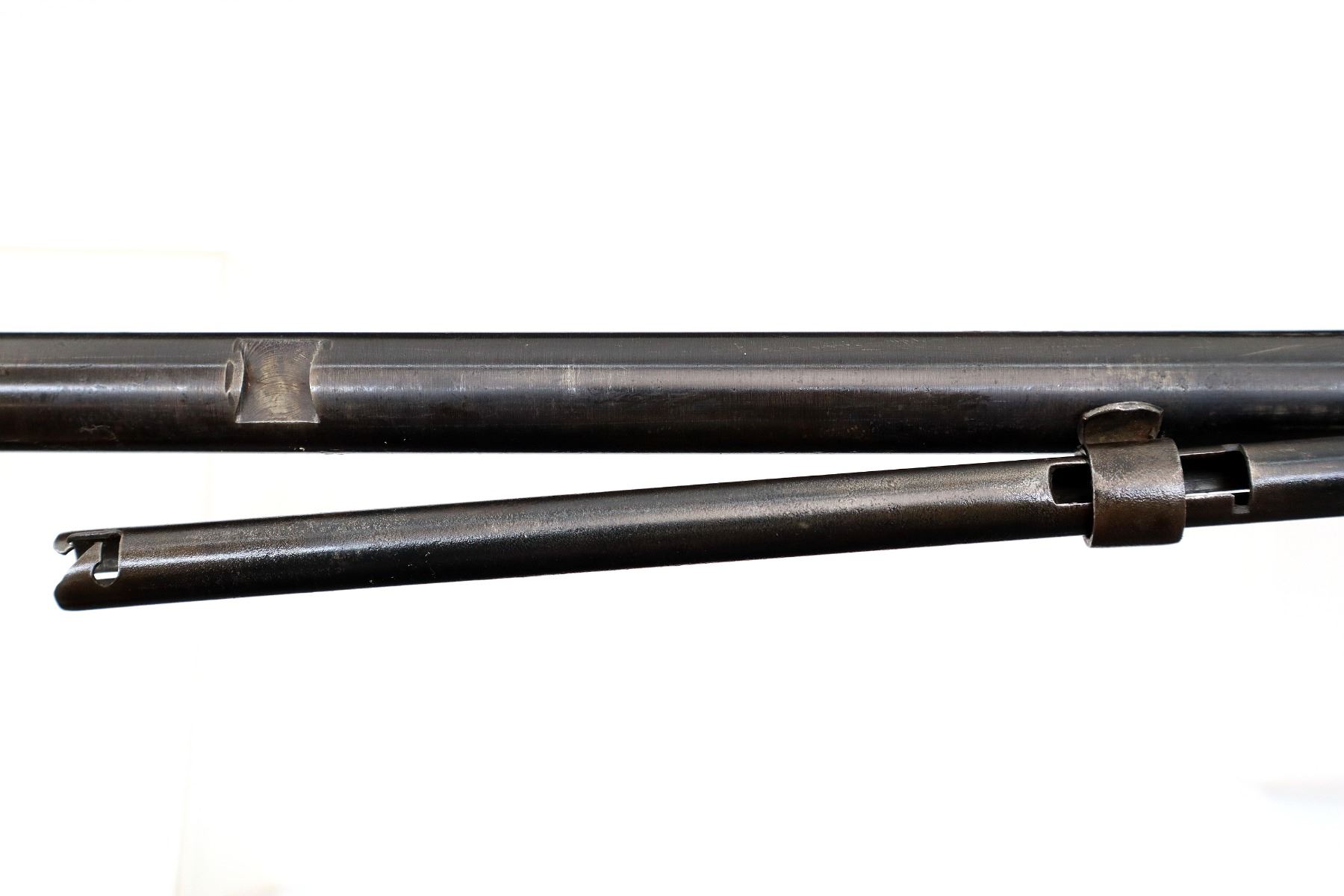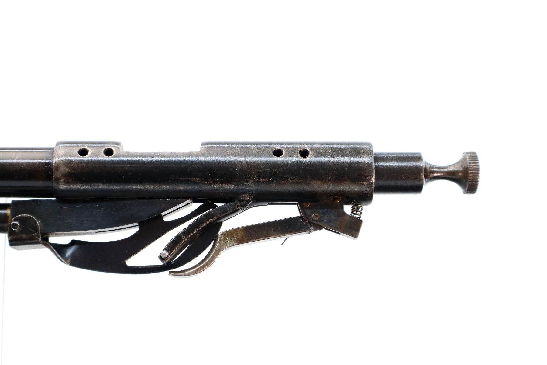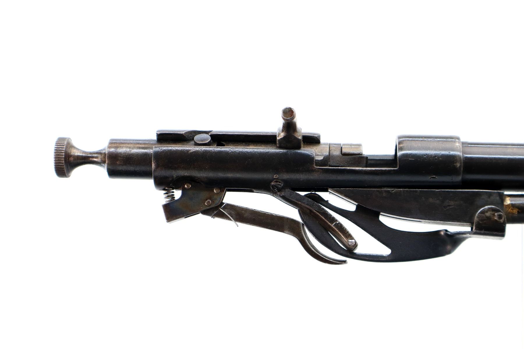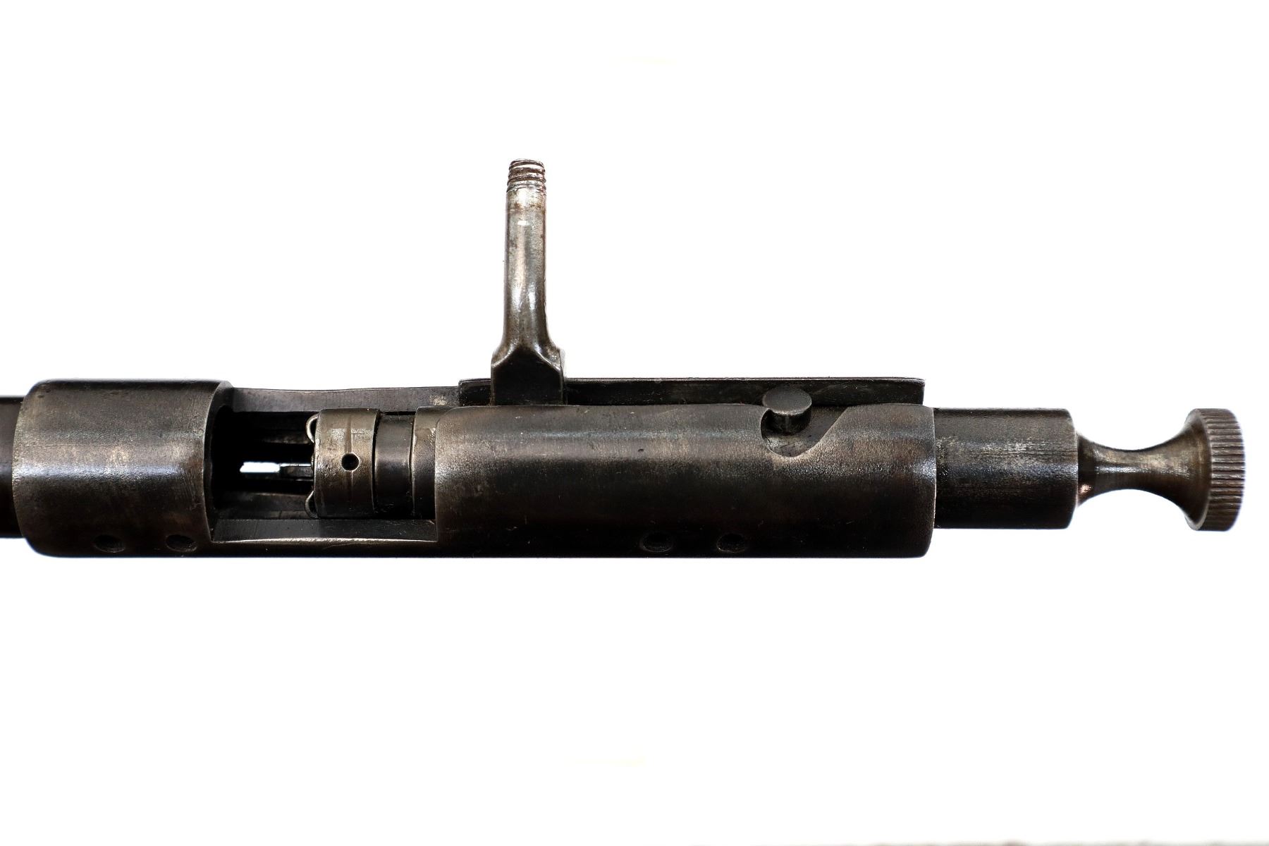 Main Description: Missing front sight, bolt knob, inner magtube and stock assembly. Has a u notched rear sight, receiver drilled and tapped with no plug screws installed, trigger with sear and outer magtube.