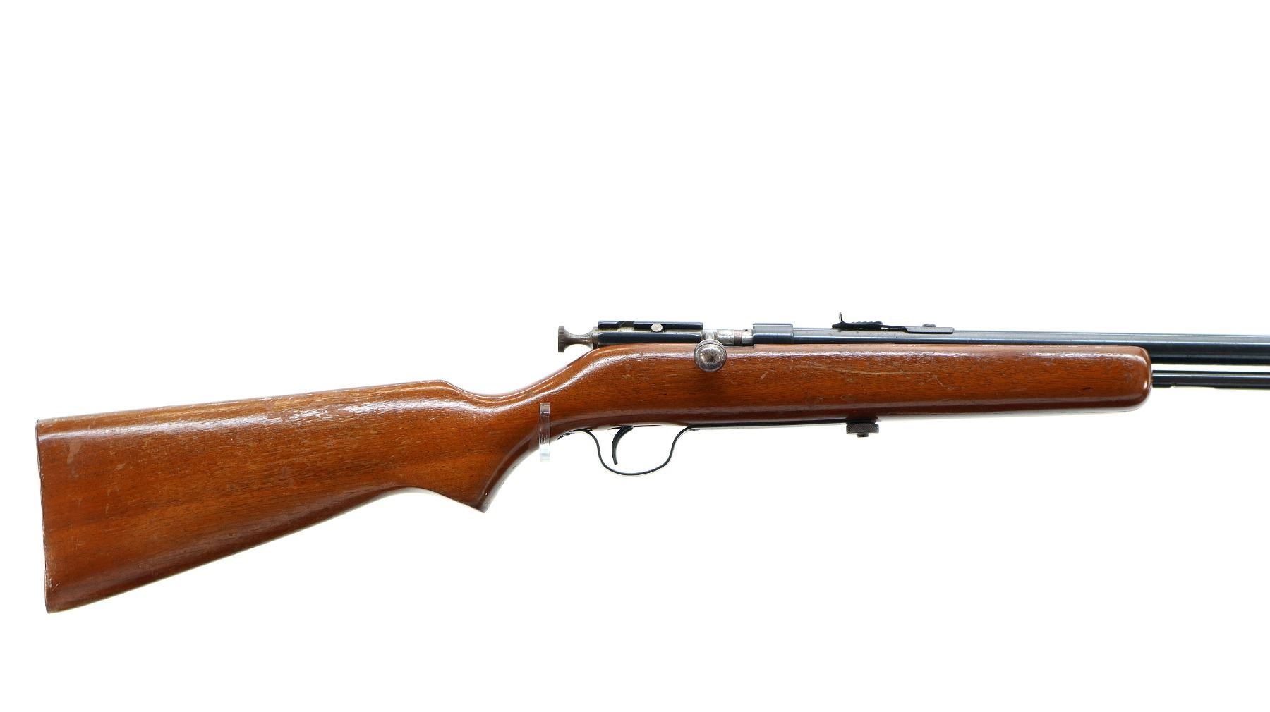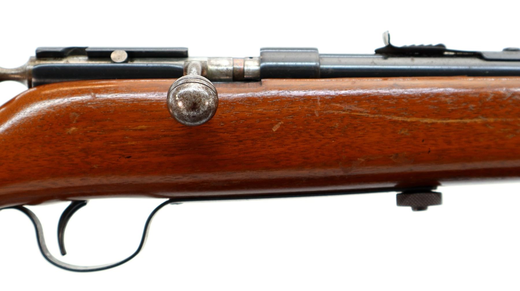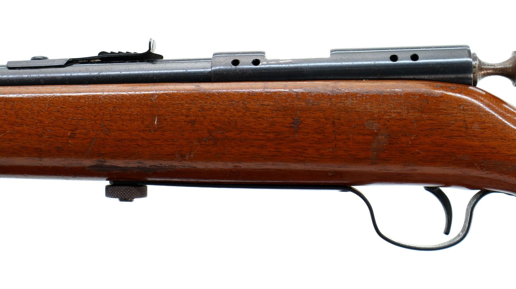 Main Description: Blade front sight, adjustable u notched rear sight, blued finish, receiver drilled and tapped with no plug screws installed, grooved bolt knob. One piece wood stock, forearm is cracked, pistol grip, smooth steel butt plate.