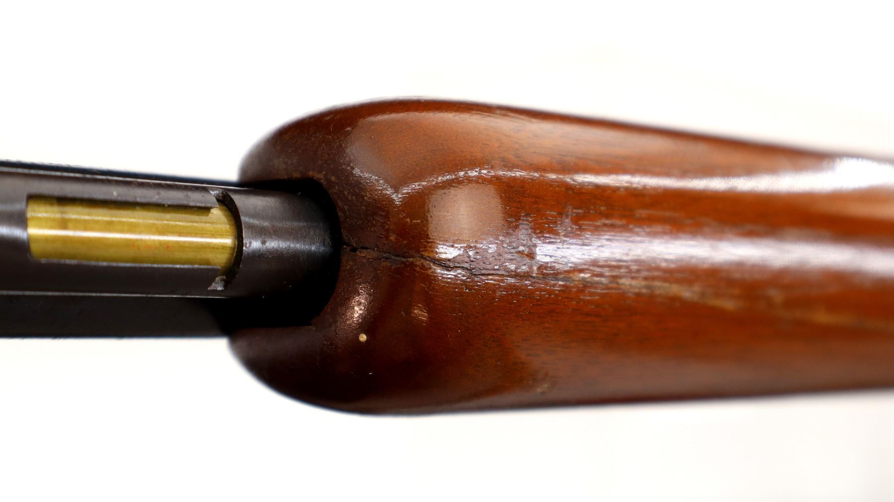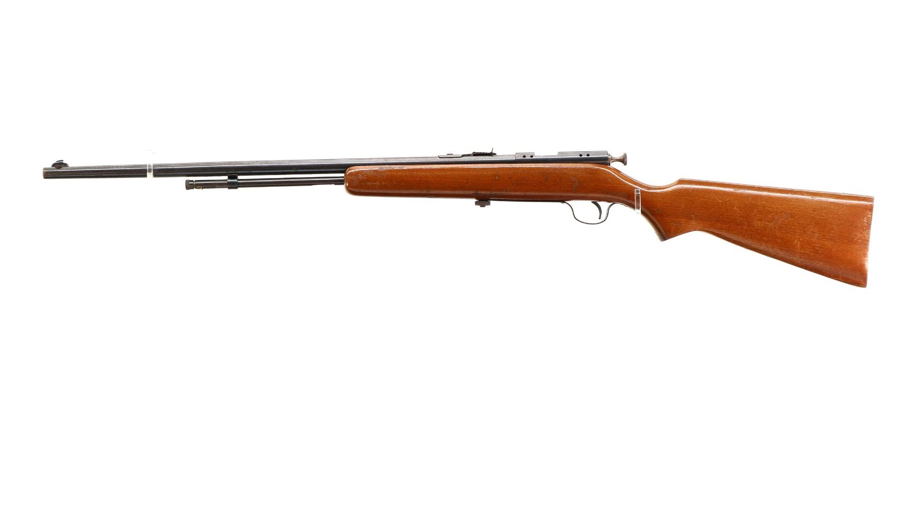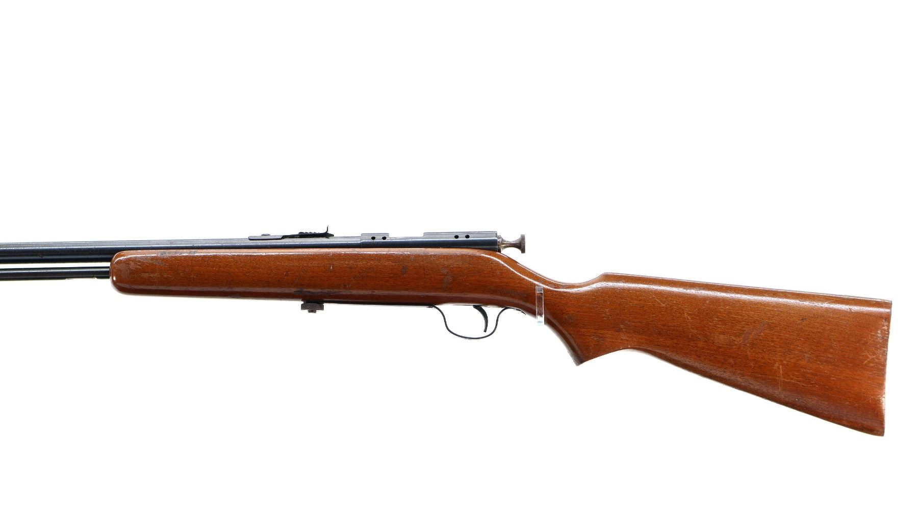 Main Description: Blade front sight, adjustable u notched rear sight, blued finish, receiver drilled and tapped with no plug screws installed, grooved bolt knob. One piece wood stock, forearm is cracked, pistol grip, smooth steel butt plate.