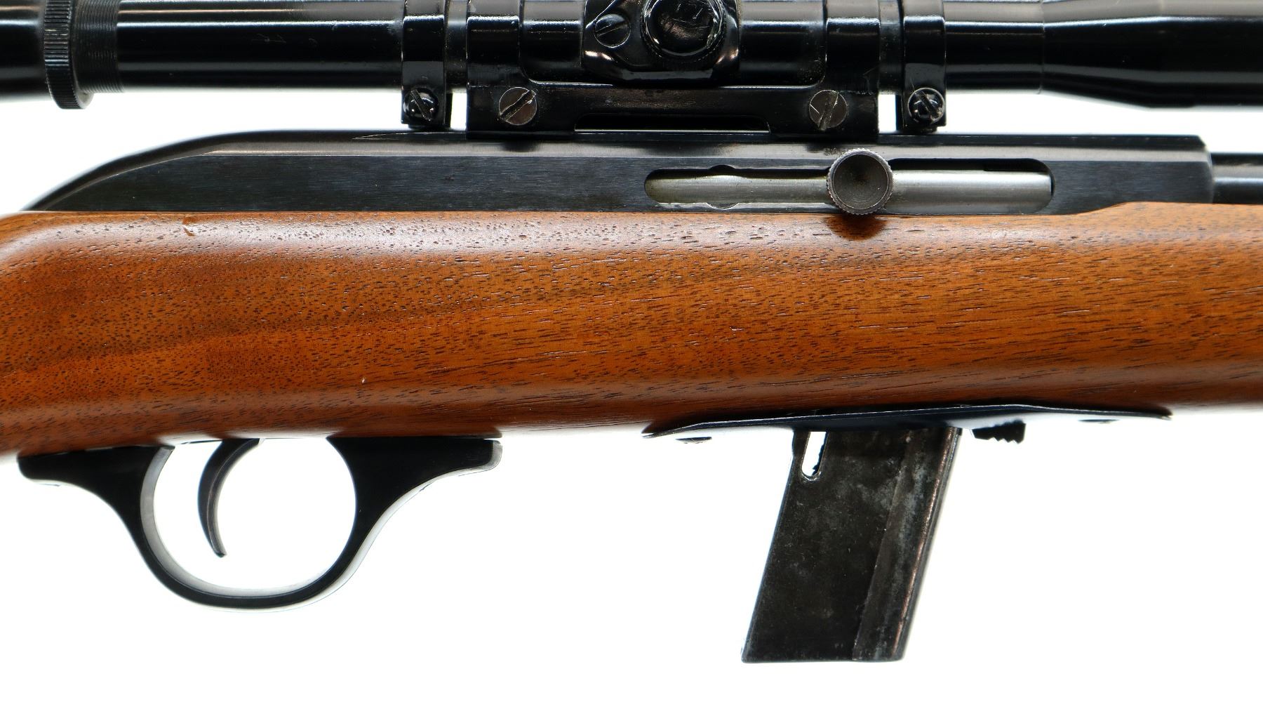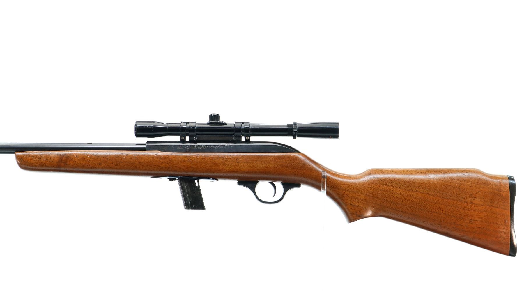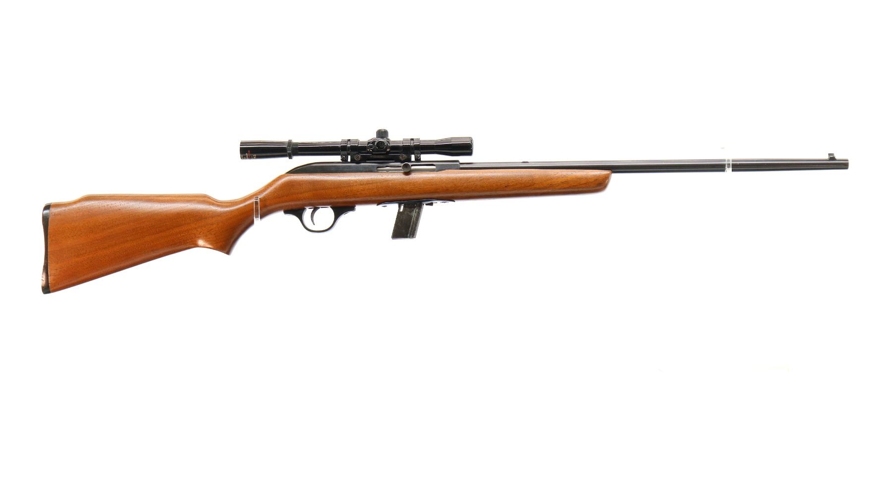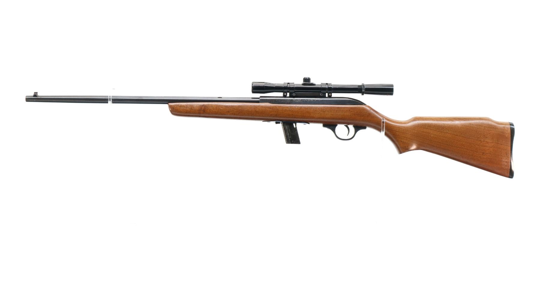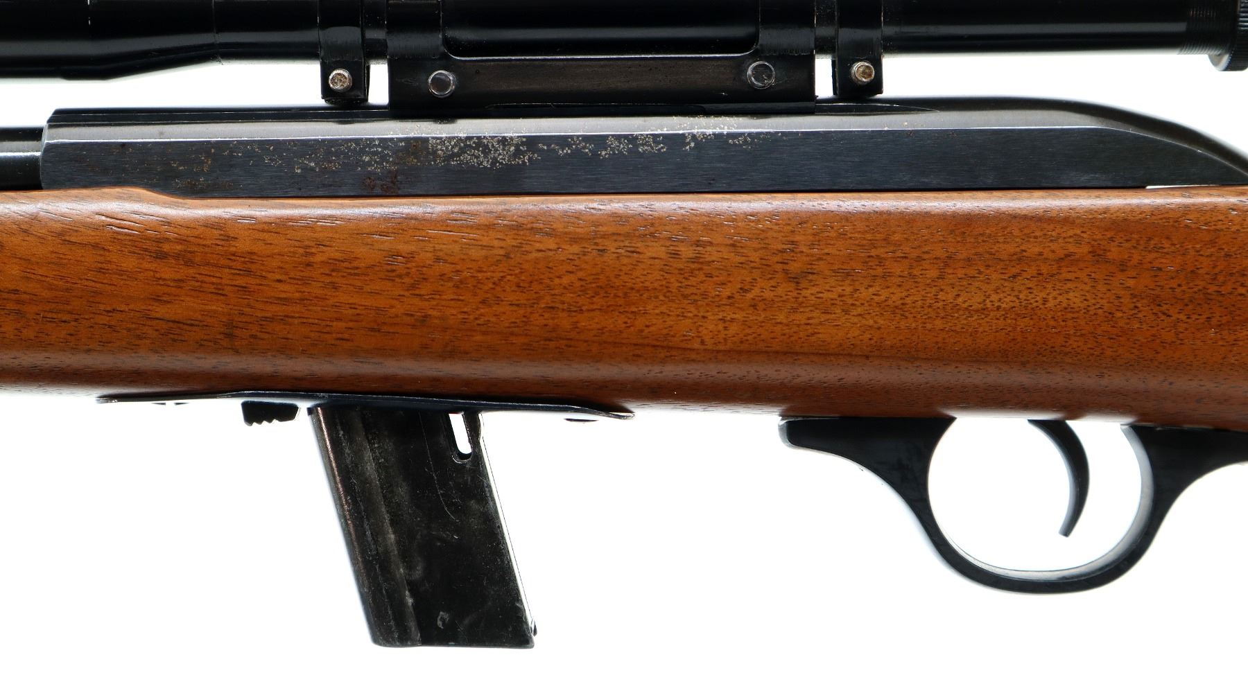 Main Description: Blade front sight, missing rear sight dovetail present, grooved receiver with Tasco 4x20 scope installed, clear optics with fine crosshair. One piece wood stock, pistol grip, raised comb, grooved black polymer butt plate
