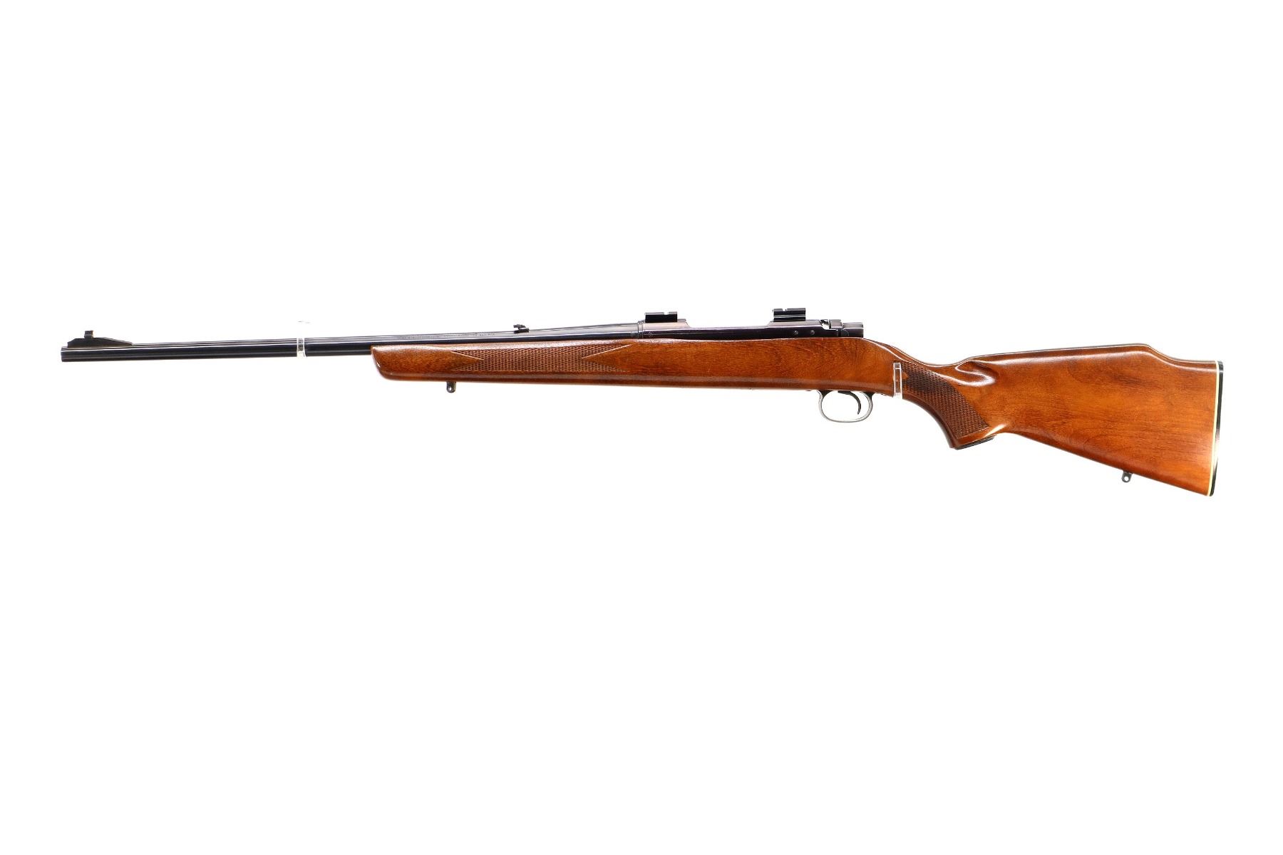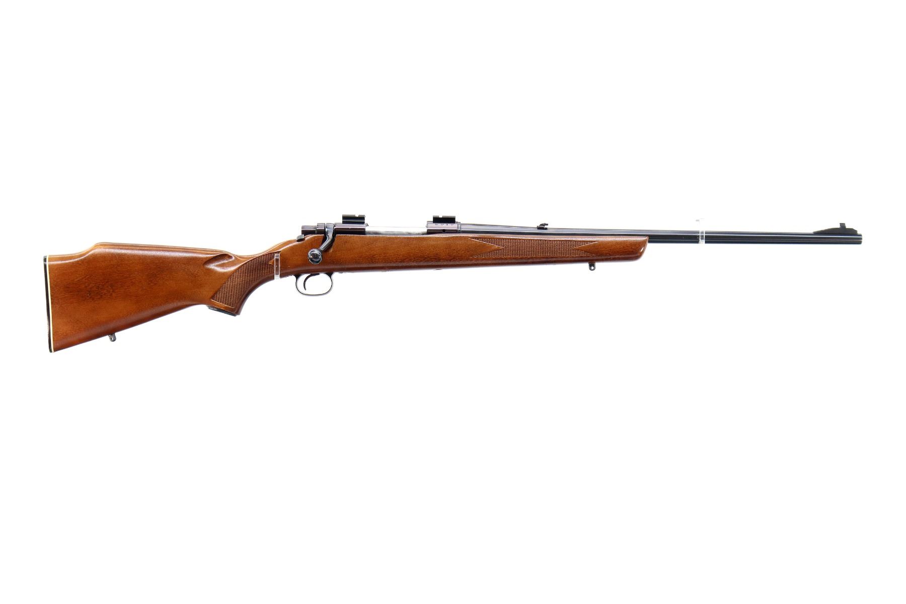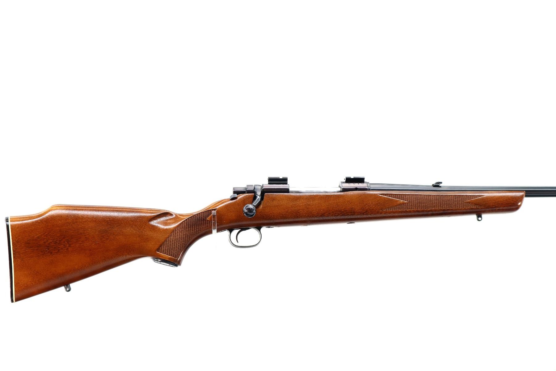 Main Description: Blade front sight with ramp, adjustable folding u notched rear sight, blued finish, receiver drilled and tapped with two piece scope bases installed, smooth bolt knob. One piece wood stock, checkered forearm, pistol grip and black rubber butt plate, small crack on left side of grip, raised comb, steel grip cap, blind magazine and swivel studs.