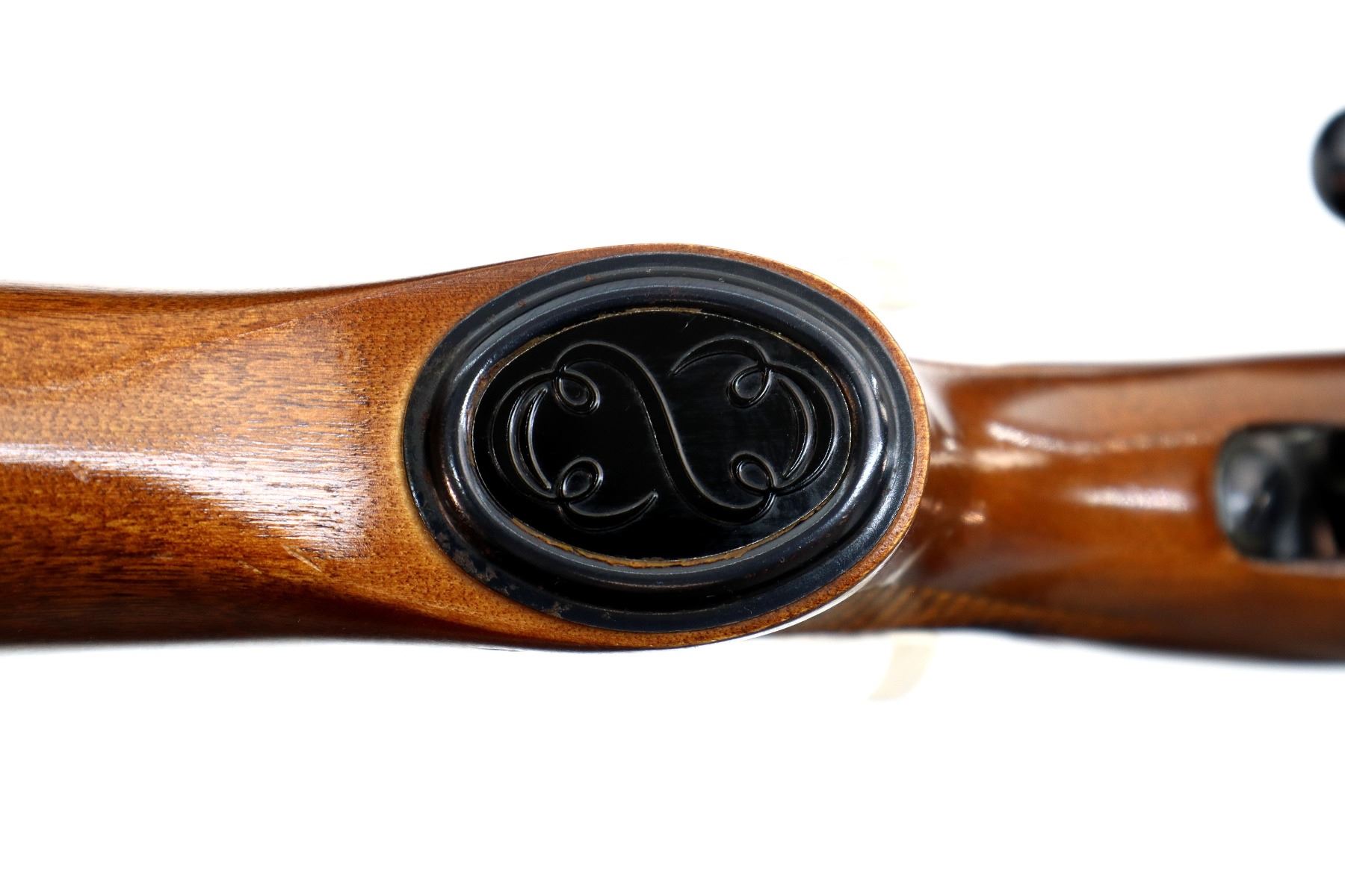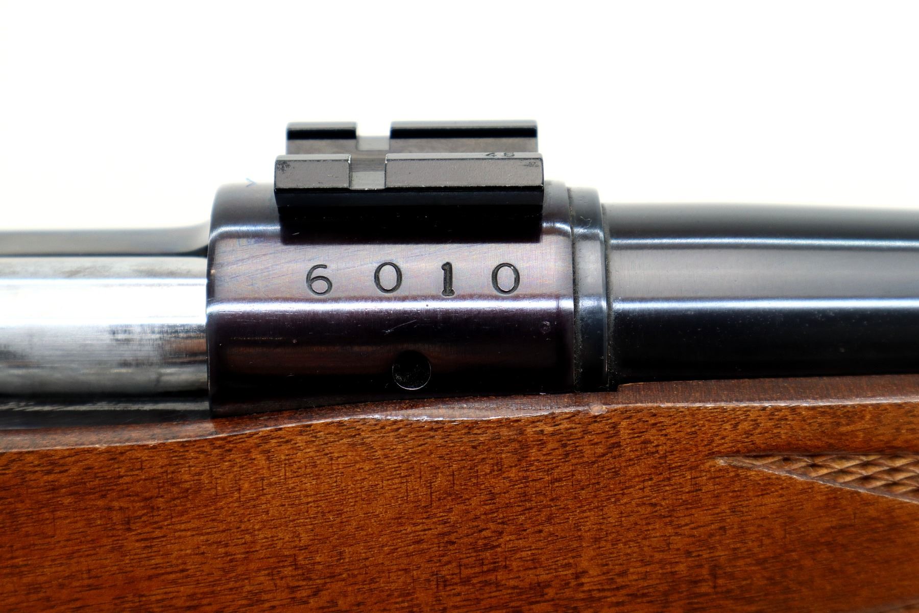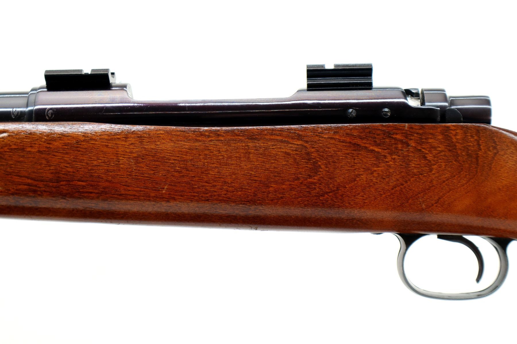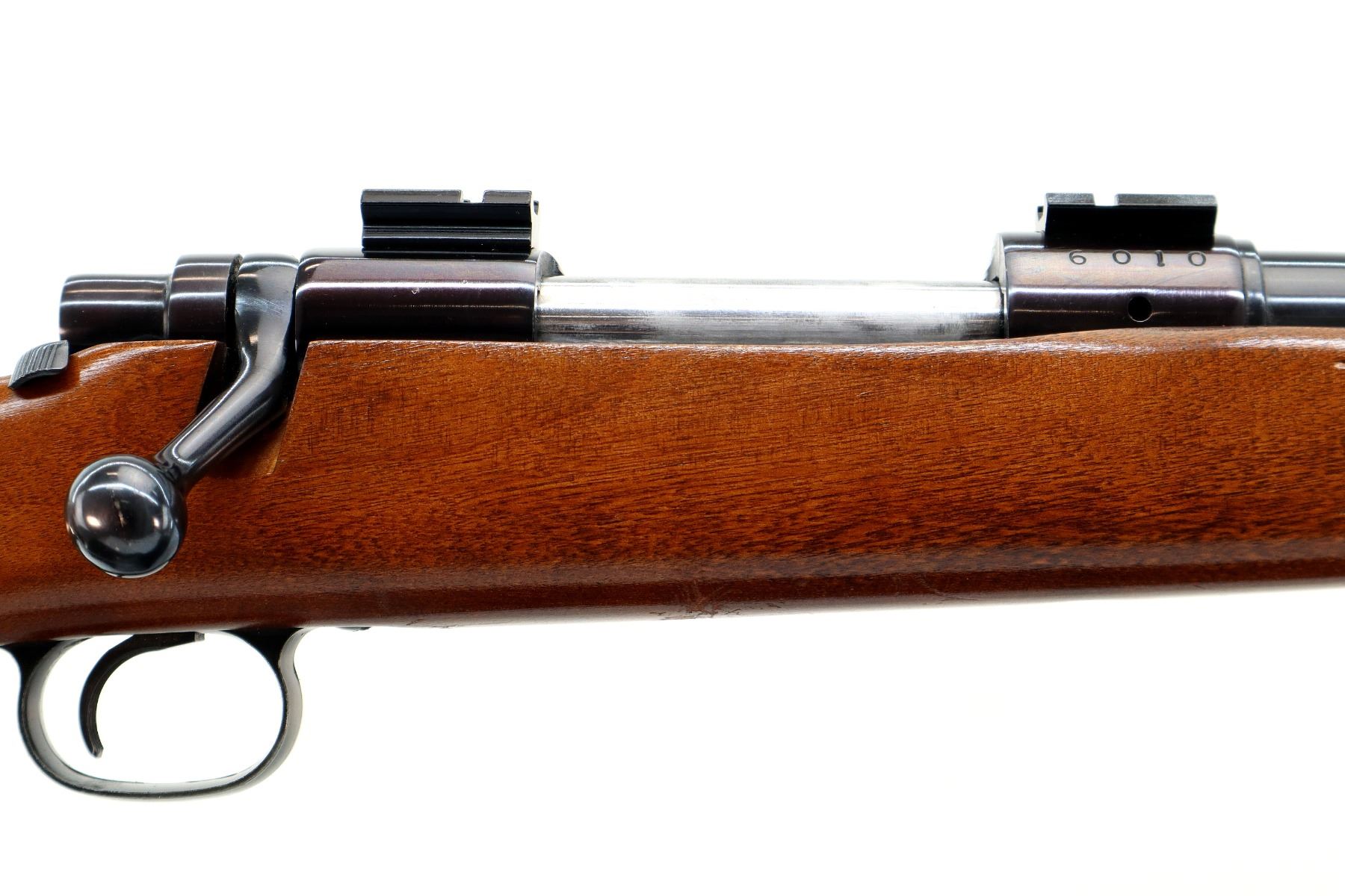 Main Description: Blade front sight with ramp, adjustable folding u notched rear sight, blued finish, receiver drilled and tapped with two piece scope bases installed, smooth bolt knob. One piece wood stock, checkered forearm, pistol grip and black rubber butt plate, small crack on left side of grip, raised comb, steel grip cap, blind magazine and swivel studs.