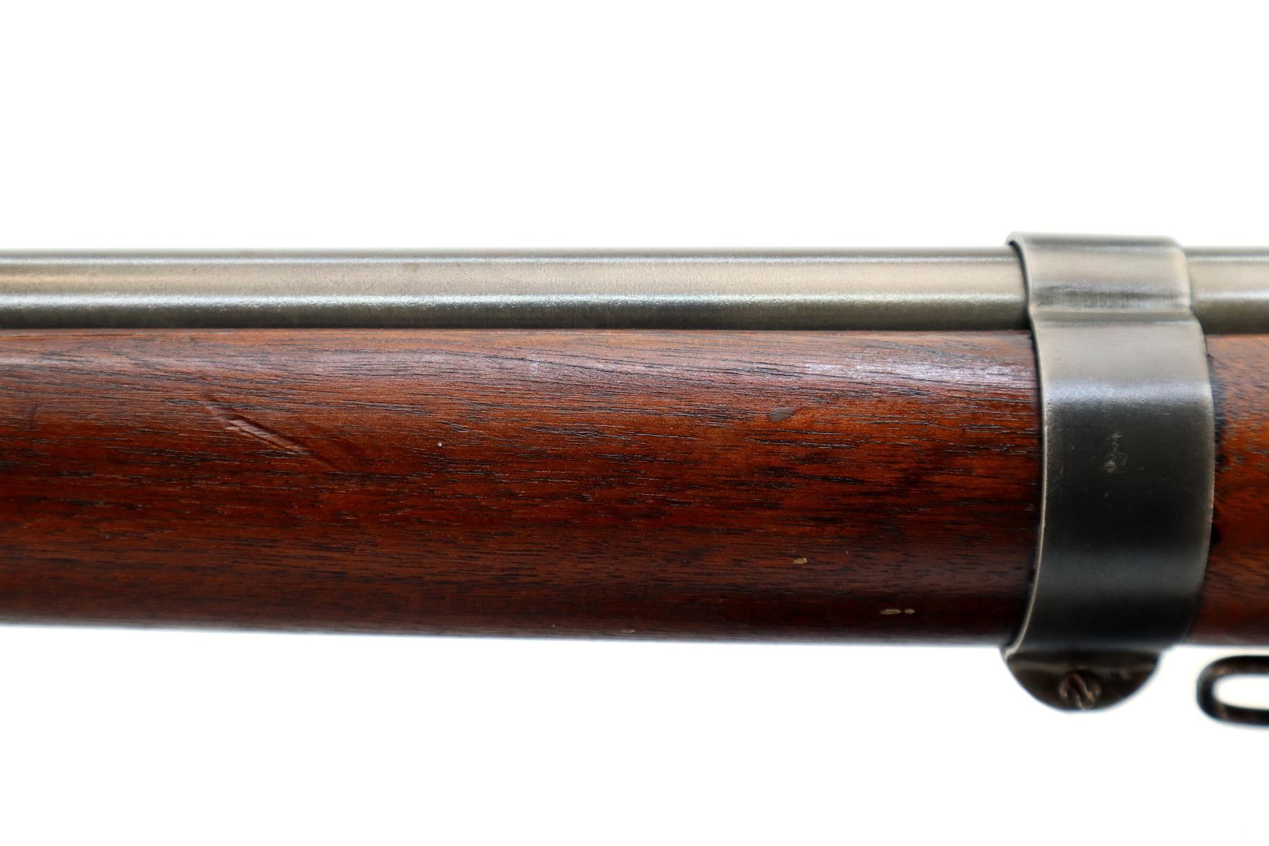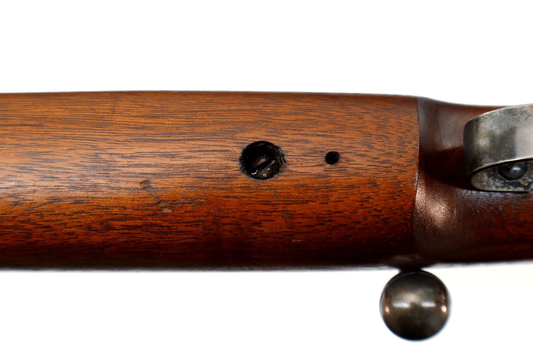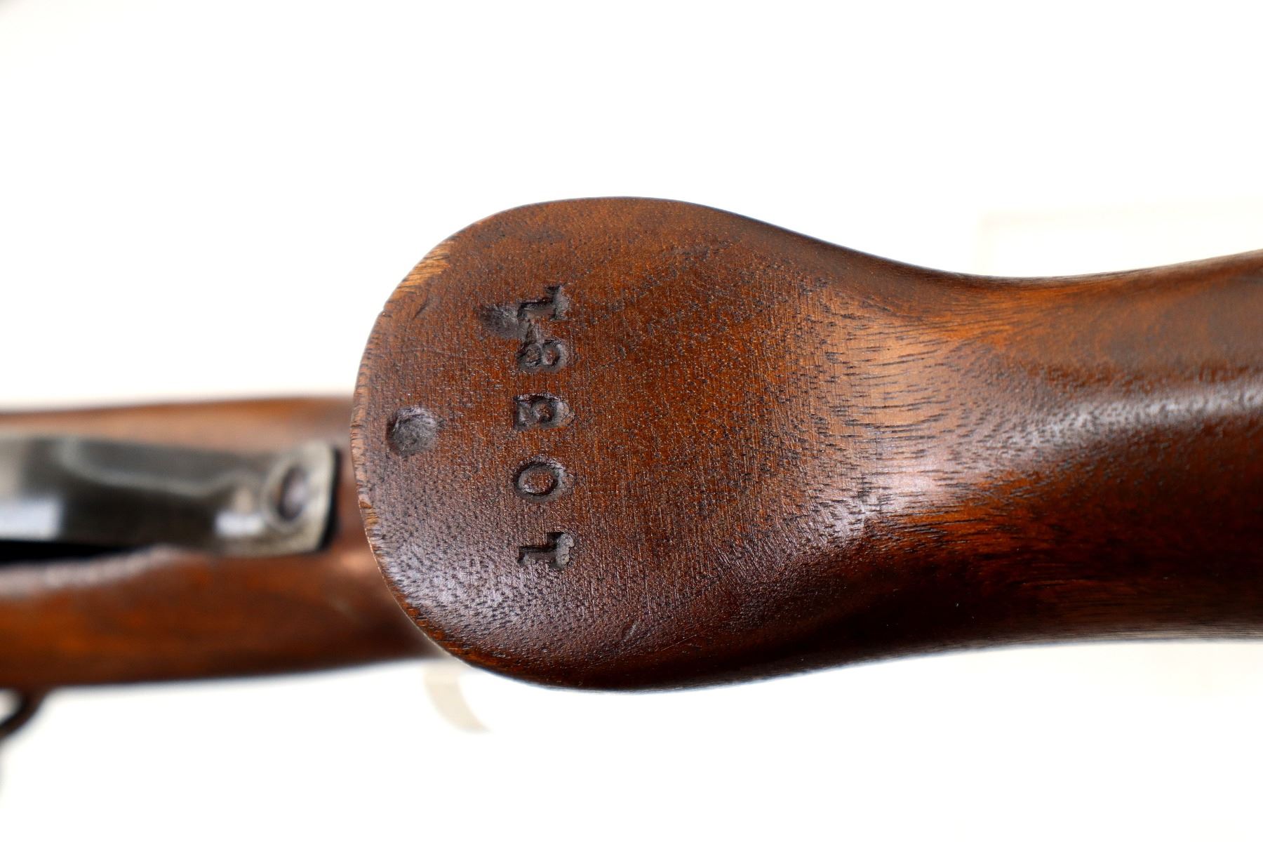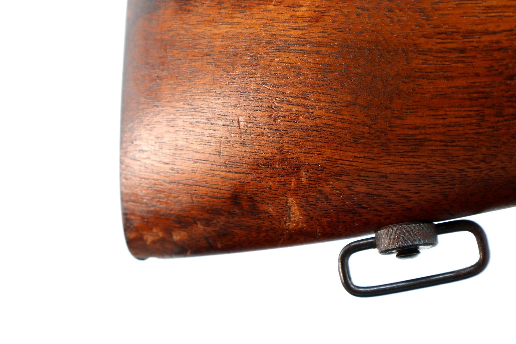 Main Description: Blade front sight, adjustable u notched rear sight, grooved bolt knob, extractor is present. Two piece full military wood stocks, pistol grip, smooth steel butt plate, stock chipped at toe, sling swivels, two barrel bands.