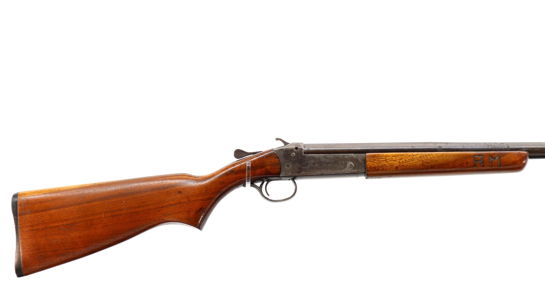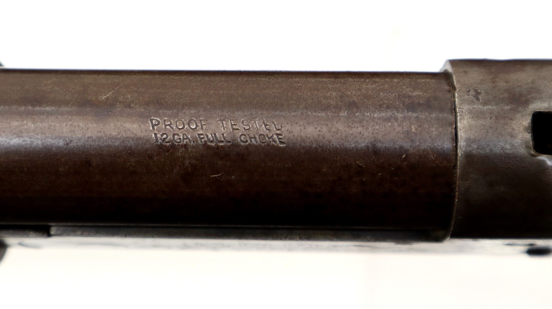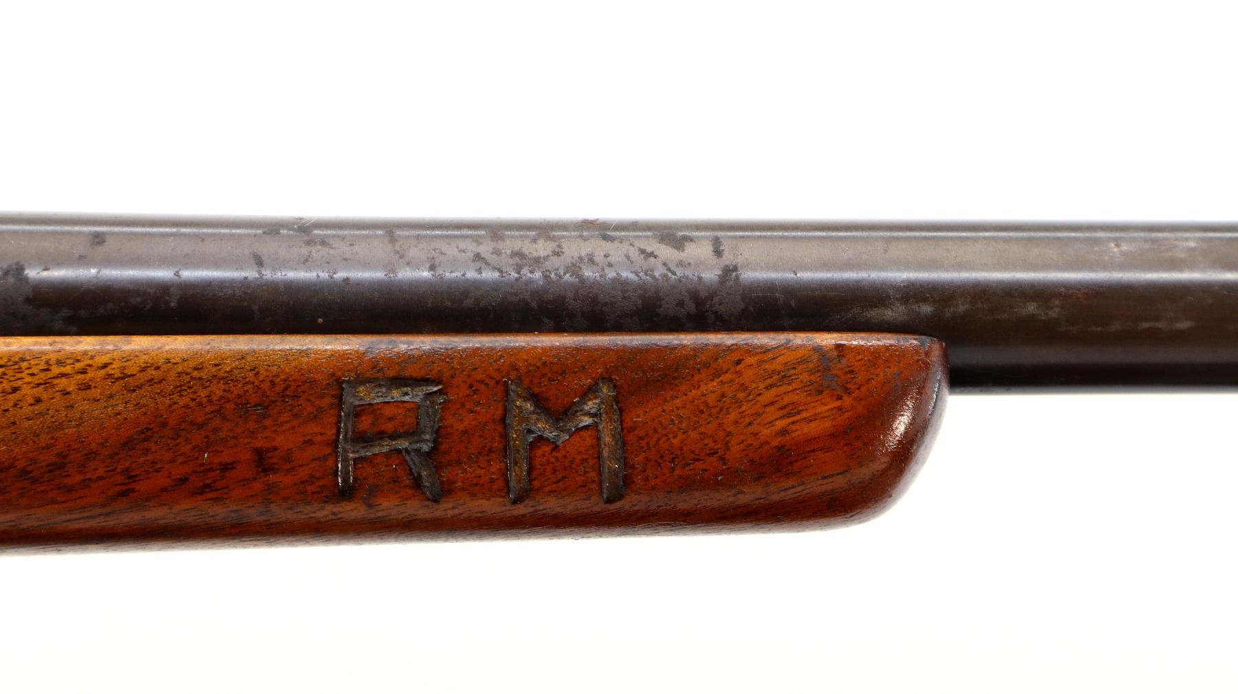 Main Description: Brass bead, round barrel, grooved spur hammer, ejector. Two piece wood stocks, forearm has initials RM on right side, pistol grip cracked behind upper and lower tangs, grooved black polymer butt plate