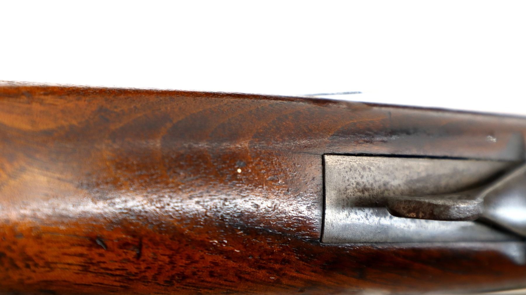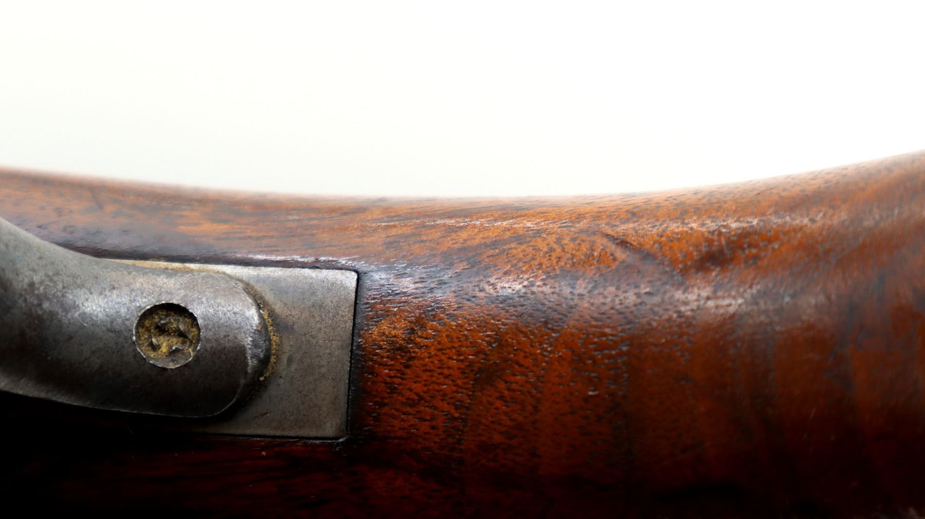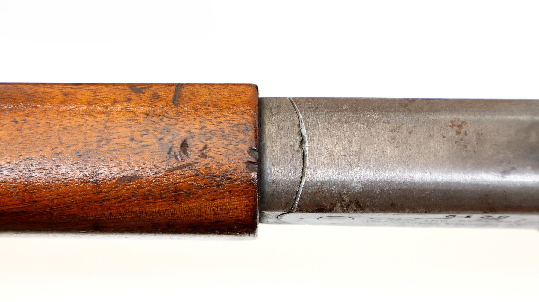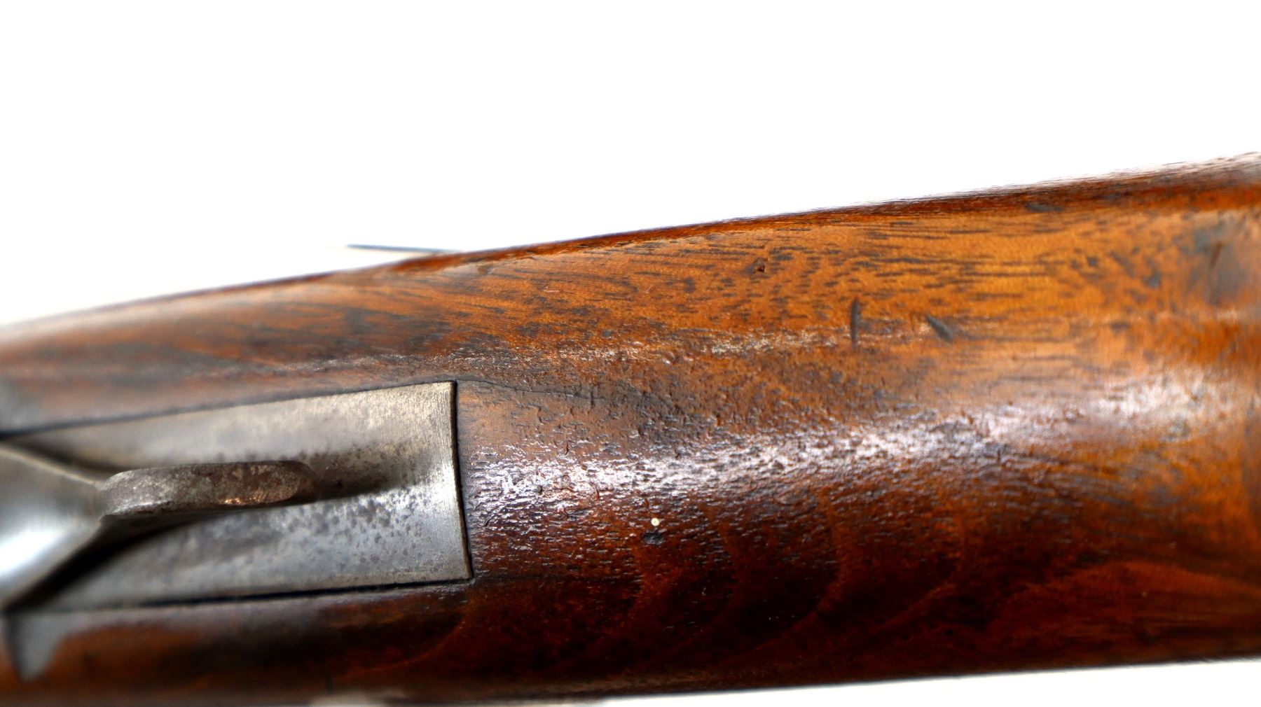Main Description: Brass bead, round barrel, grooved spur hammer, ejector. Two piece wood stocks, forearm has initials RM on right side, pistol grip cracked behind upper and lower tangs, grooved black polymer butt plate