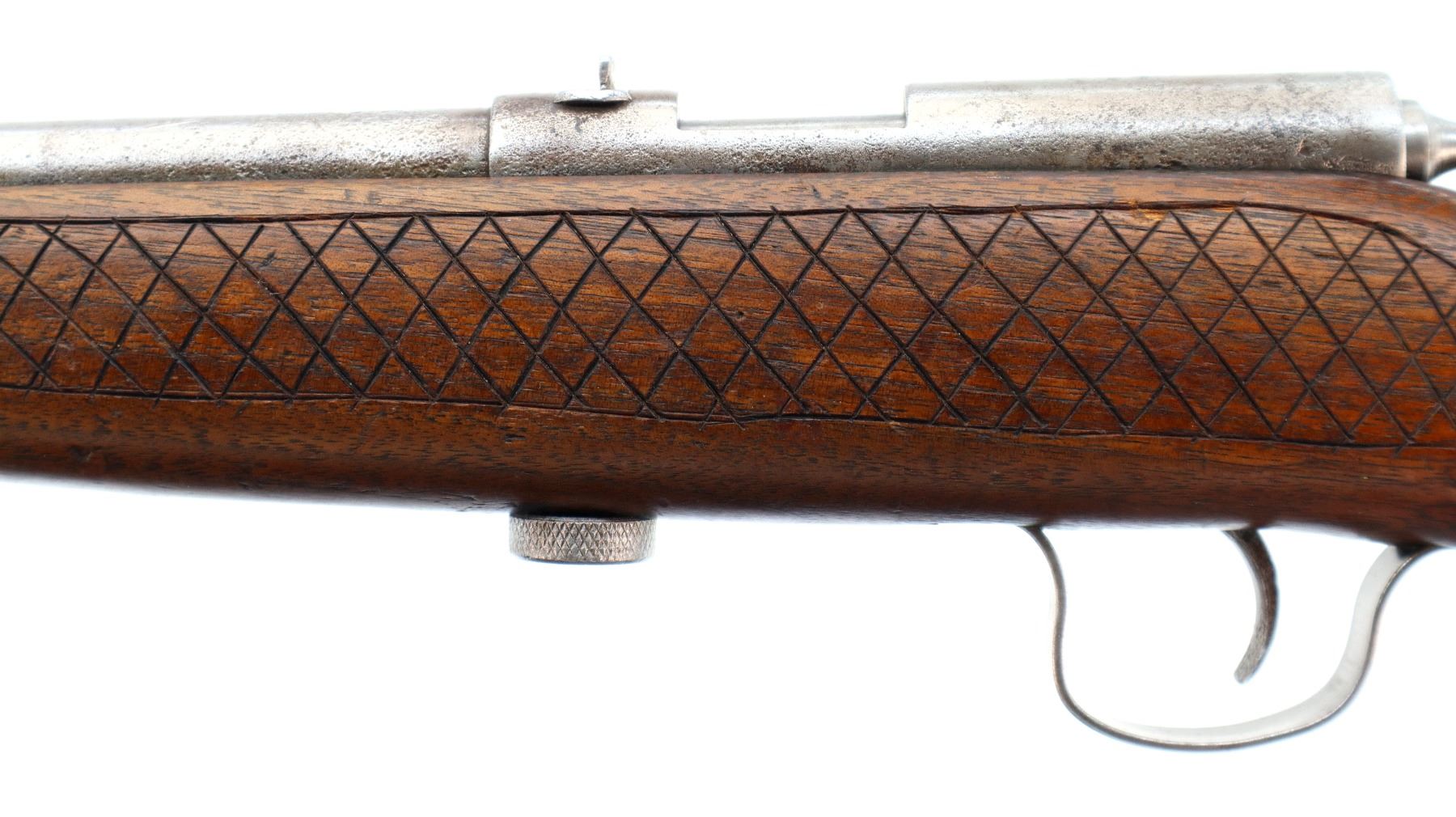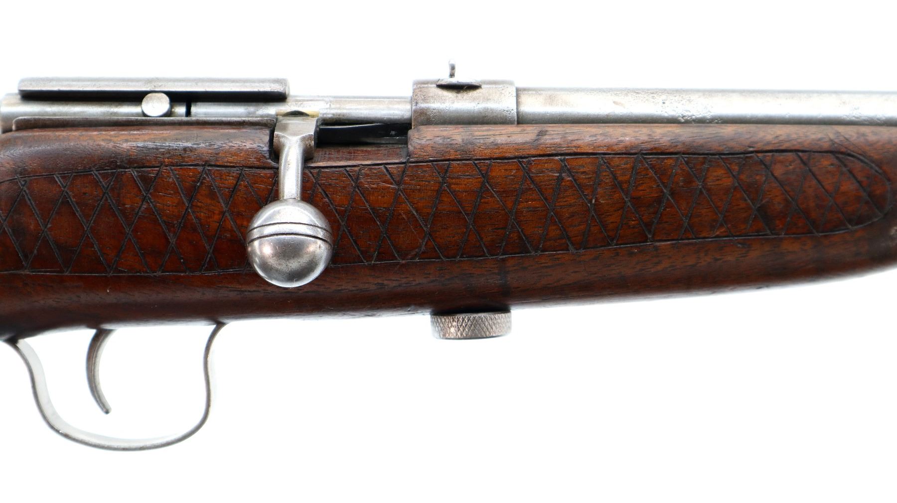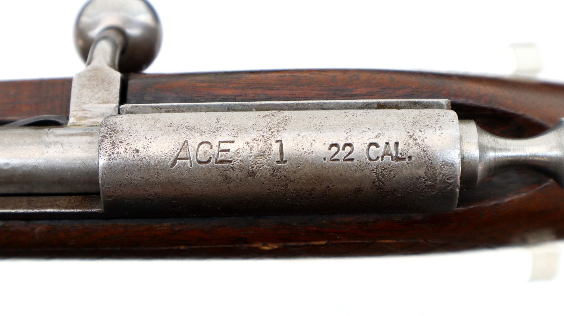 Main Description: Blade front sight, u notched rear sight, large grooved bolt knob, extractor is present. One piece wood stock, custom checkered forearm and pistol grip, smooth butt with two holes.