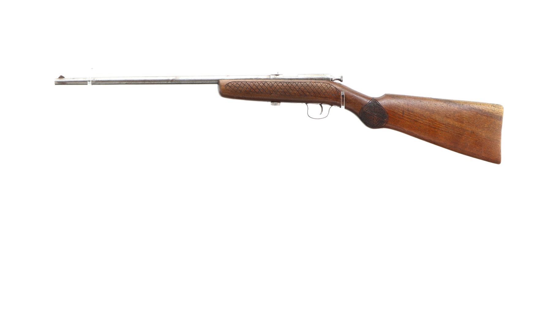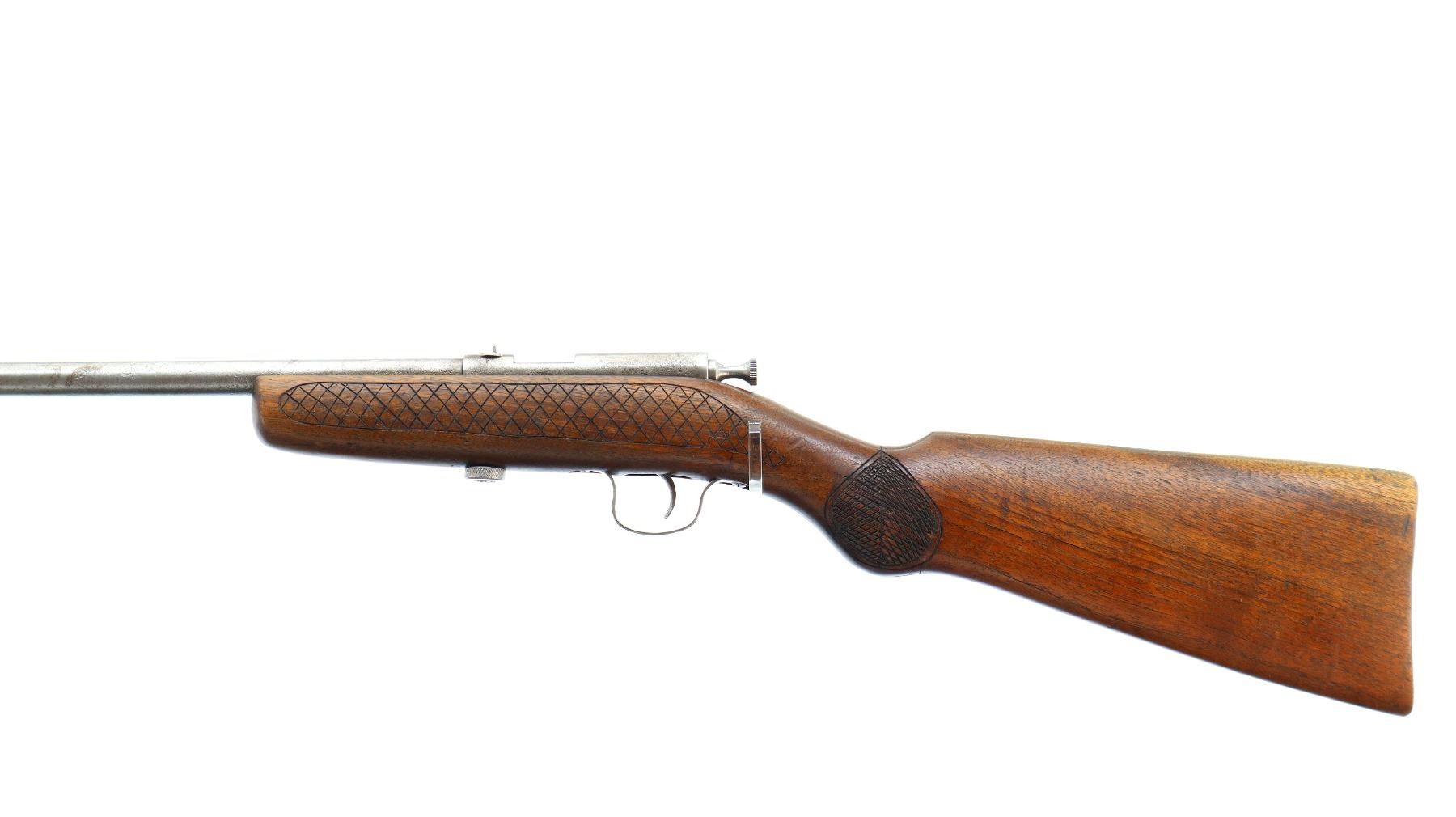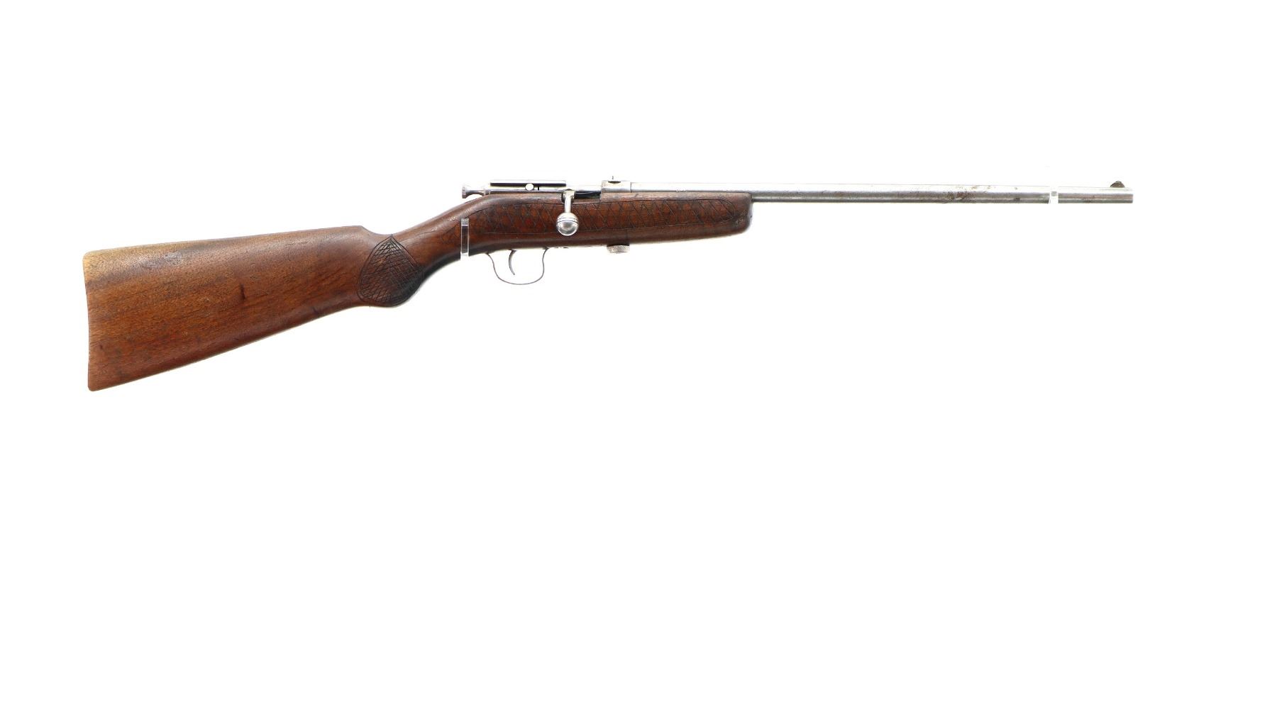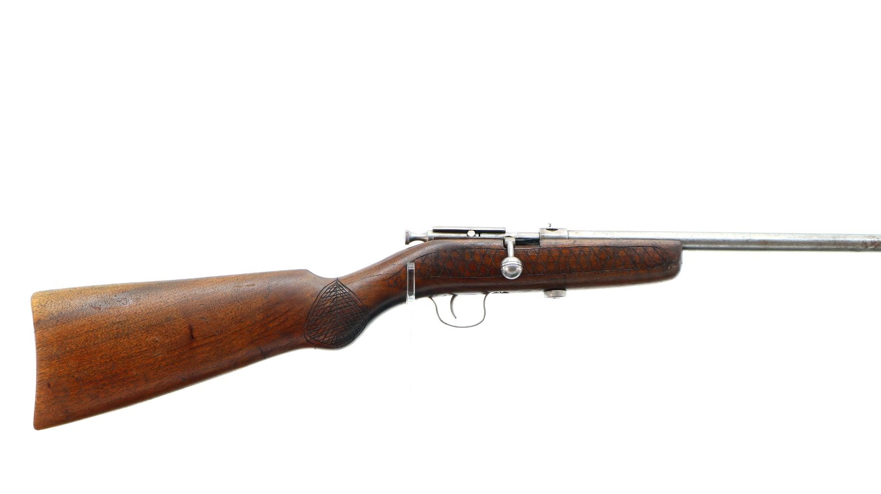 Main Description: Blade front sight, u notched rear sight, large grooved bolt knob, extractor is present. One piece wood stock, custom checkered forearm and pistol grip, smooth butt with two holes.