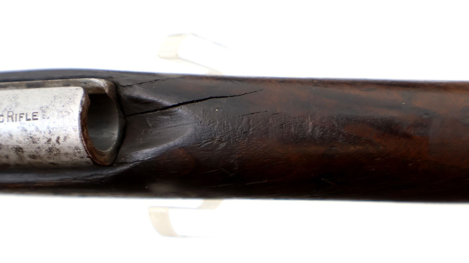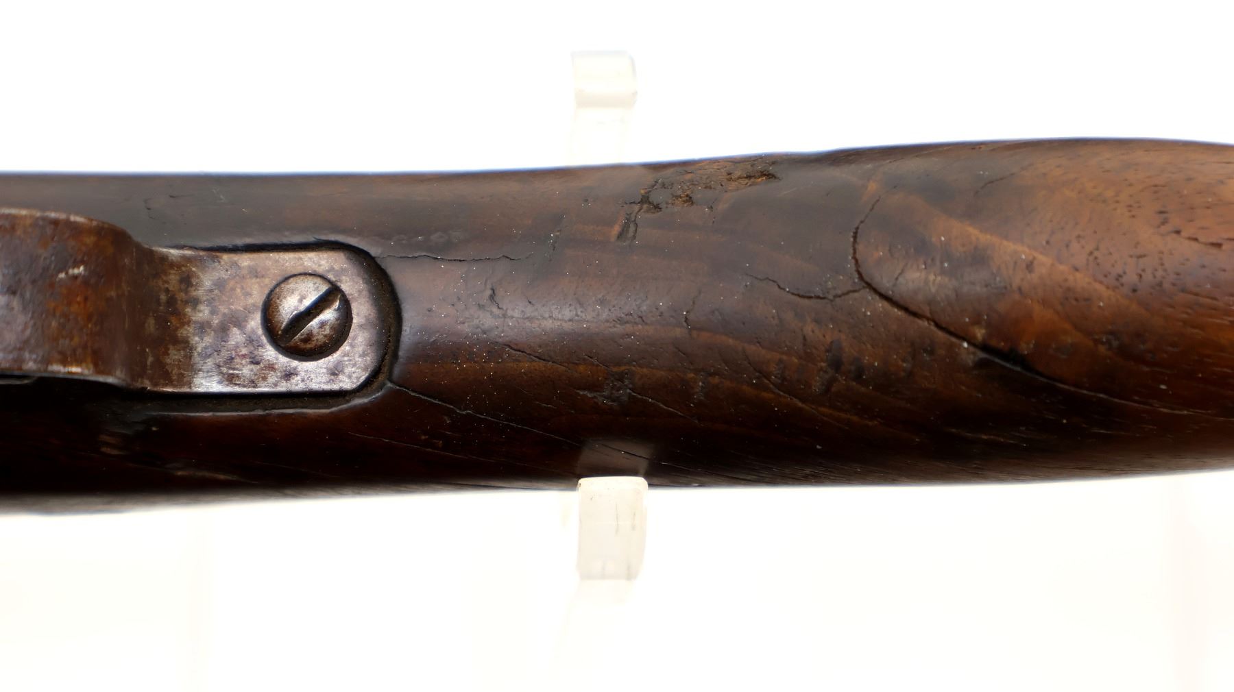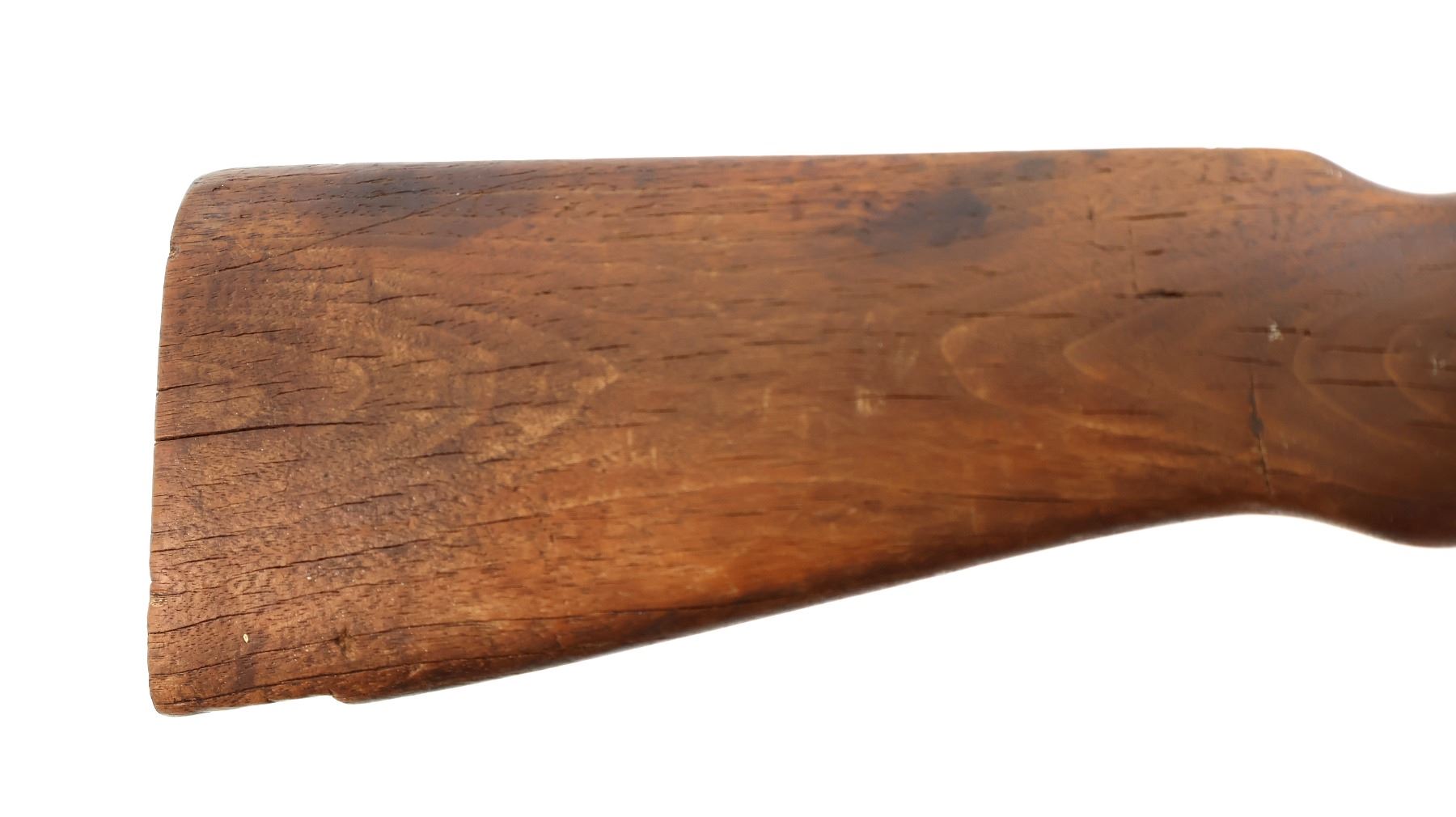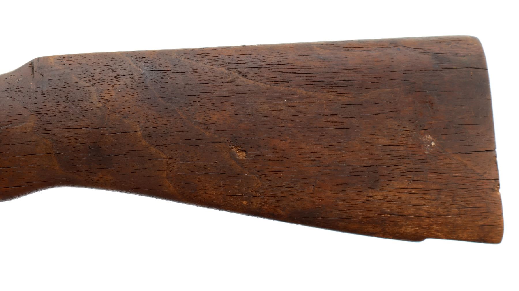 Main Description: Blade front sight, u notched rear sight, missing complete bolt assembly. One piece wood stock, forearm and pistol grip are cracked, smooth butt with age cracks, stock chipped at toe, modified forearm tip.