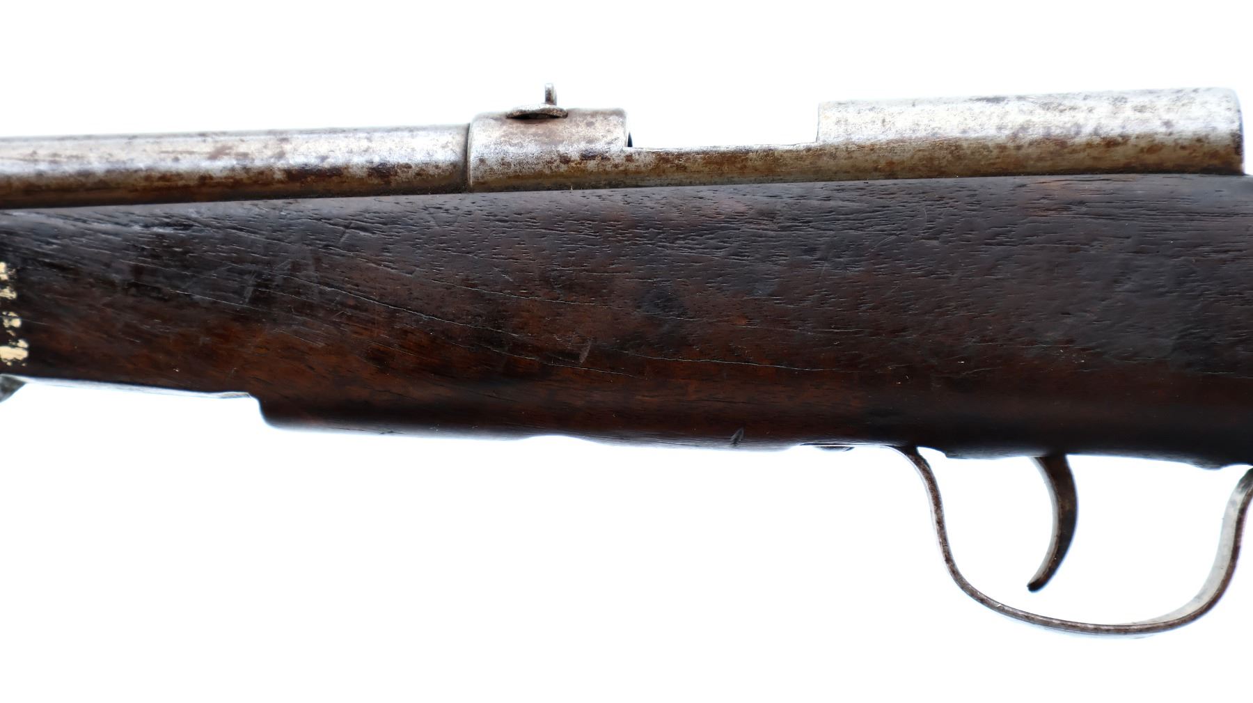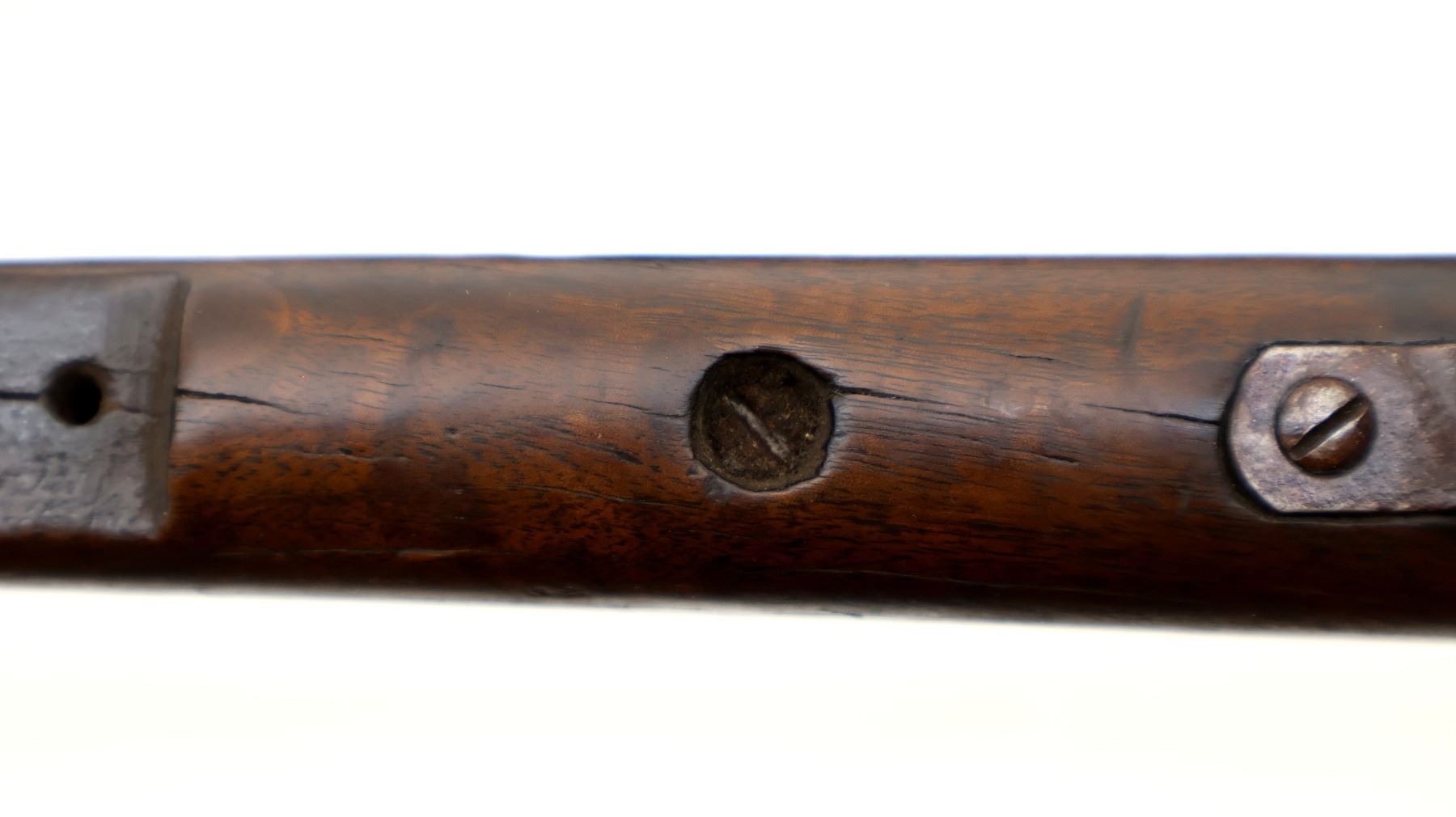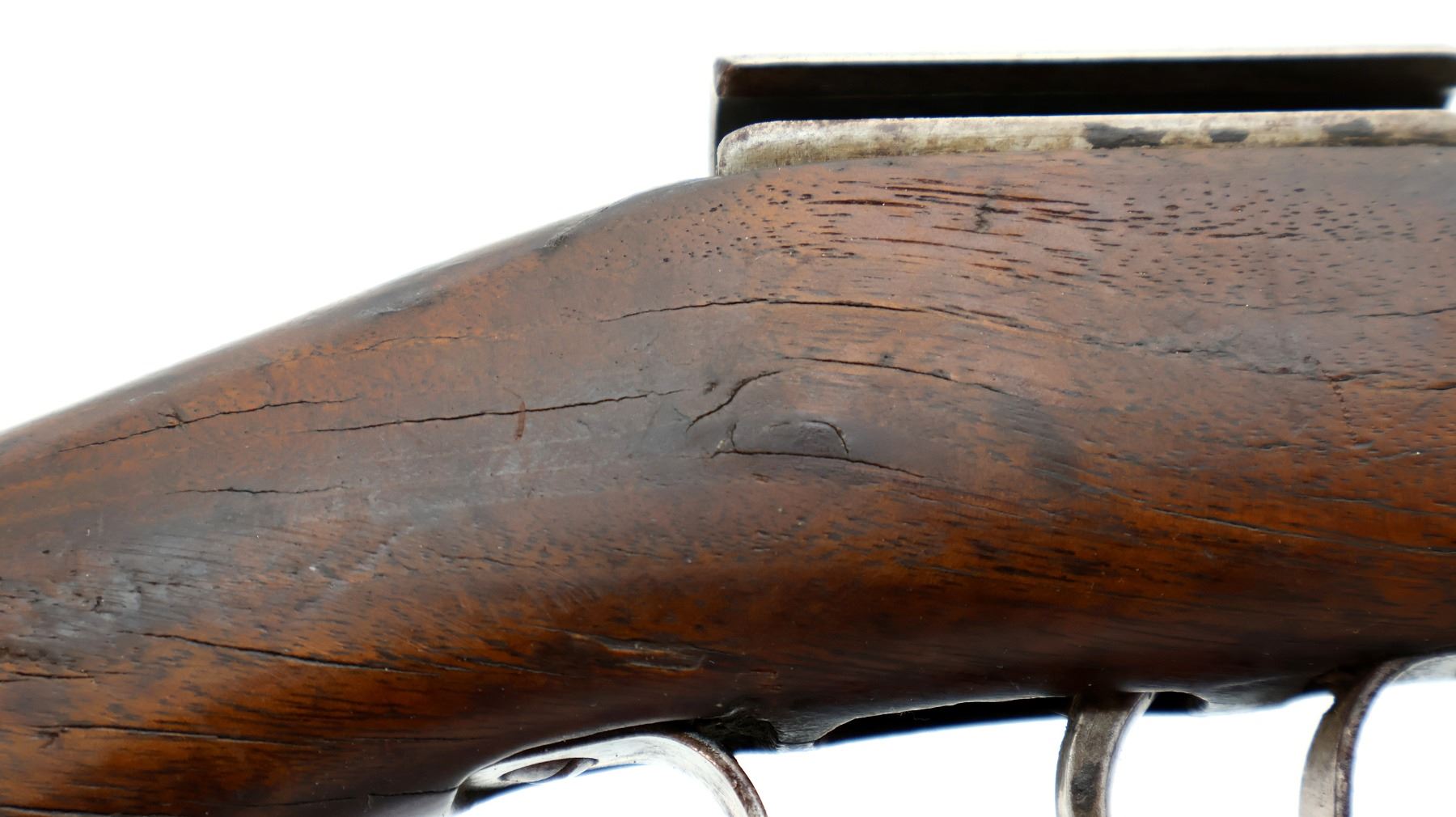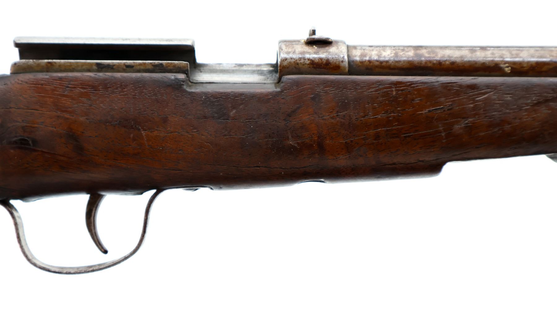 Main Description: Blade front sight, u notched rear sight, missing complete bolt assembly. One piece wood stock, forearm and pistol grip are cracked, smooth butt with age cracks, stock chipped at toe, modified forearm tip.