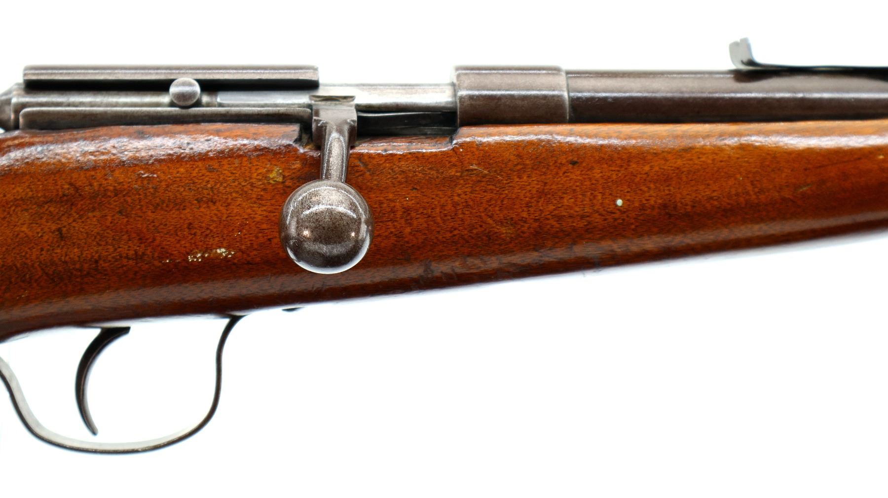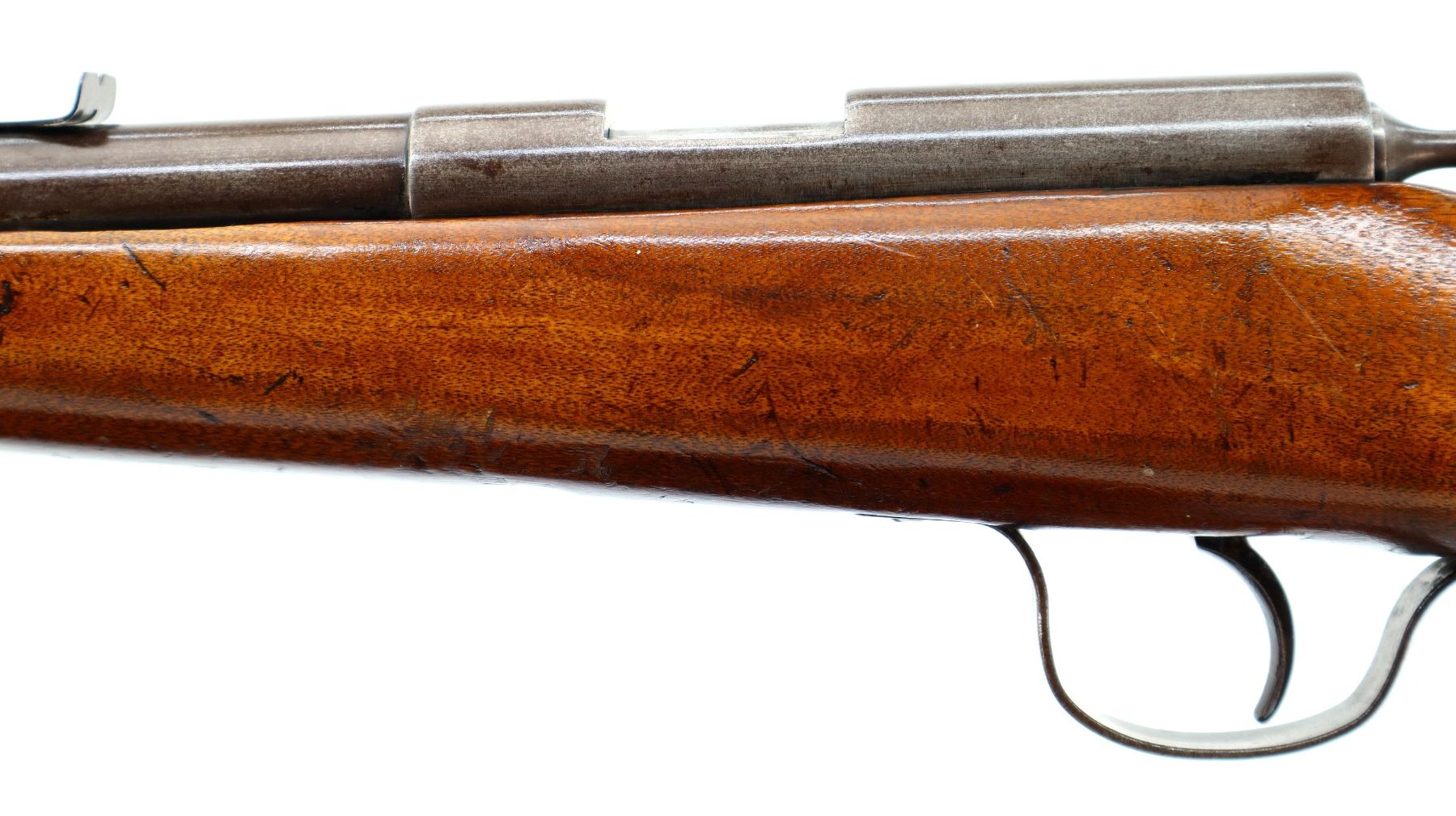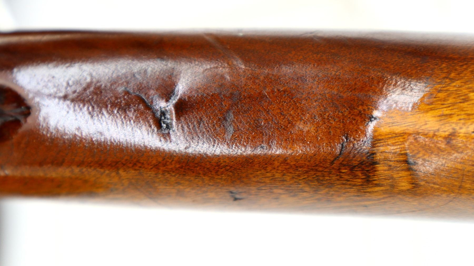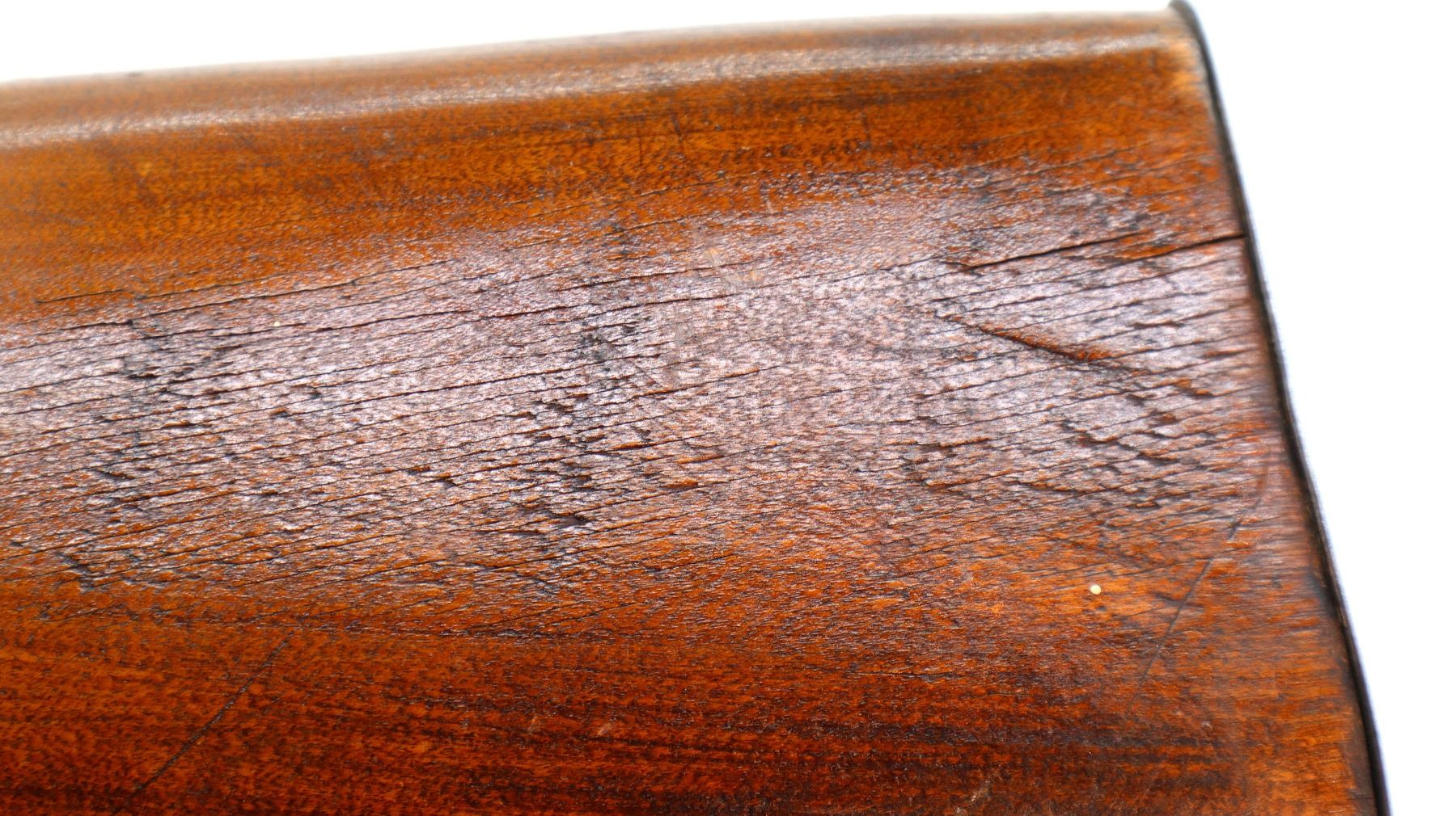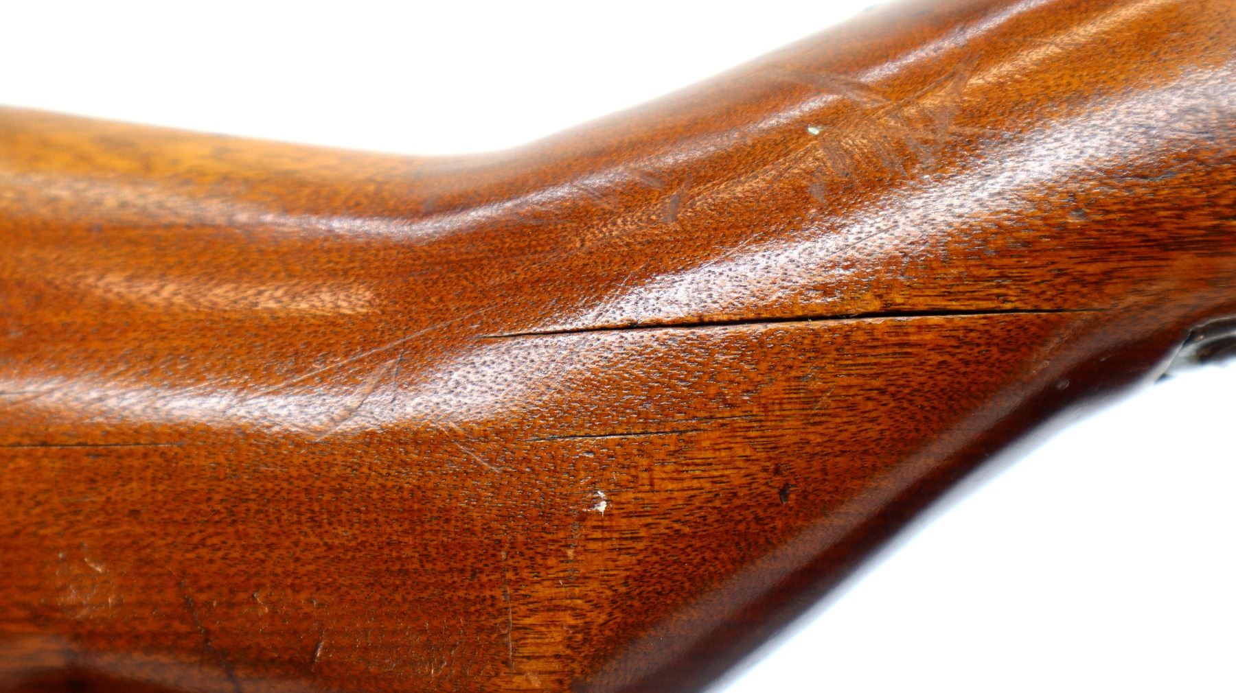 Main Description: Blade front sight, u notched rear sight missing elevator, smooth bolt knob, extractor is present. One piece wood stock, forend tip is cracked, pistol grip, smooth steel butt plate, stock has various age cracks on both sides.