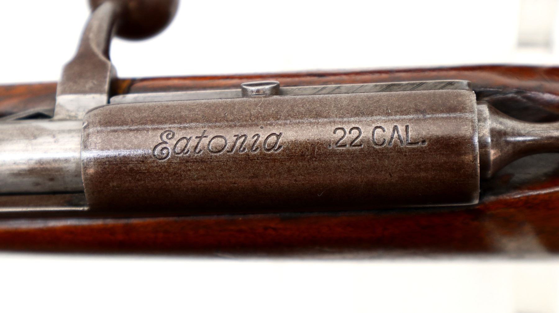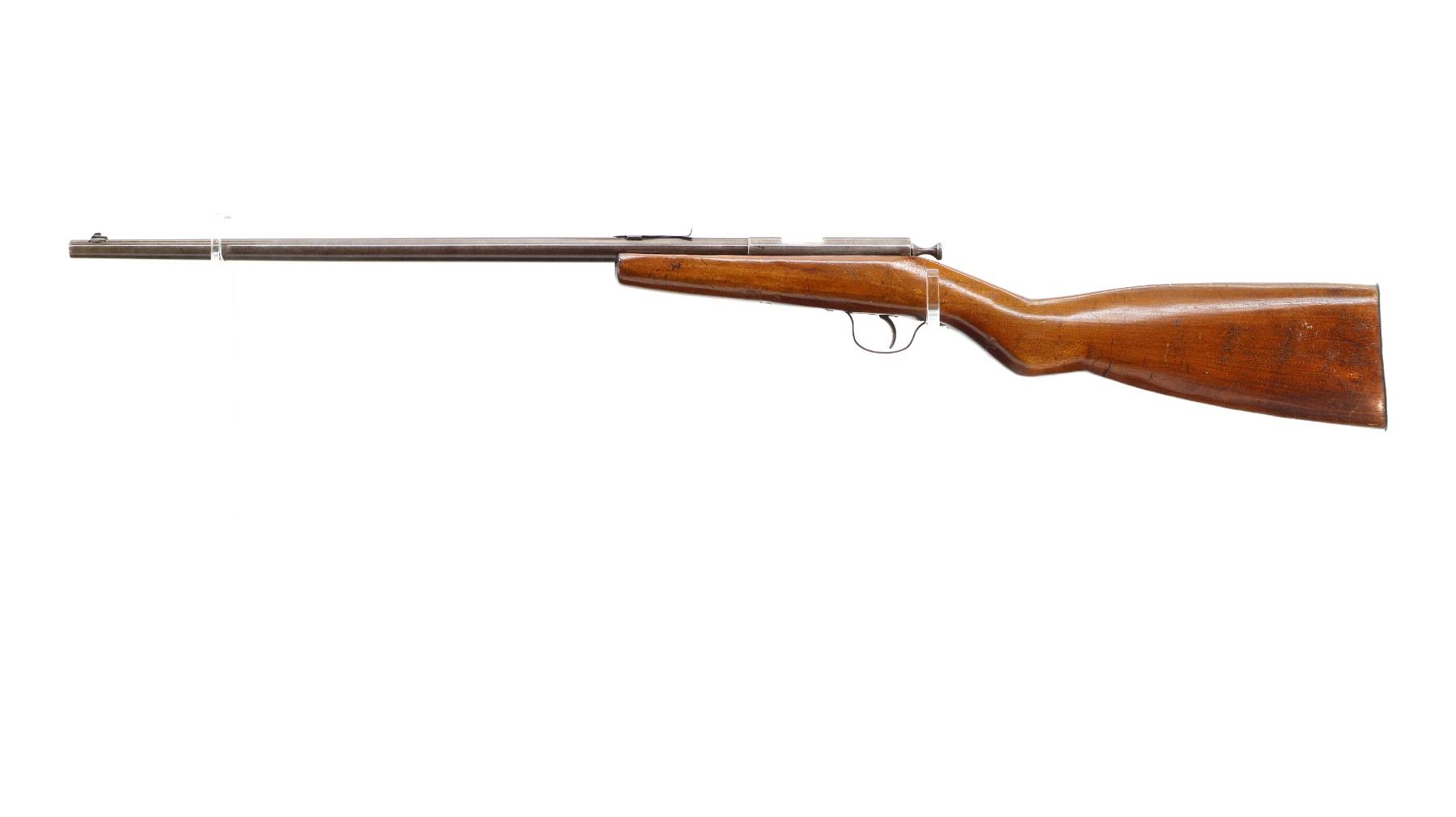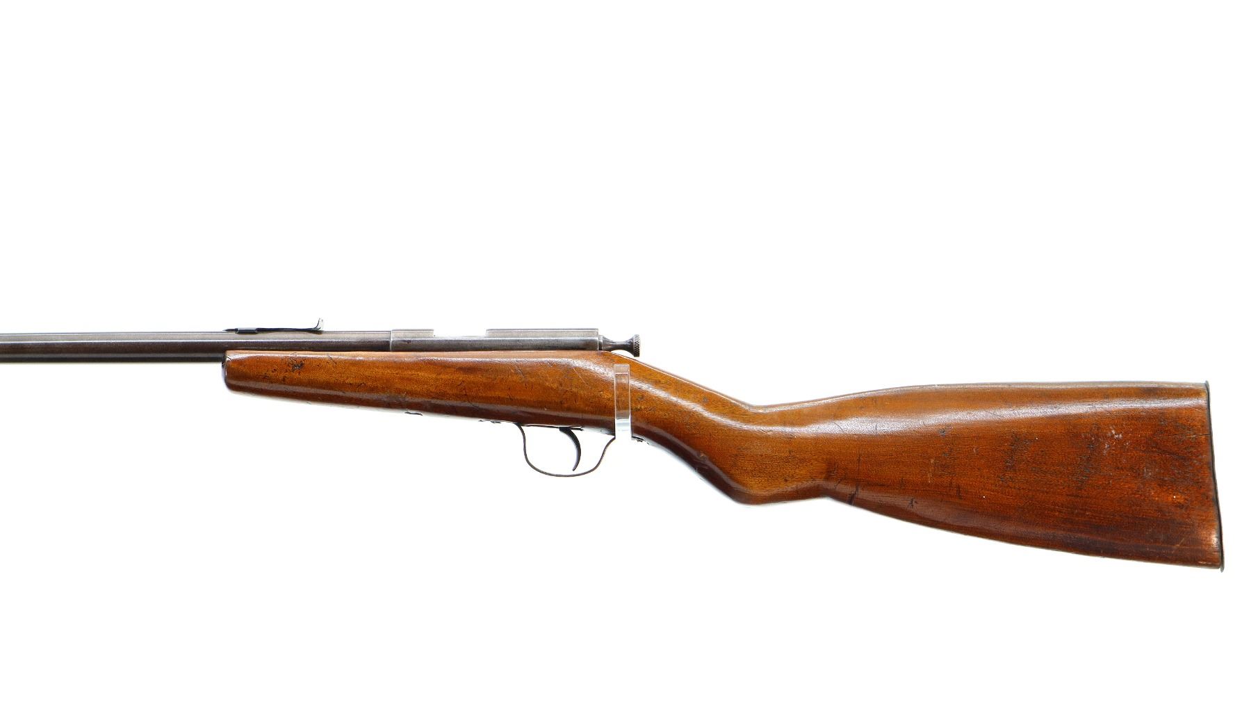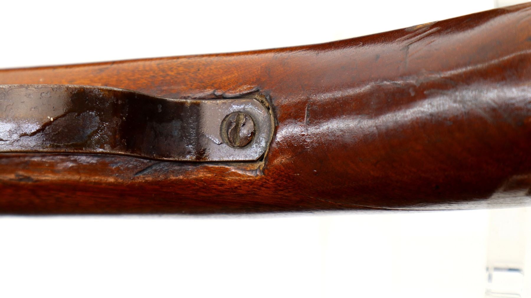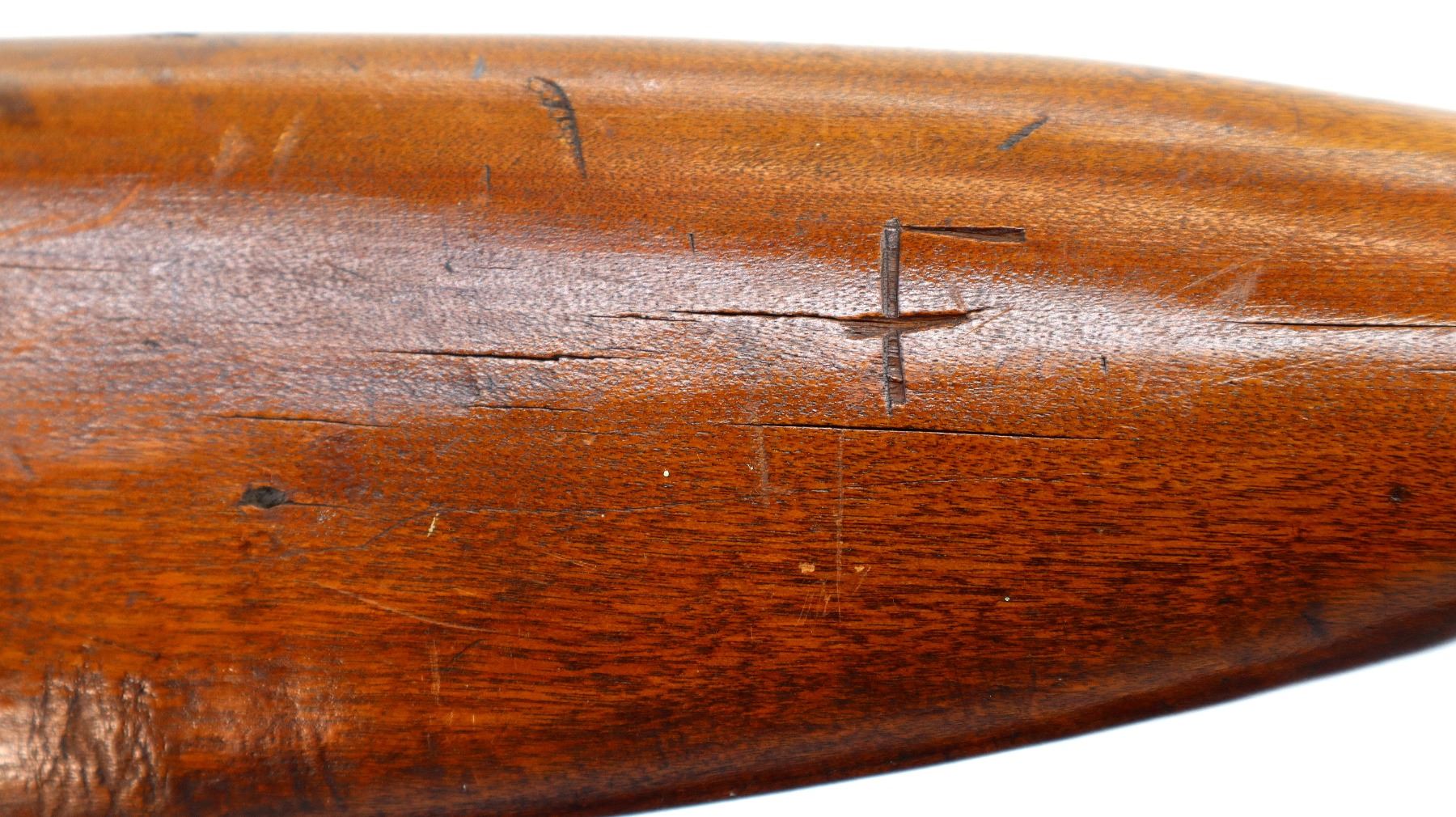 Main Description: Blade front sight, u notched rear sight missing elevator, smooth bolt knob, extractor is present. One piece wood stock, forend tip is cracked, pistol grip, smooth steel butt plate, stock has various age cracks on both sides.