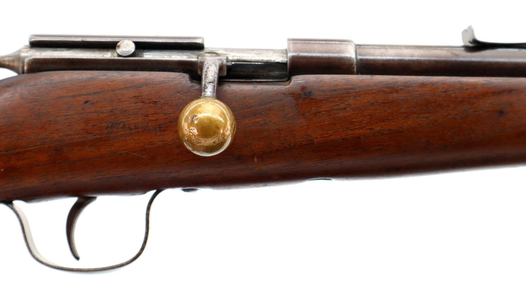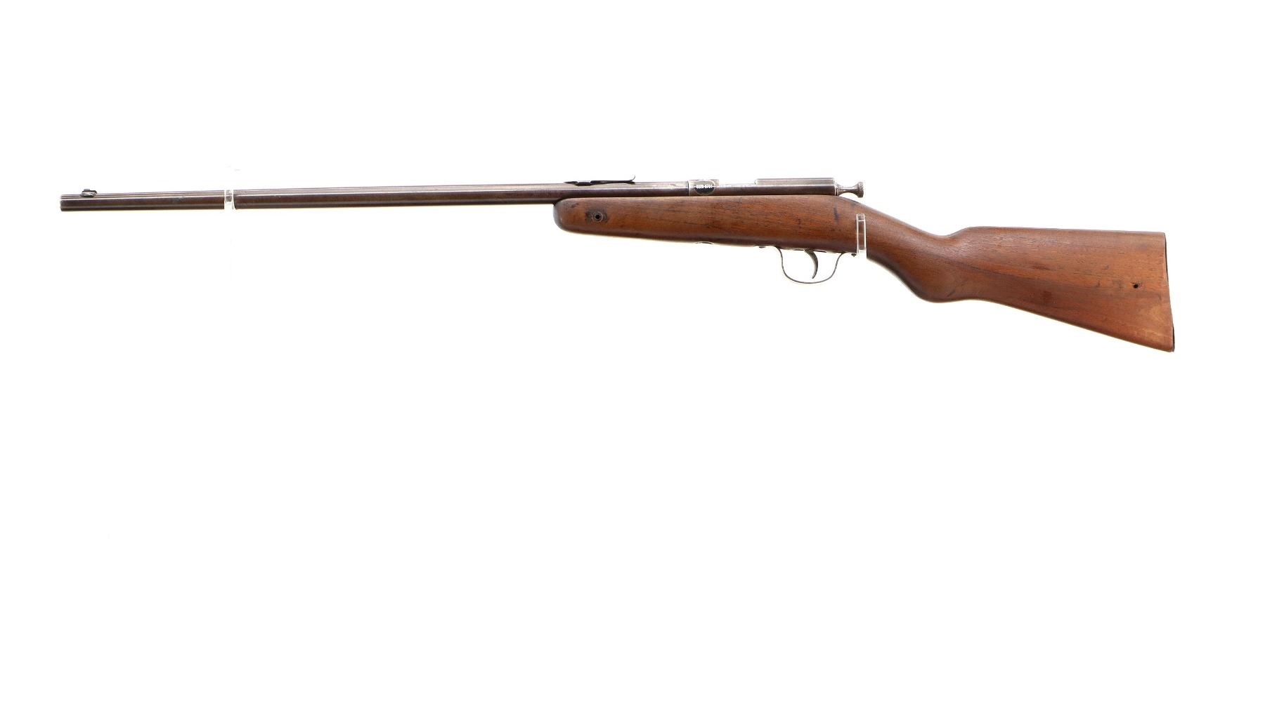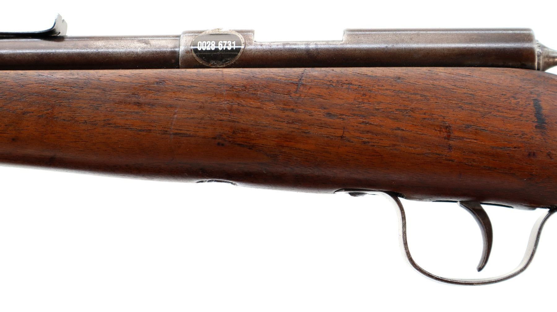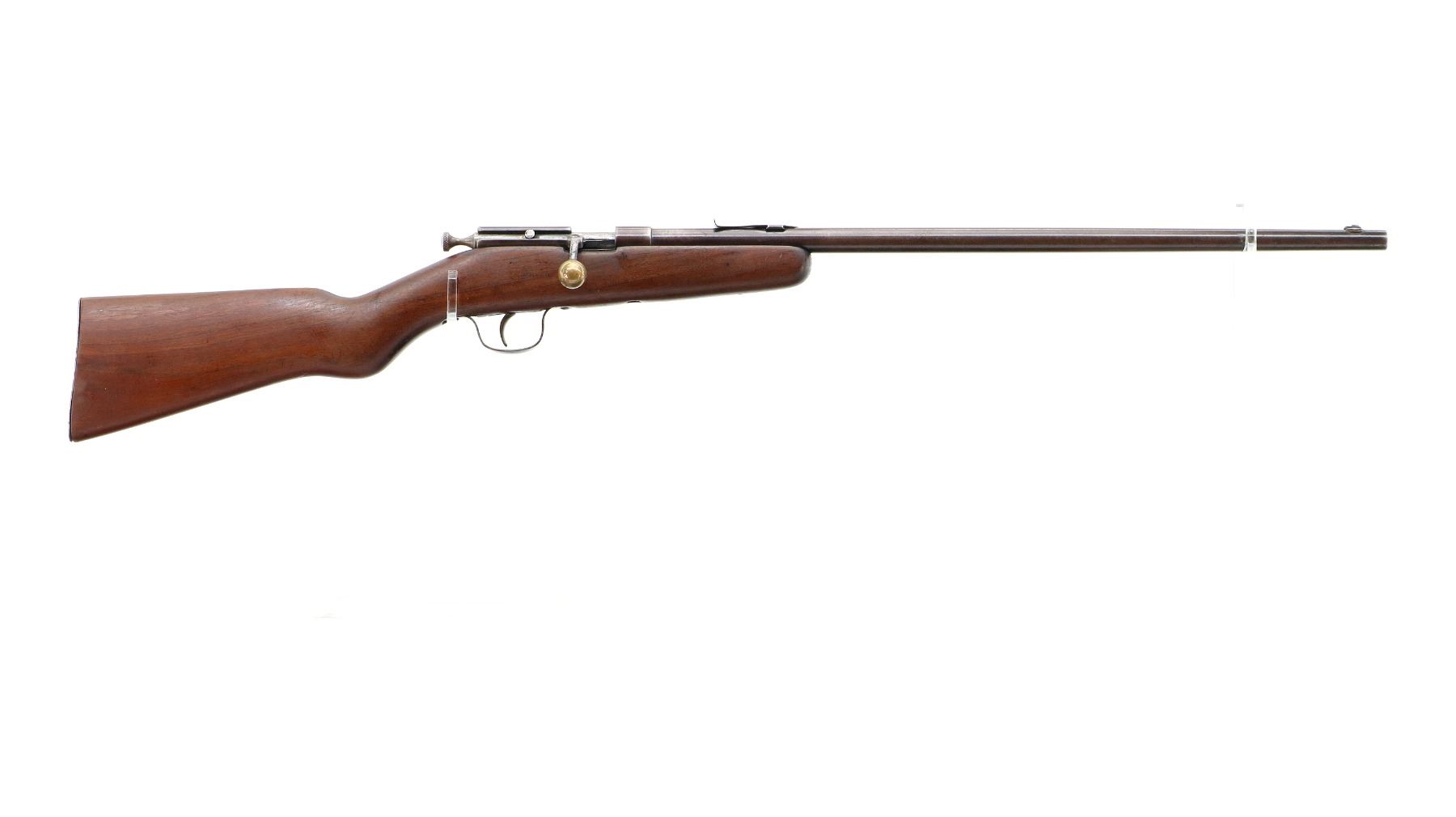 Main Description: Blade front sight, u notched rear sight missing elevator, brass bolt knob, extractor is present. One piece wood stock, forearm chipped and cracked around action screw, pistol grip, smooth steel butt plate with replaced screws, 11.25" LOP, missing swivels holes are present.