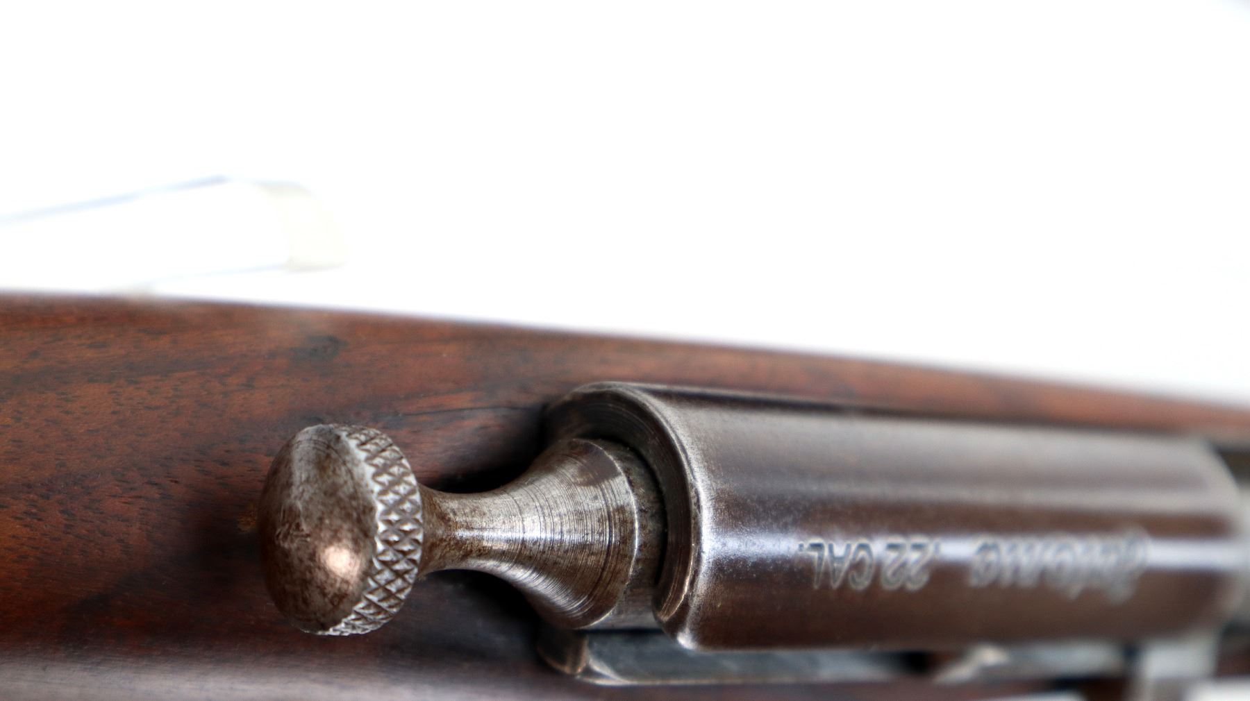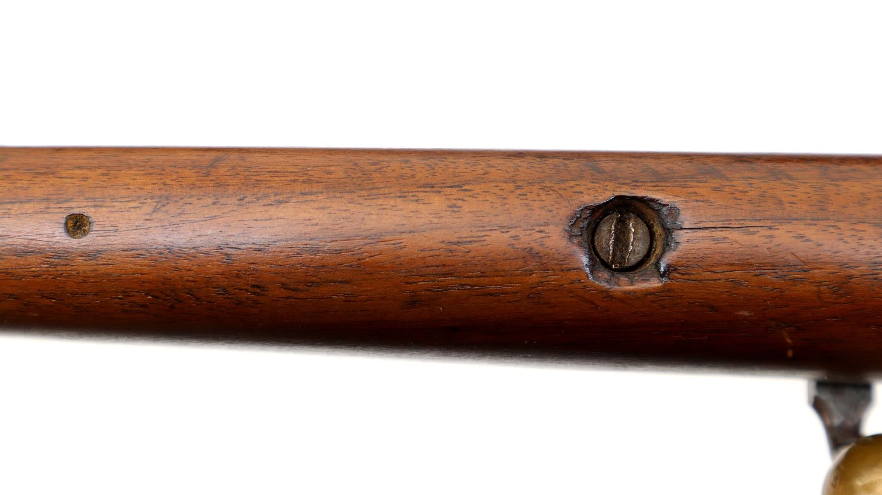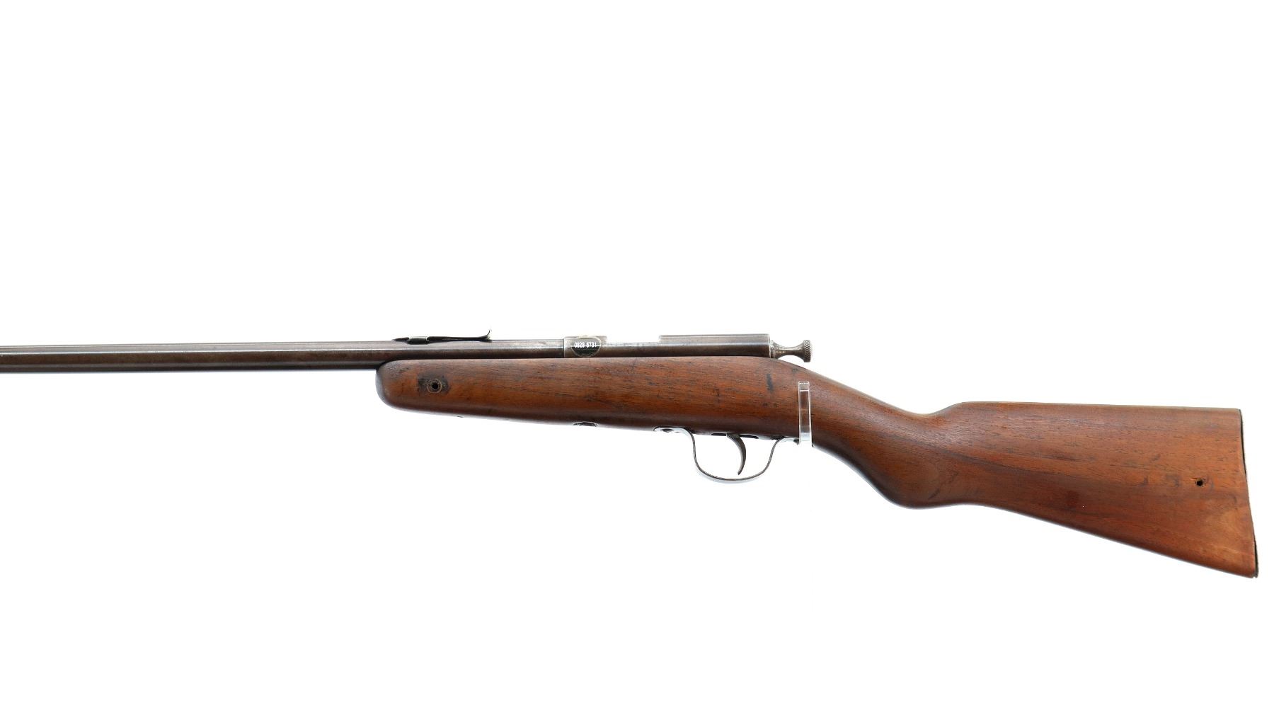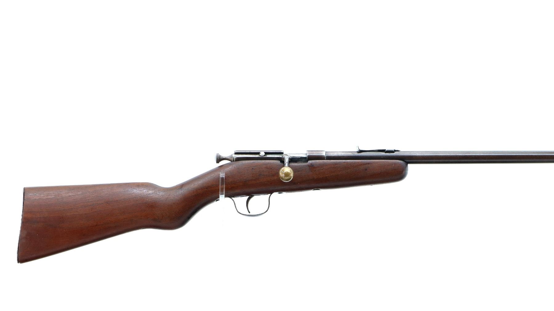 Main Description: Blade front sight, u notched rear sight missing elevator, brass bolt knob, extractor is present. One piece wood stock, forearm chipped and cracked around action screw, pistol grip, smooth steel butt plate with replaced screws, 11.25" LOP, missing swivels holes are present.