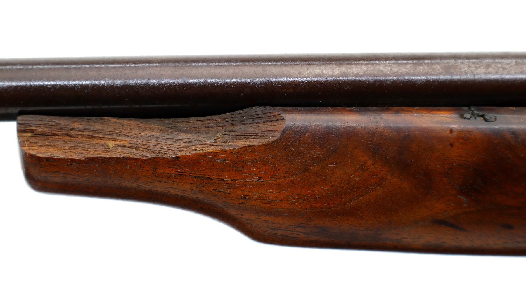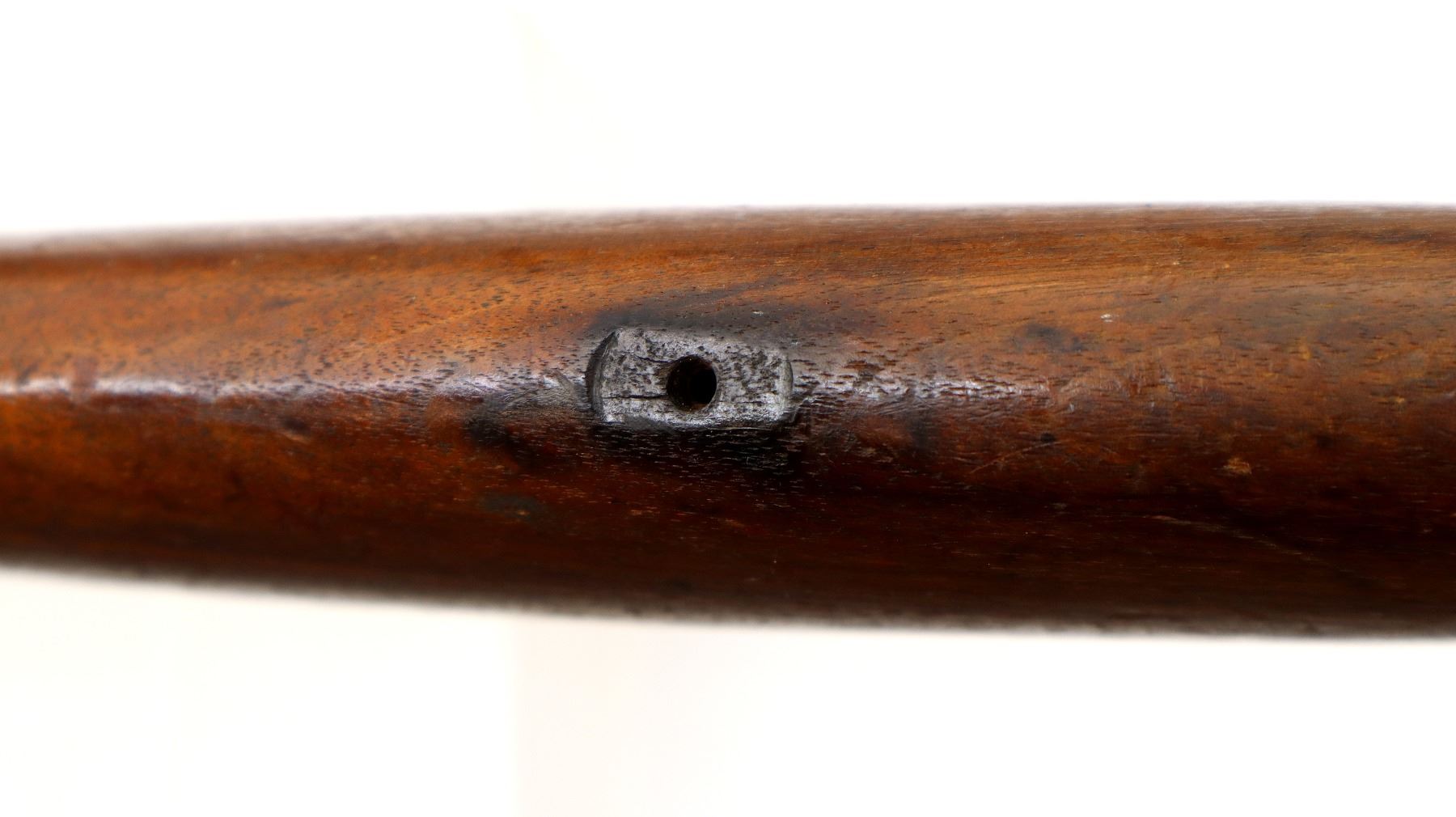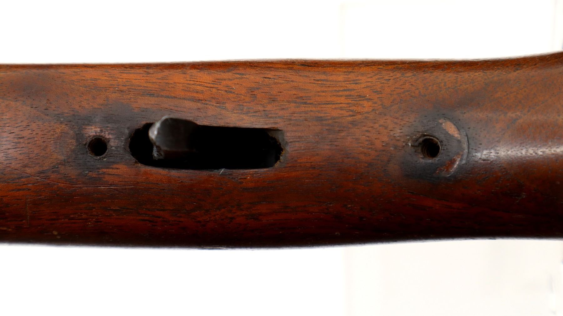 Main Description: Missing front and rear sights, dovetails present, missing complete bolt, butt plate, trigger guard, screws and sling swivels. One piece wood stock, forearm is chipped and cracked, pistol grip, holes for swivels are present in stock.