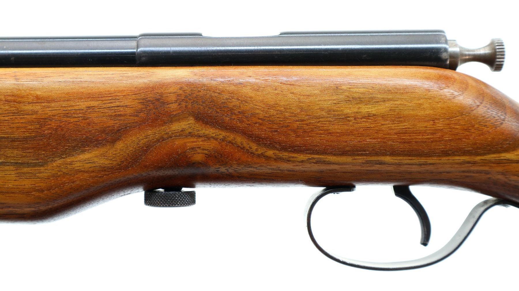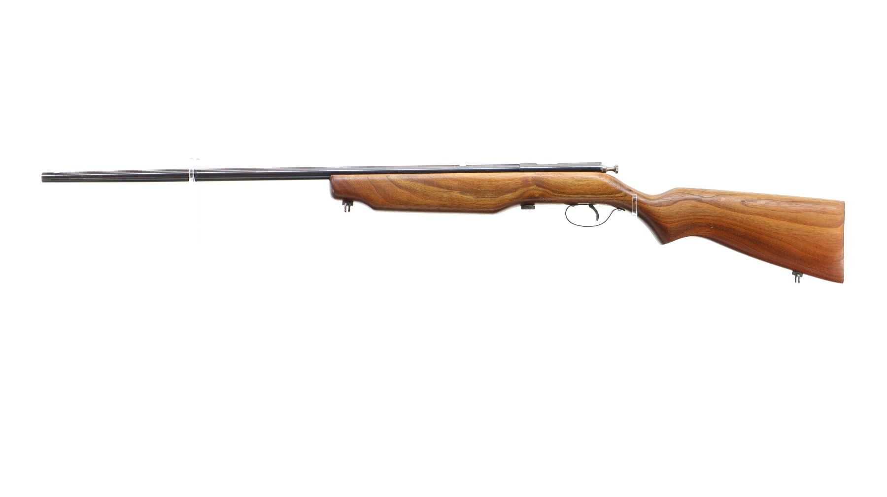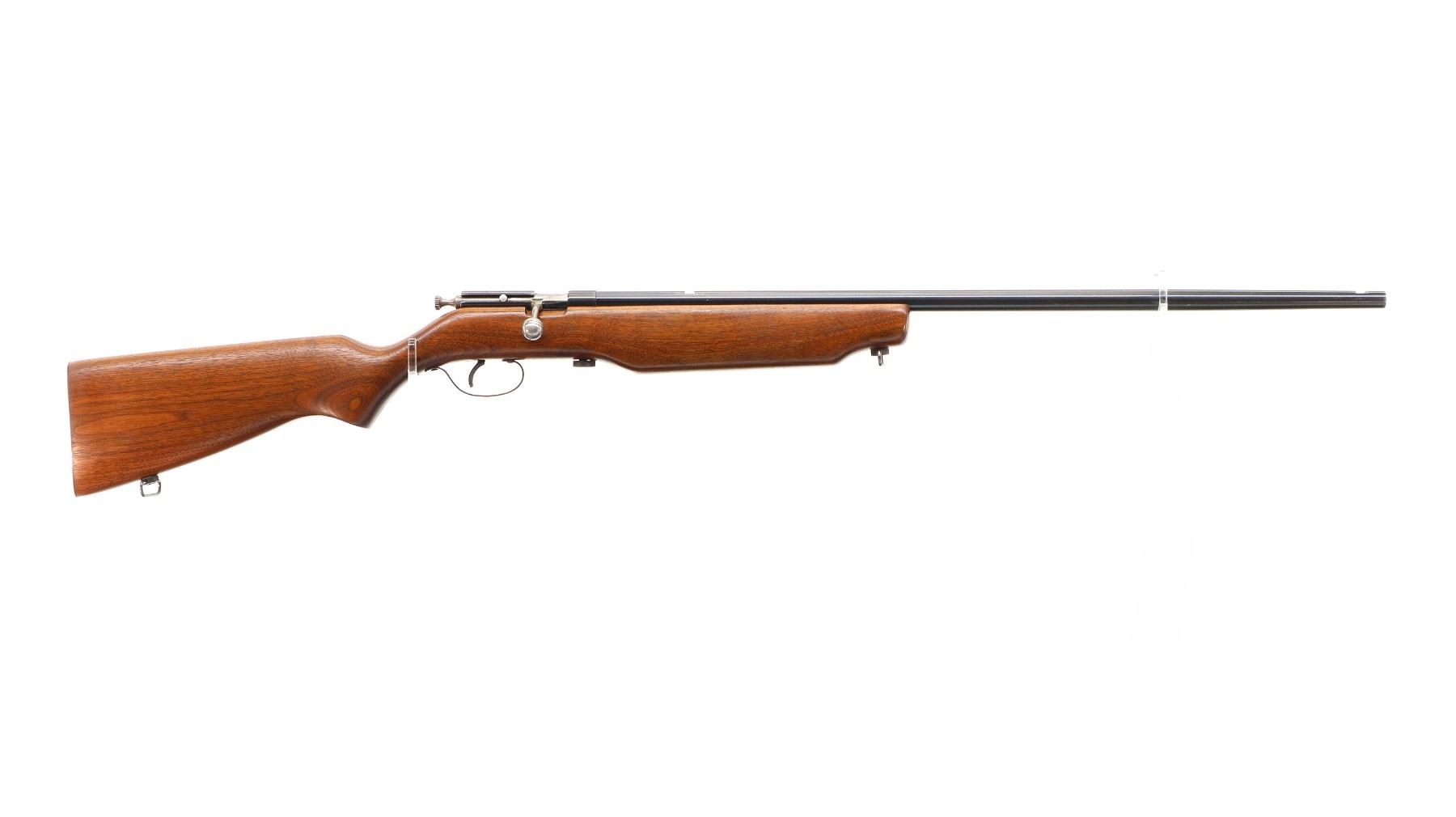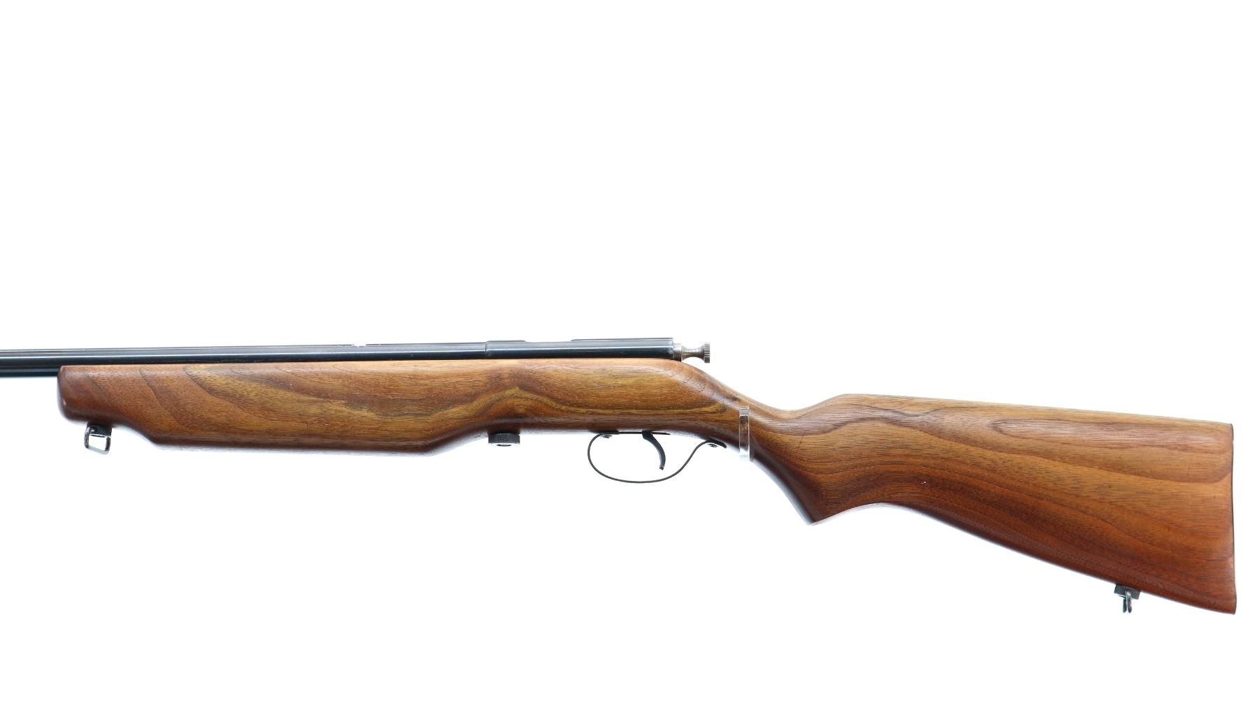 Main Description: Missing front and rear sights dovetails present, blued finish, grooved bolt knob, extractor is present. One piece wood stock, pistol grip, smooth steel butt plate, sling swivels.