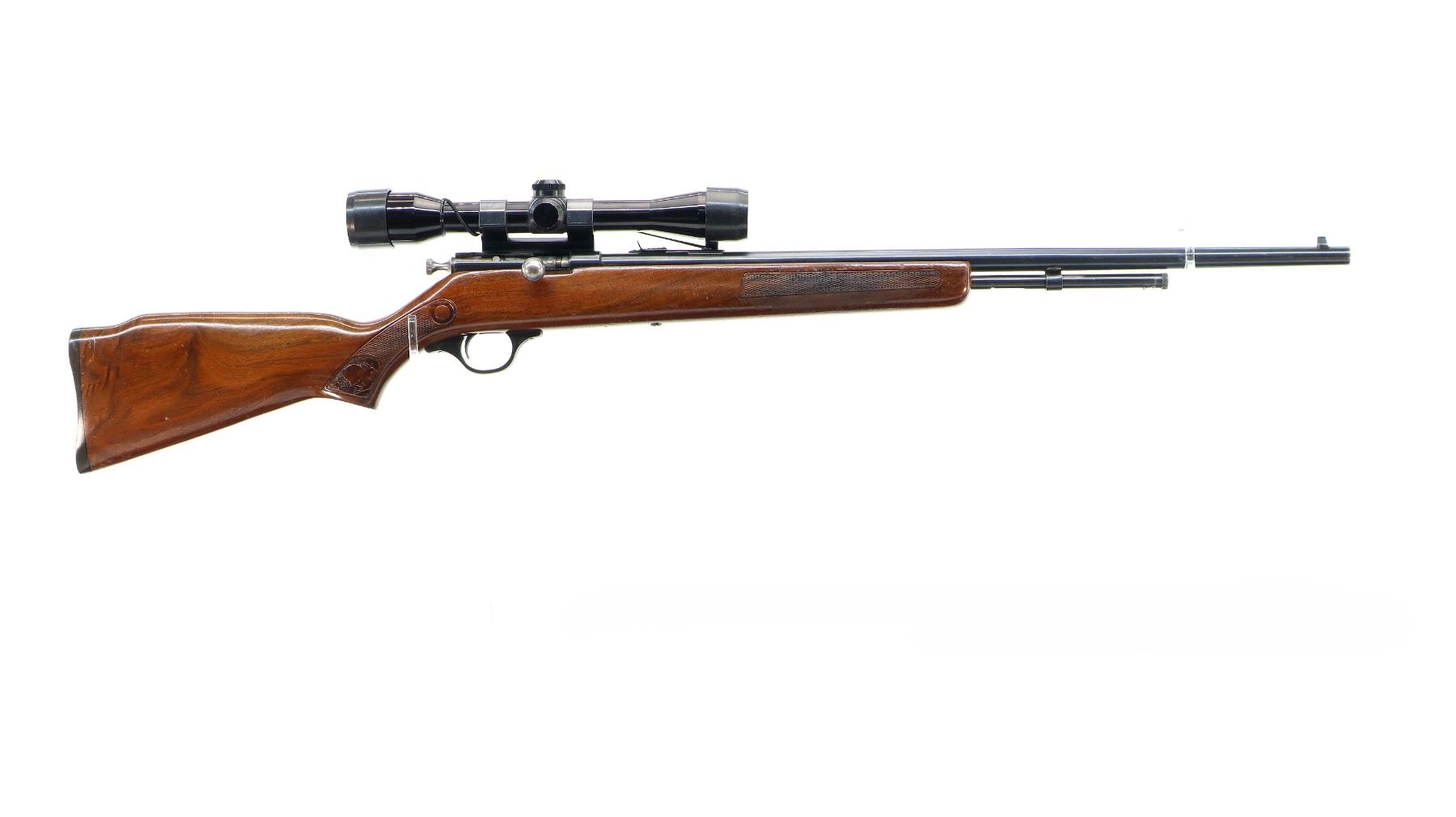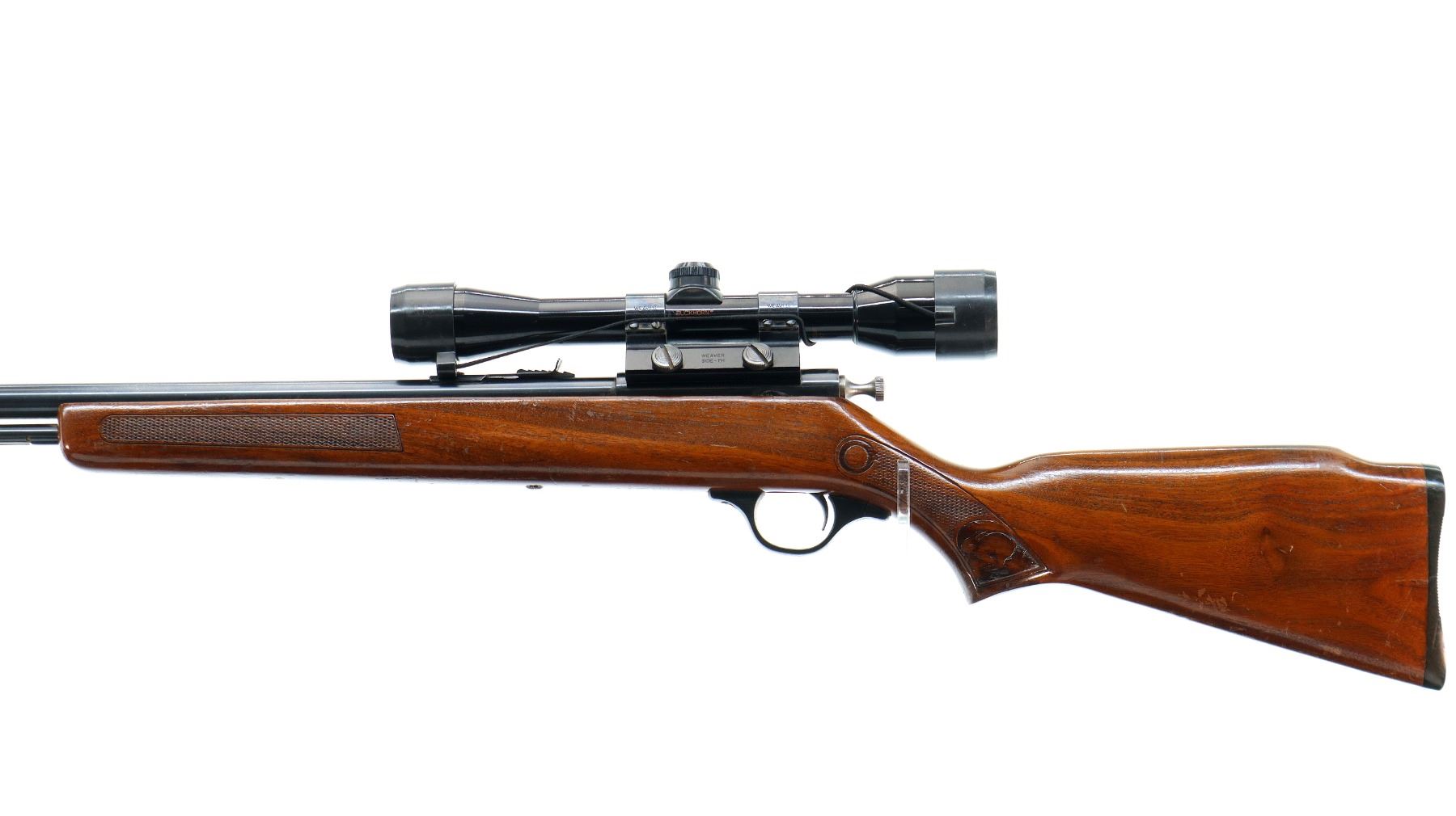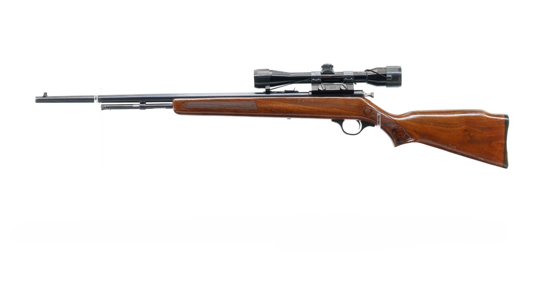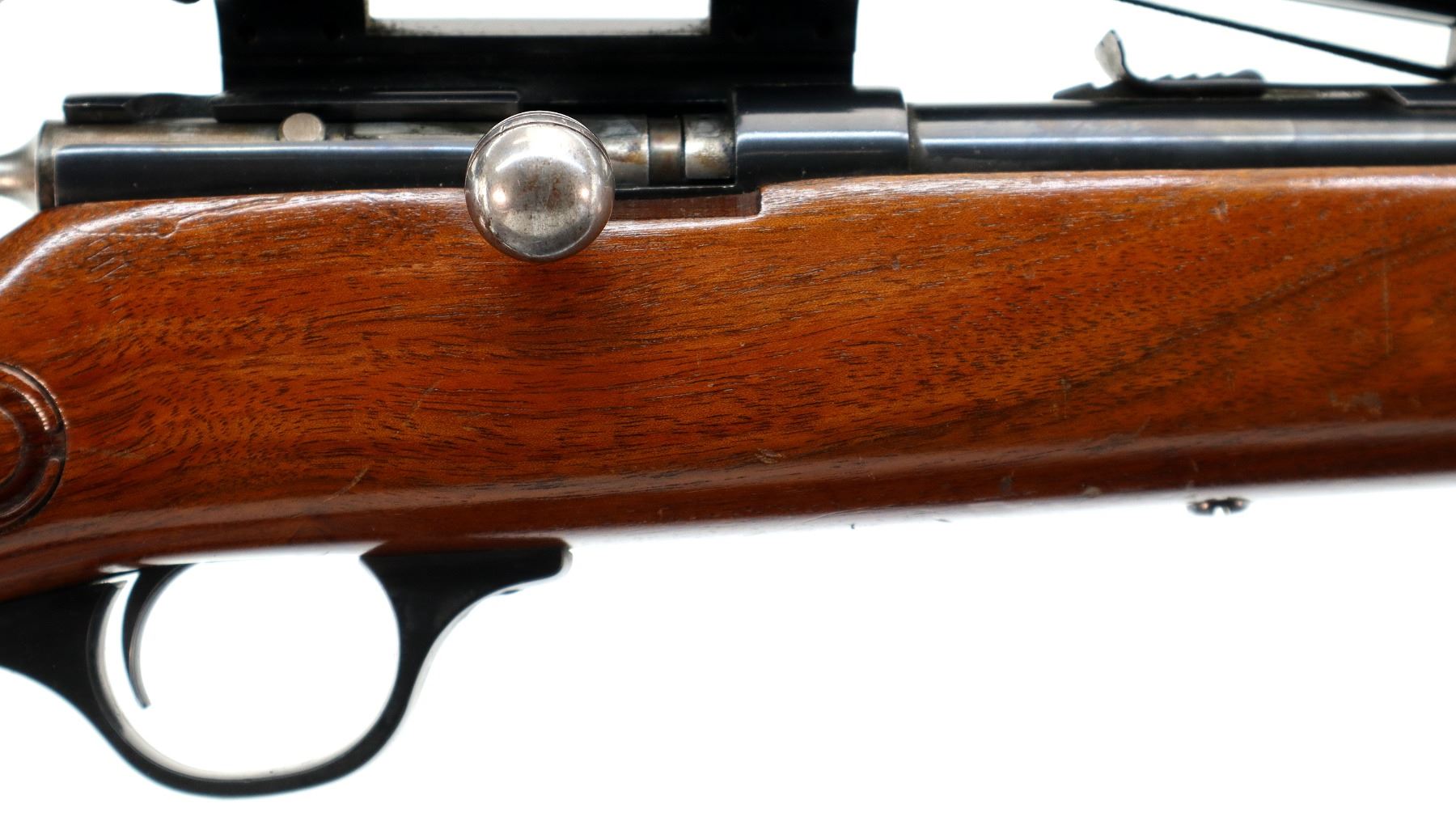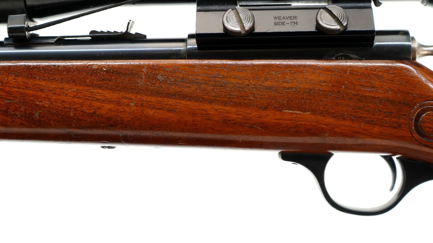 Main Description: Blade front sight, adjustable u notched rear sight, blued finish, receiver drilled and tapped with Weaver side mount and Bushnell Buckhorn 4x32 scope installed, clear optics with duplex crosshair. Grooved bolt knob. One piece wood stock, checkered forearm and pistol grip, raised comb, grooved black polymer butt plate, trigger guard is cracked.