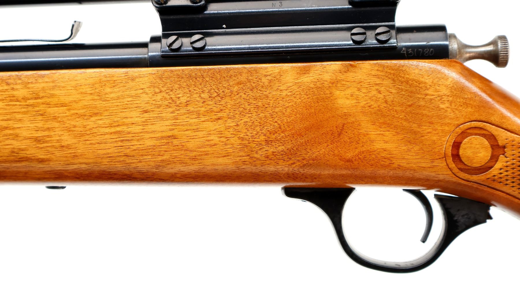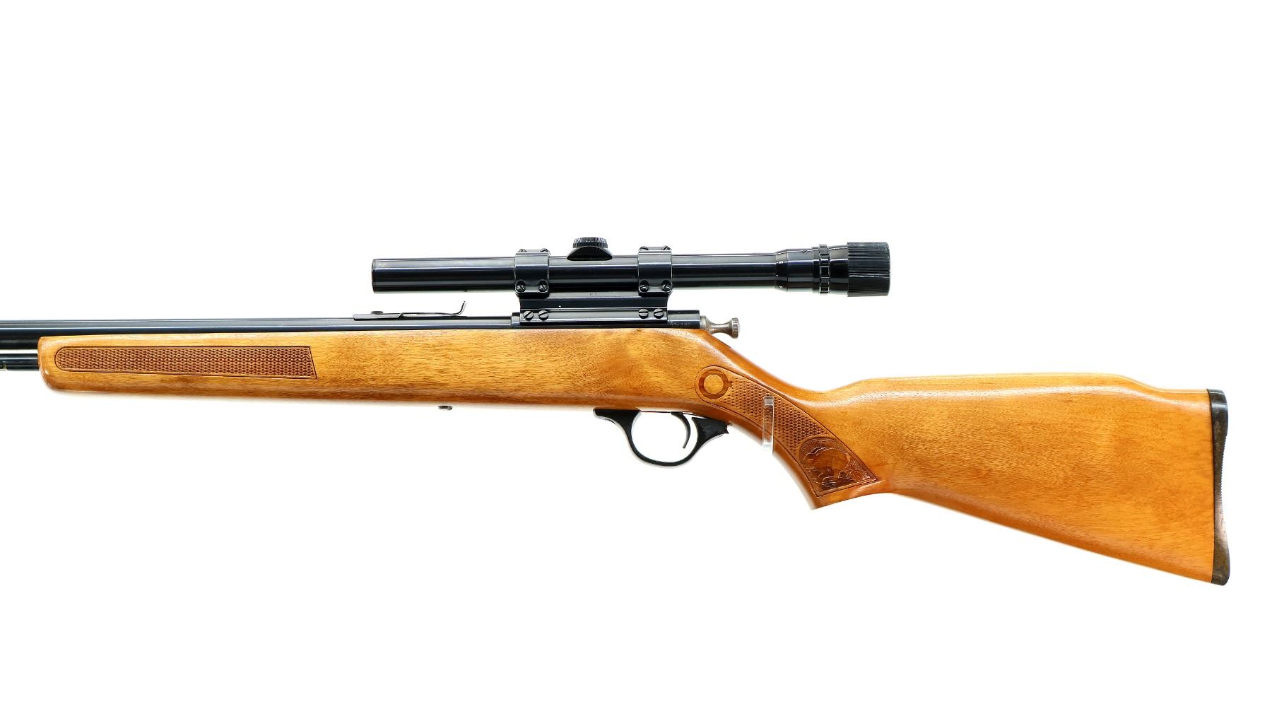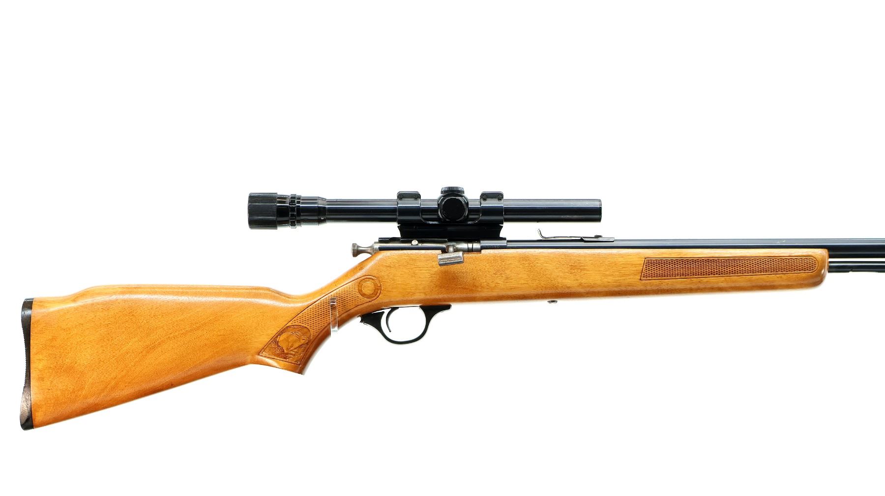 Main Description: Blade front sight, u notched rear sight missing elevator, blued finish, receiver drilled and tapped with Weaver 3-6 V22A scope installed, clear optics with Duplex crosshair. Replaced bolt knob. One piece wood stock, checkered forearm and pistol grip, raised comb, grooved black polymer butt plate missing one screw, trigger guard has broken piece which is included.