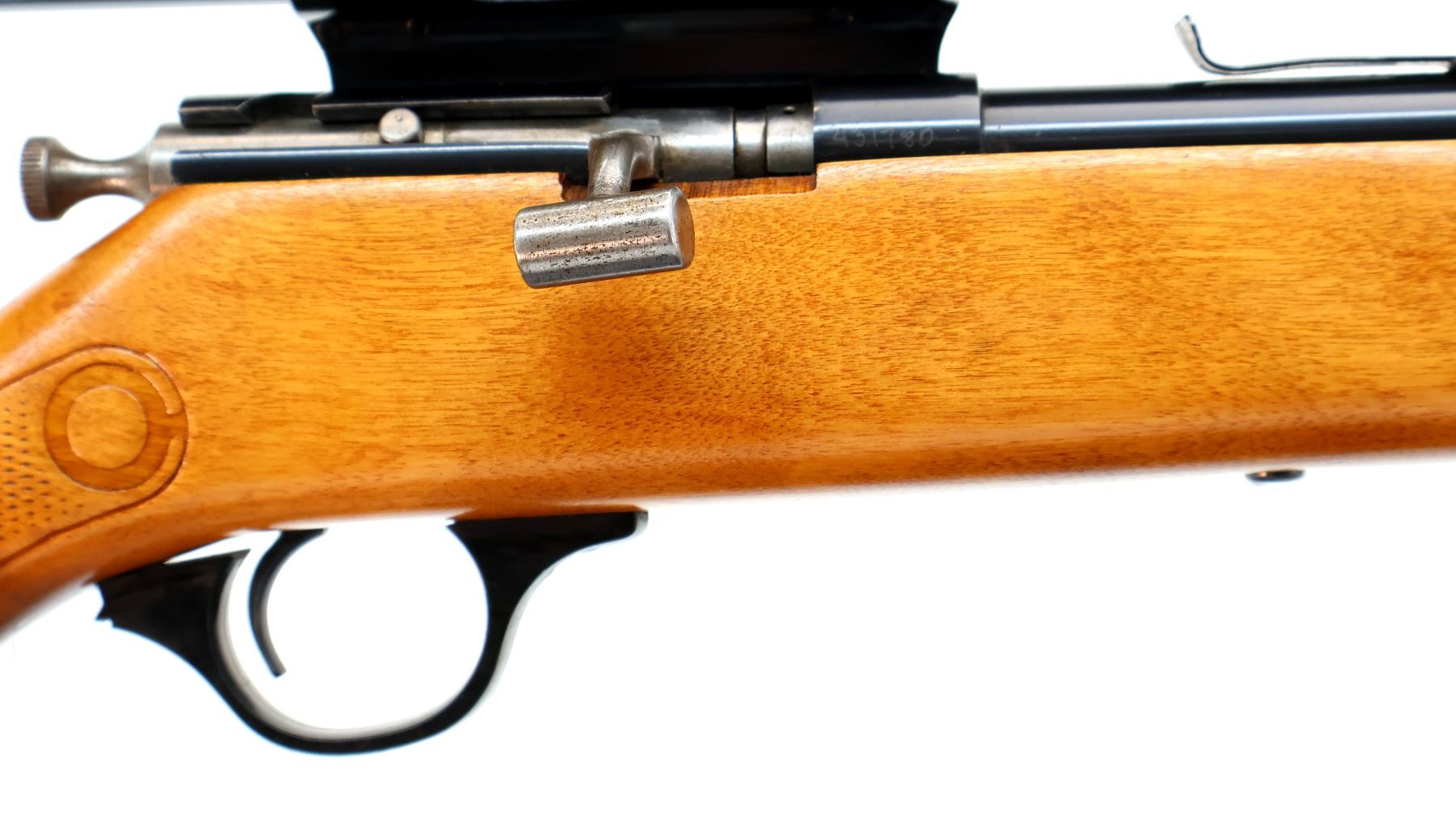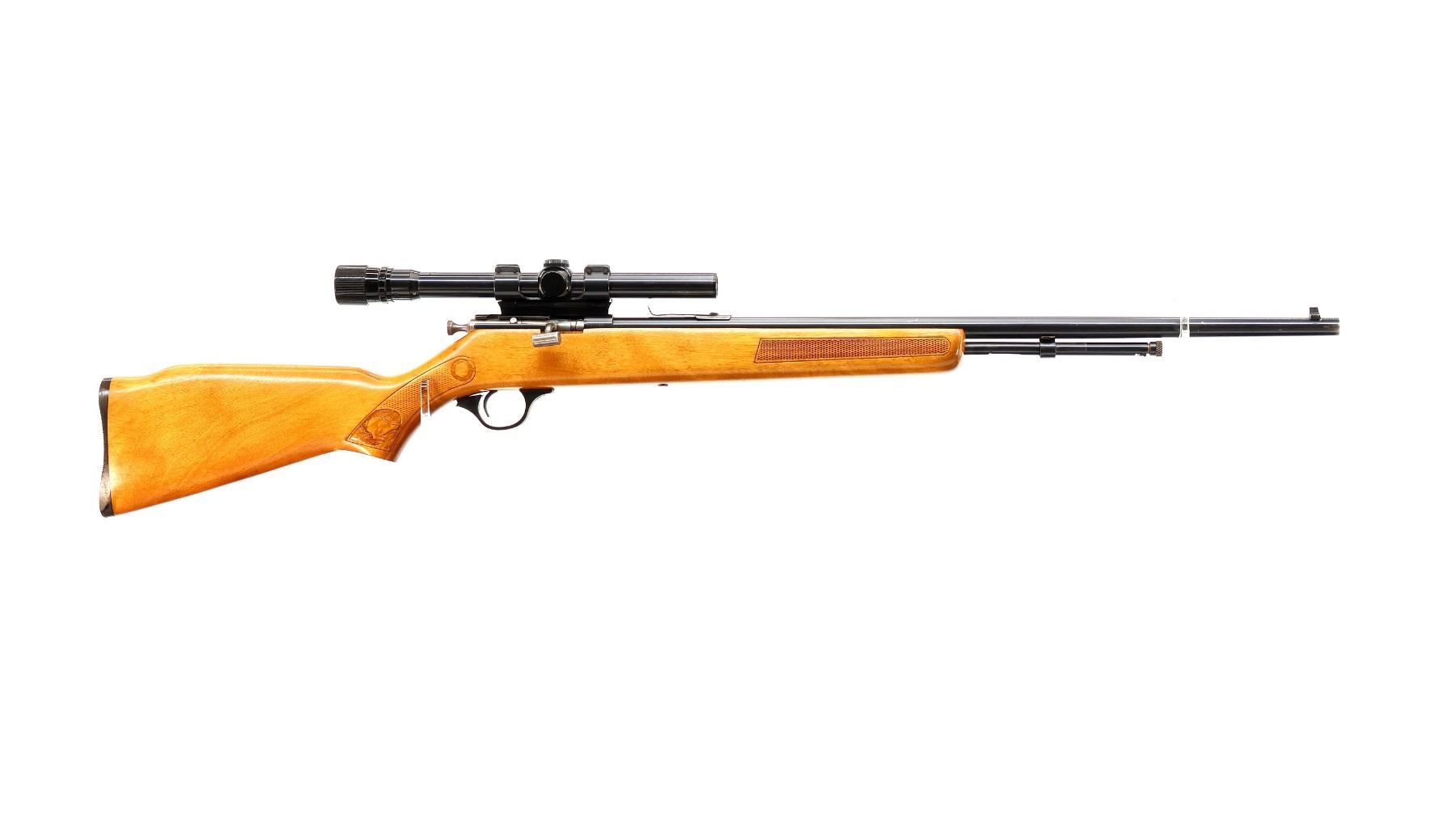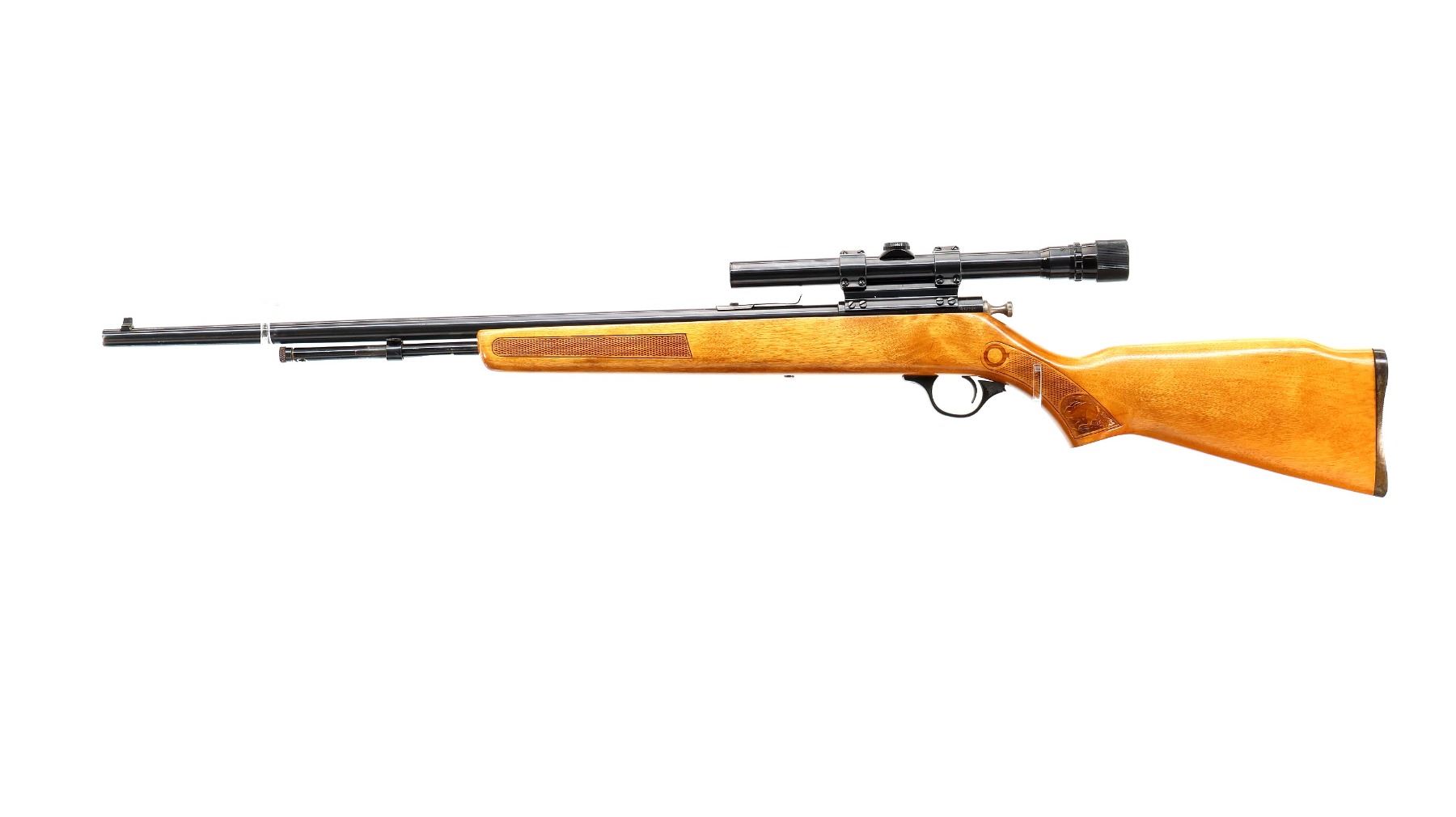 Main Description: Blade front sight, u notched rear sight missing elevator, blued finish, receiver drilled and tapped with Weaver 3-6 V22A scope installed, clear optics with Duplex crosshair. Replaced bolt knob. One piece wood stock, checkered forearm and pistol grip, raised comb, grooved black polymer butt plate missing one screw, trigger guard has broken piece which is included.