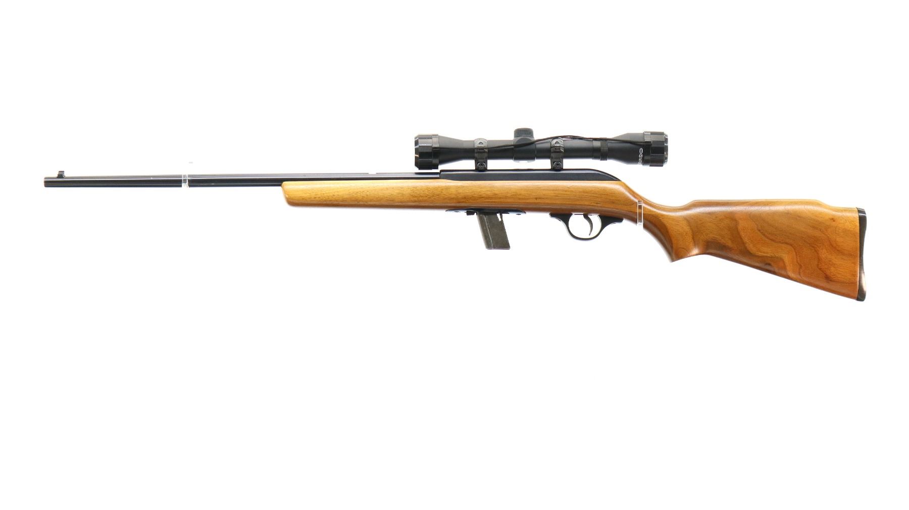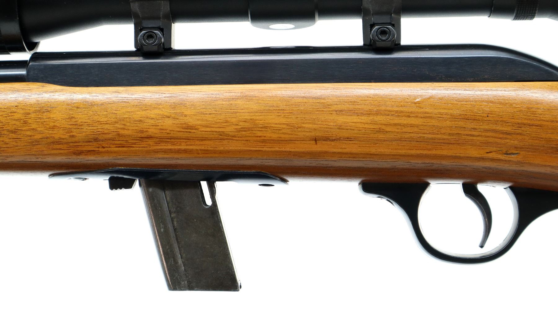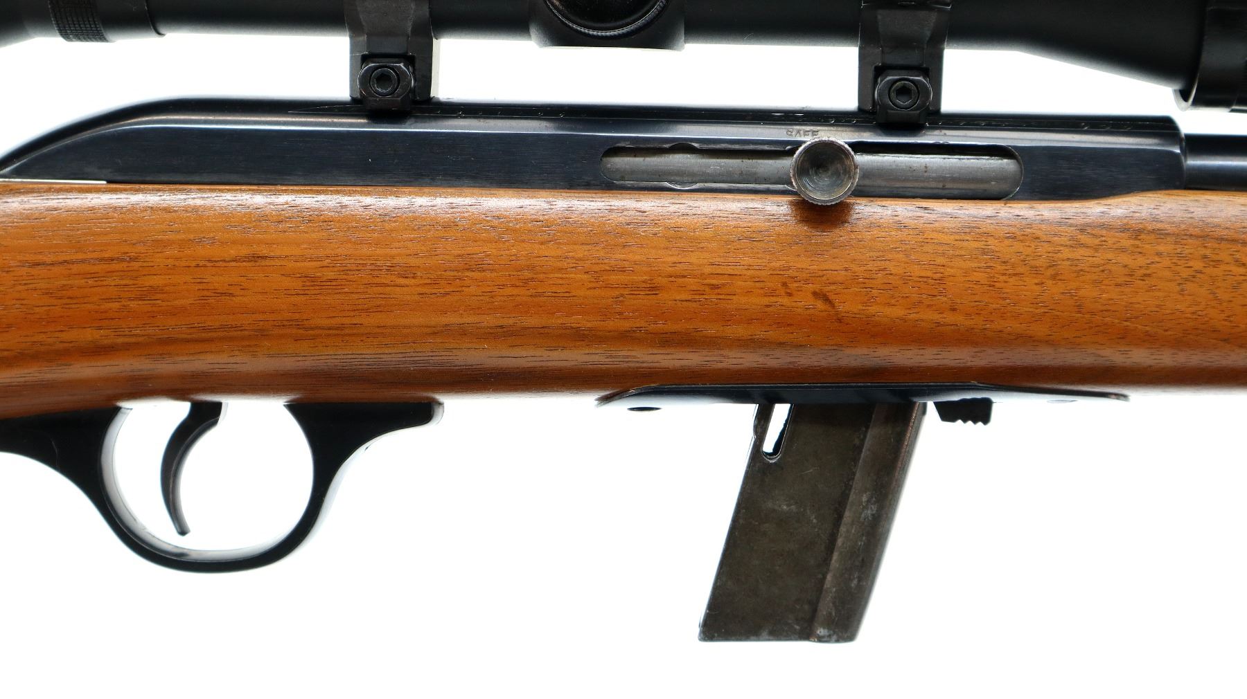 Main Description: Blade front sight, missing rear sight dovetail present, blued finish, grooved receiver with millet rings, Tasco 4x32 scope, clear optics with duplex crosshair. One piece wood stock, pistol grip, raised comb, grooved black polymer butt plate.