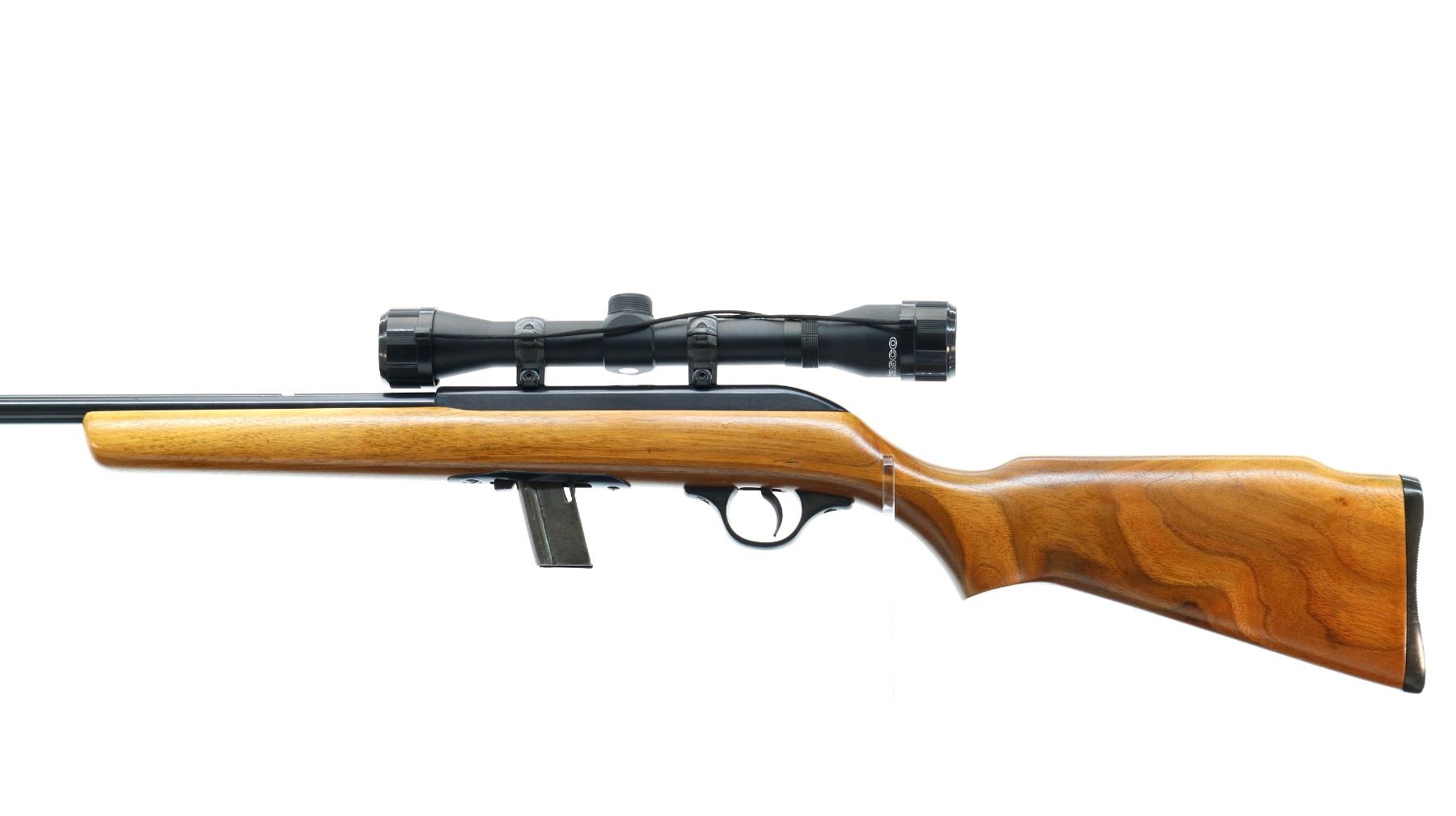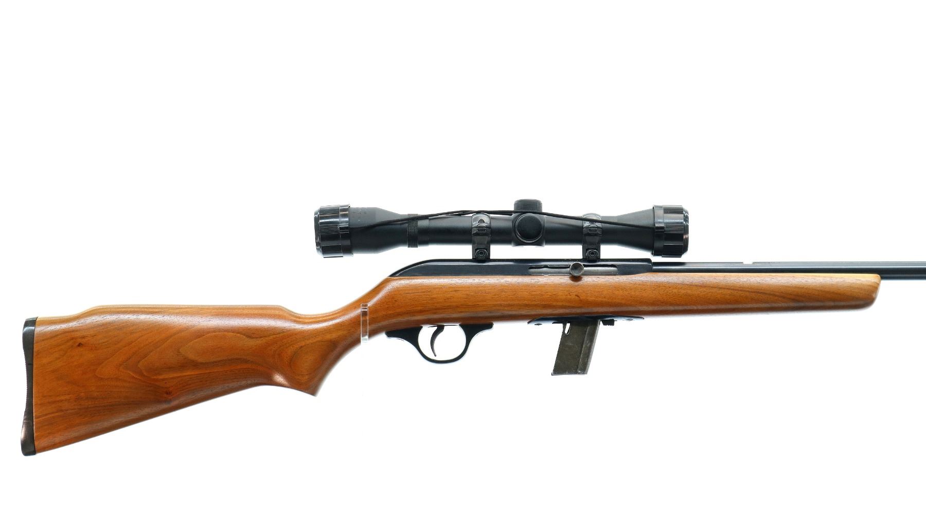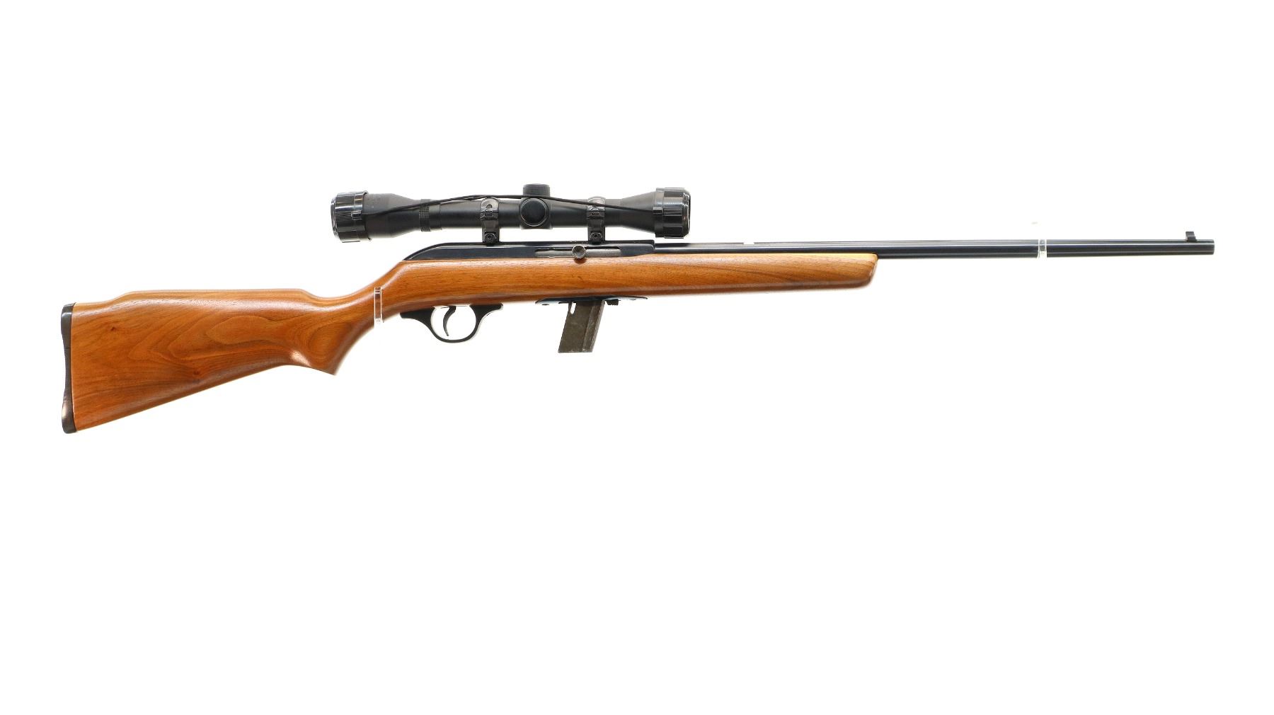 Main Description: Blade front sight, missing rear sight dovetail present, blued finish, grooved receiver with millet rings, Tasco 4x32 scope, clear optics with duplex crosshair. One piece wood stock, pistol grip, raised comb, grooved black polymer butt plate.