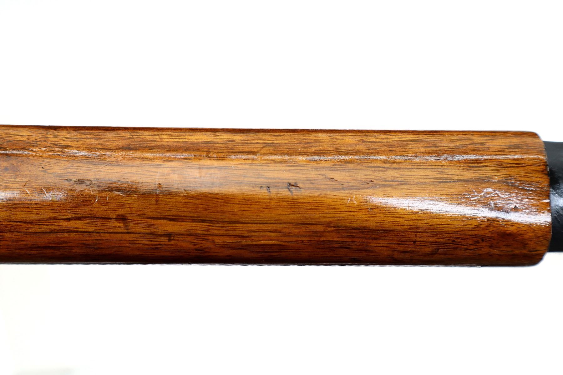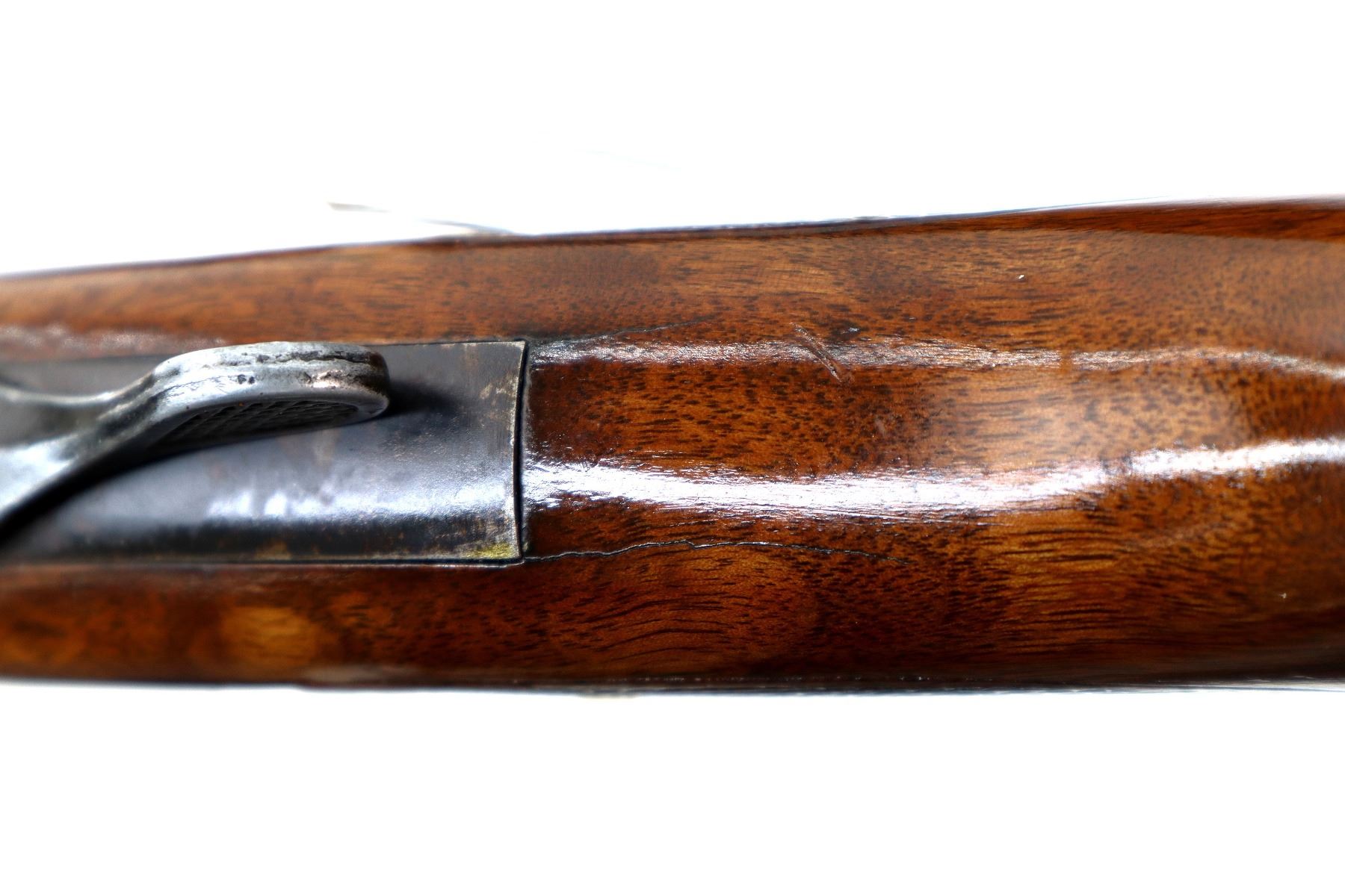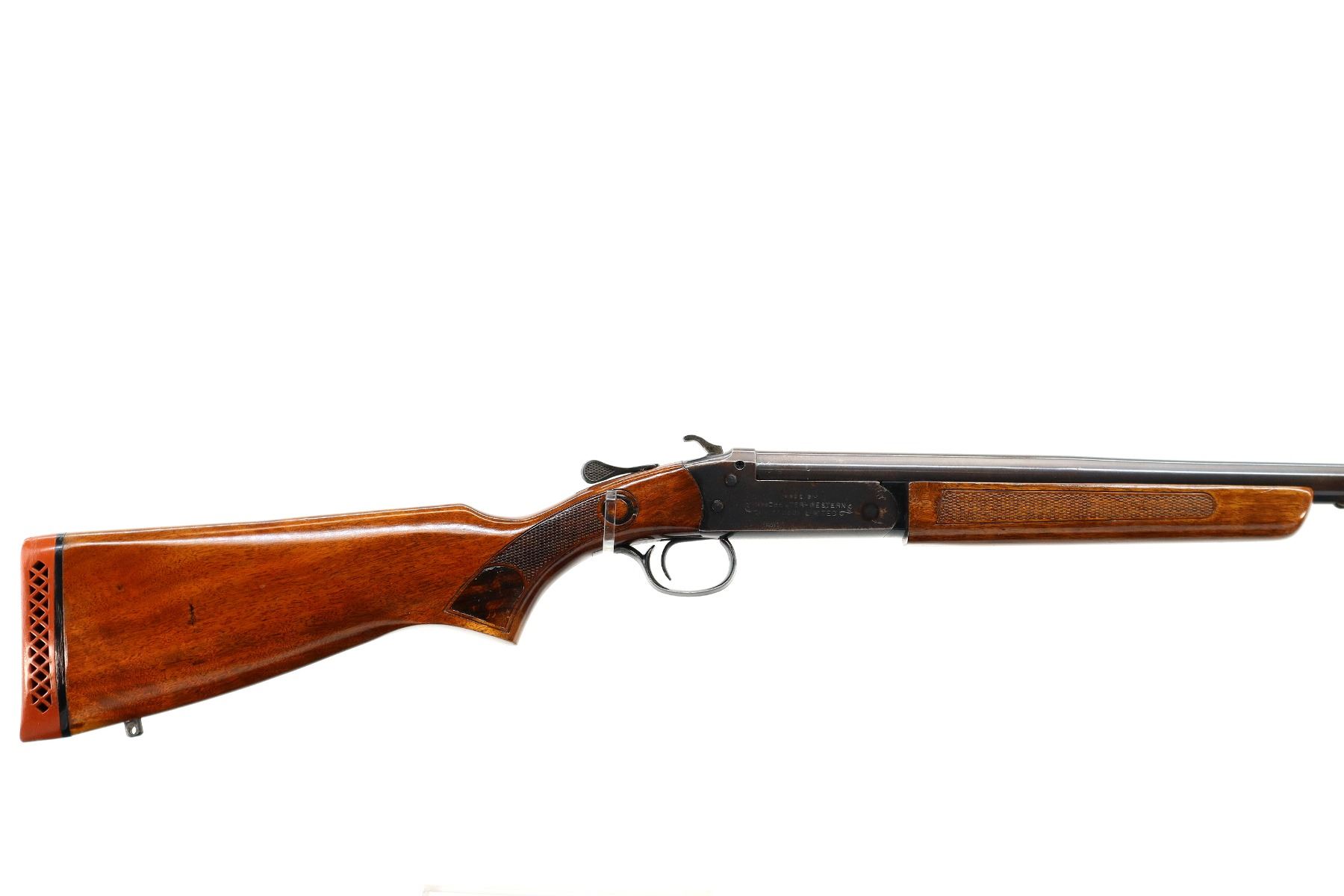 Main Description: Red fiber optic front bead, blued finish, shortened round barrel, grooved spur hammer, ejector. Two piece wood stocks, checkered forearm and pistol grip cracked behind upper and lower tangs, red vented rubber recoil pad, swivel studs.