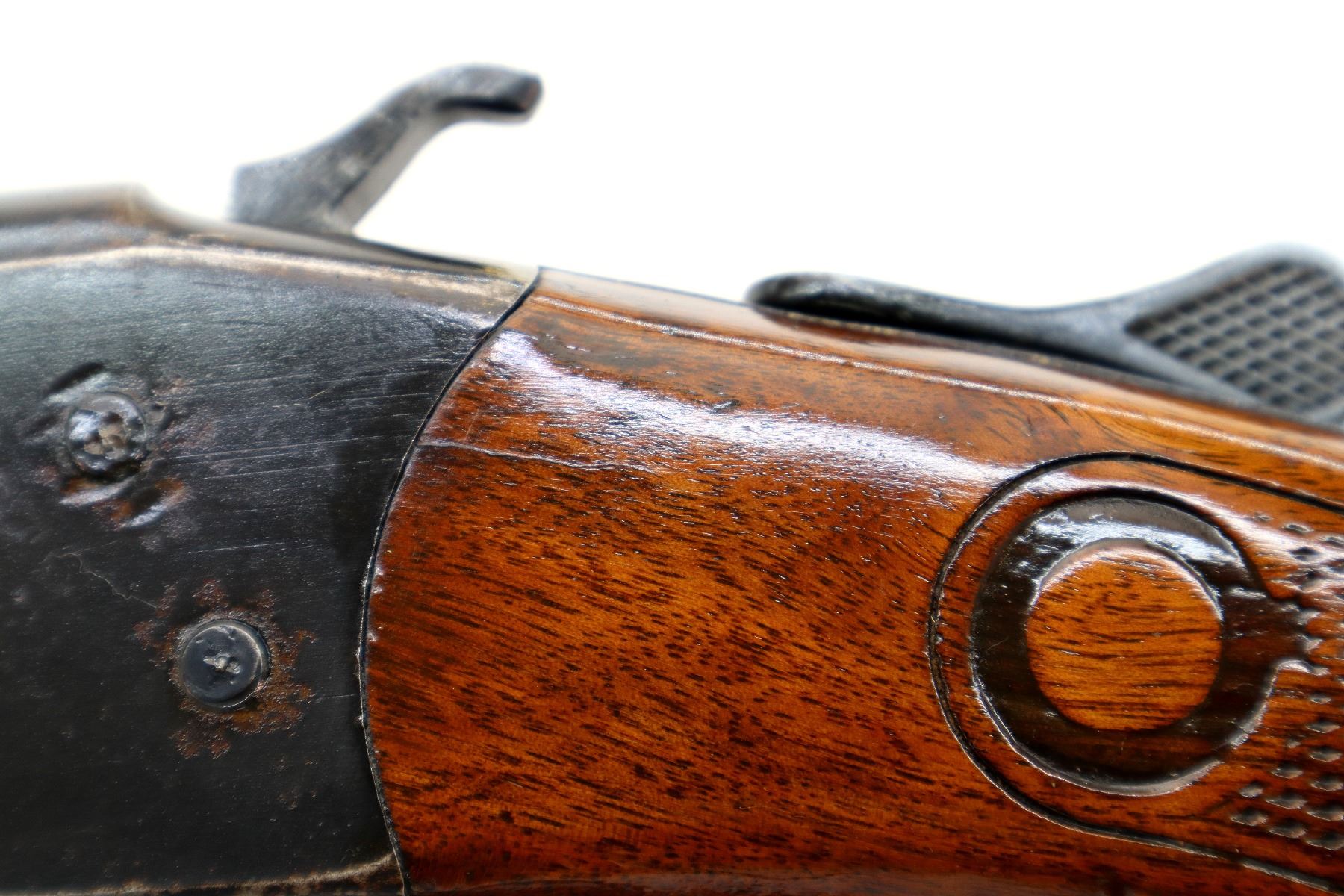 Wear: Metal finish shows some light rust speckles, scratches, handling marks and wear. Stocks show some marks, scratches and wear.