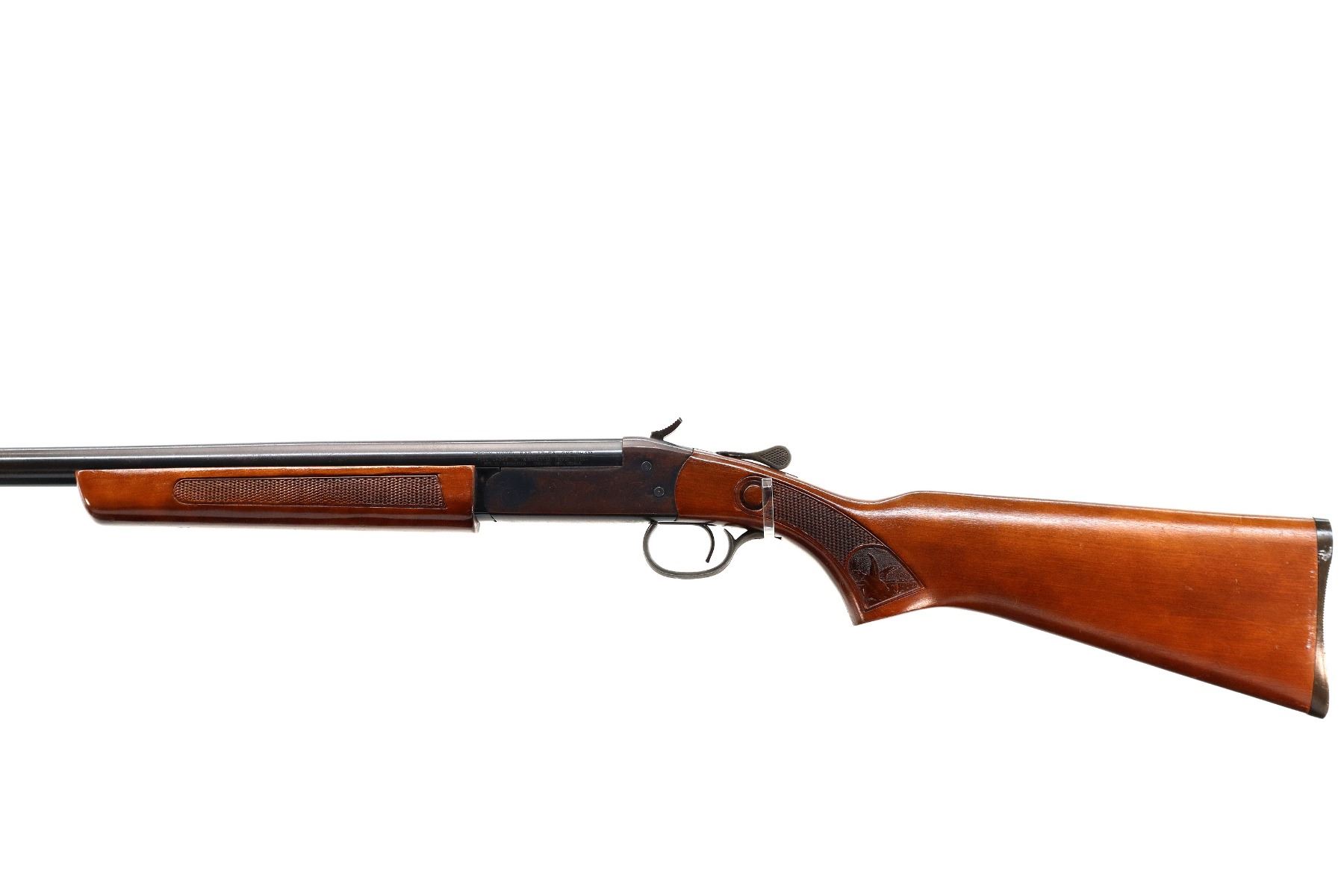 Main Description: Brass bead, blued finish, round barrel, grooved spur hammer, ejector. Two piece wood stocks, checkered forearm and pistol grip, grooved black polymer butt plate, bottom of grip has a small chip.