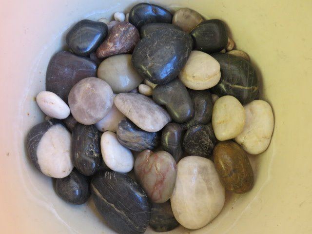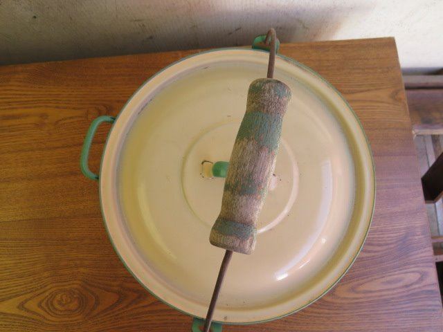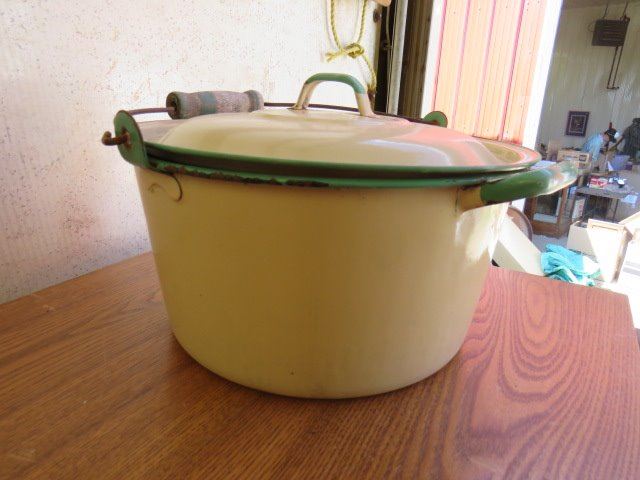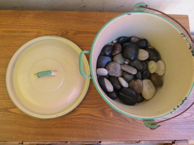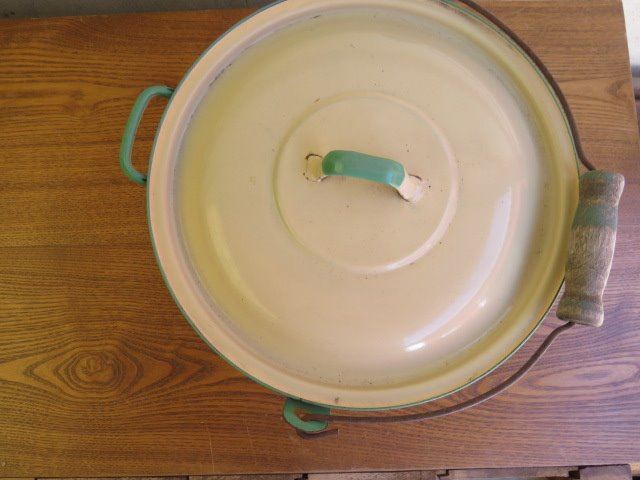 COOK POT WITH ROCKS (VINTAGE) *WITH LID* (CREAM WITH GREEN TRIM)