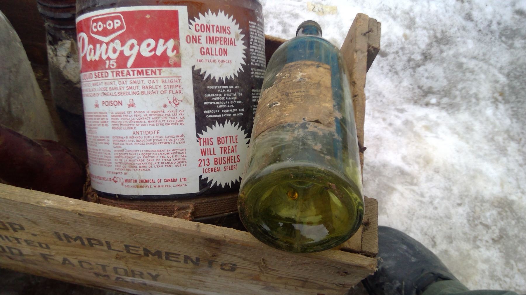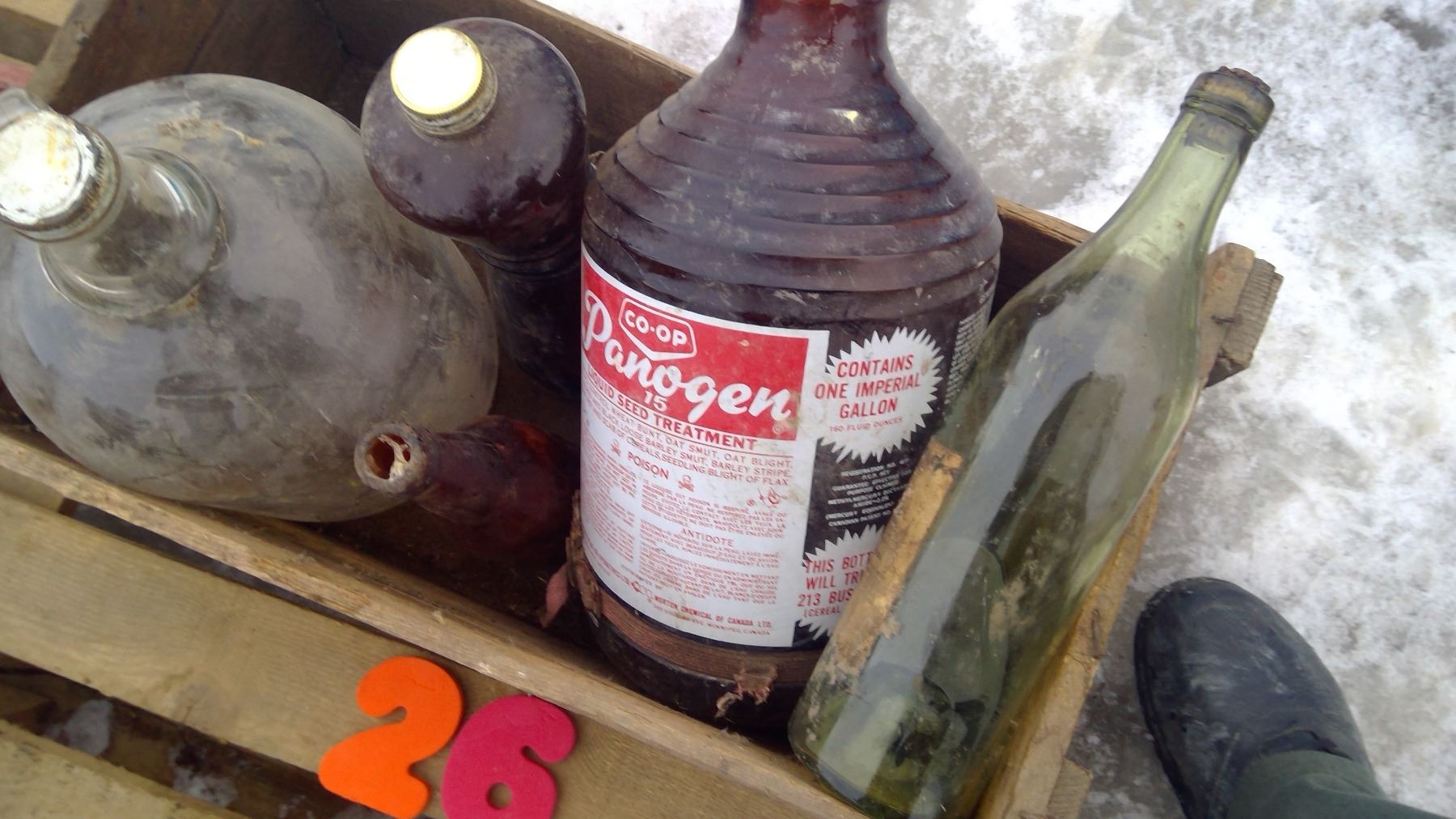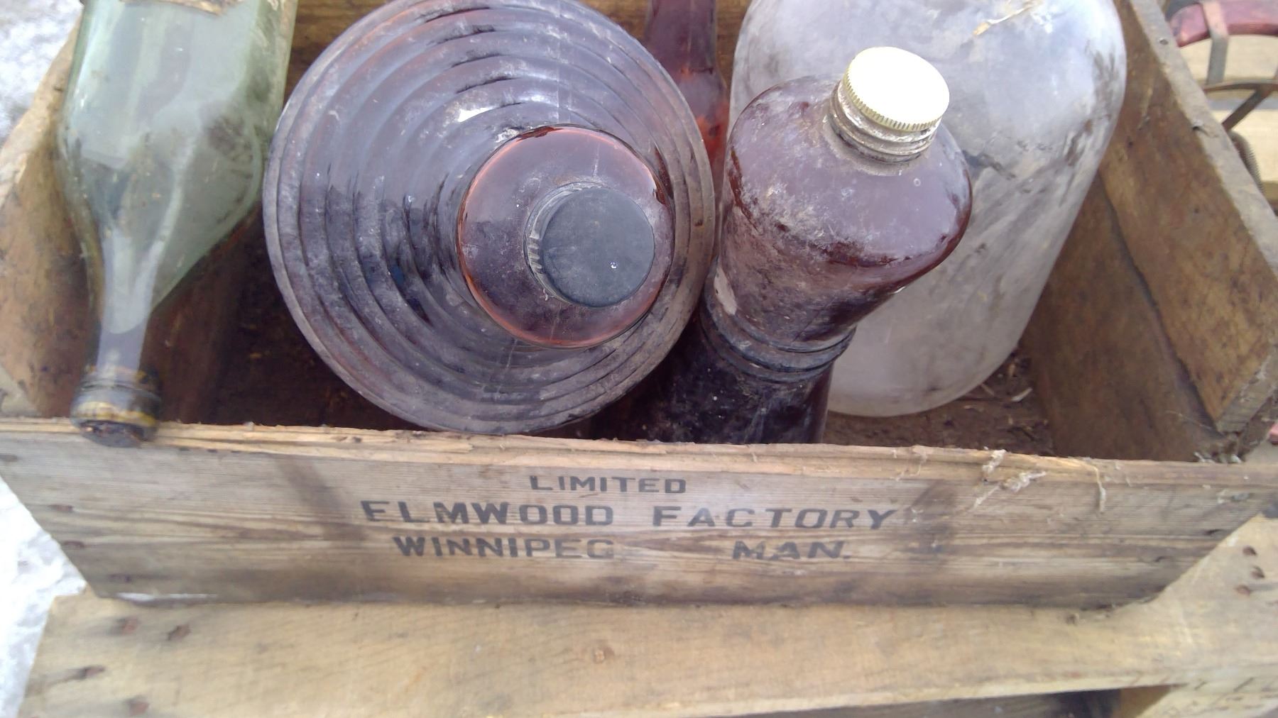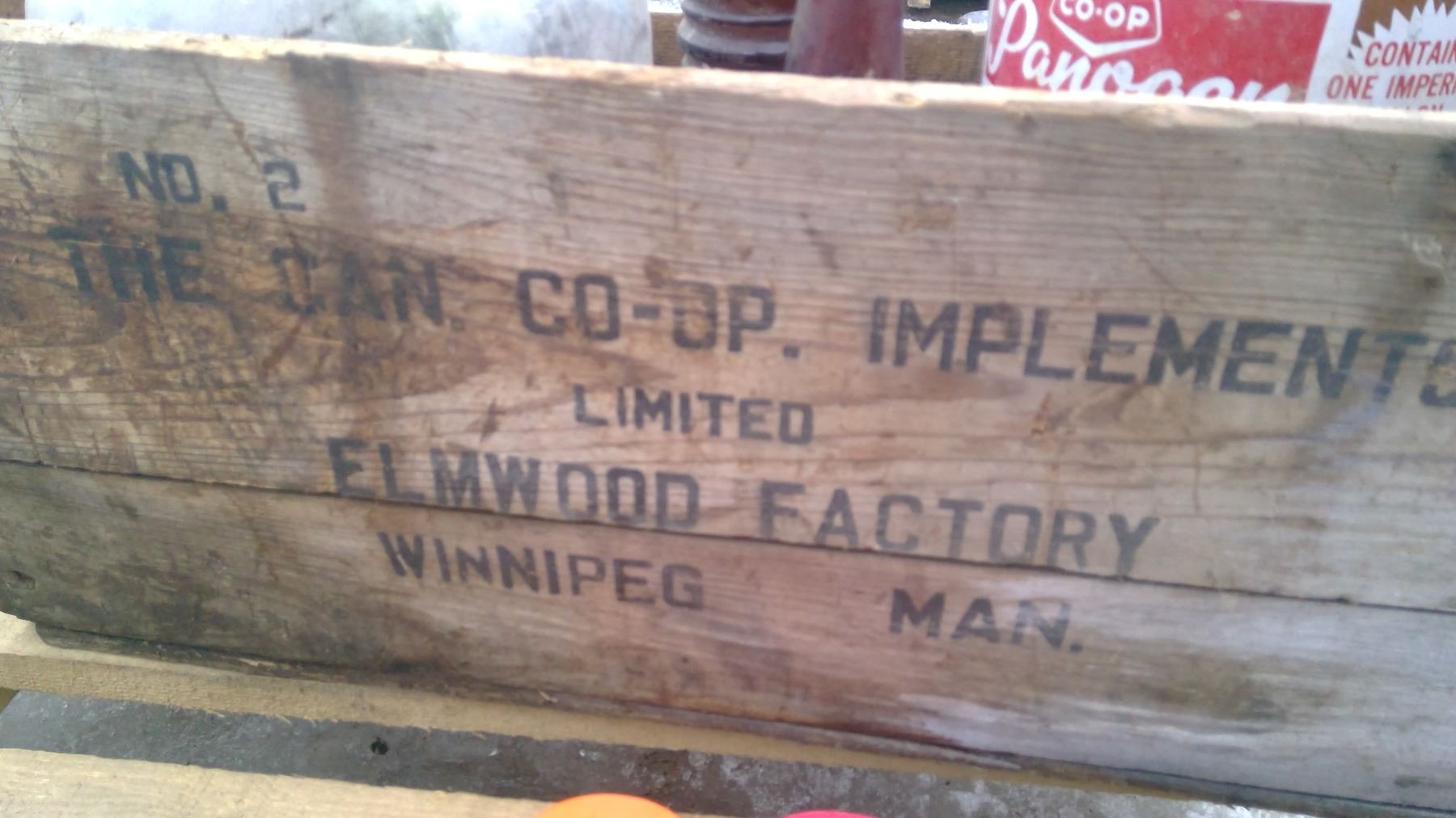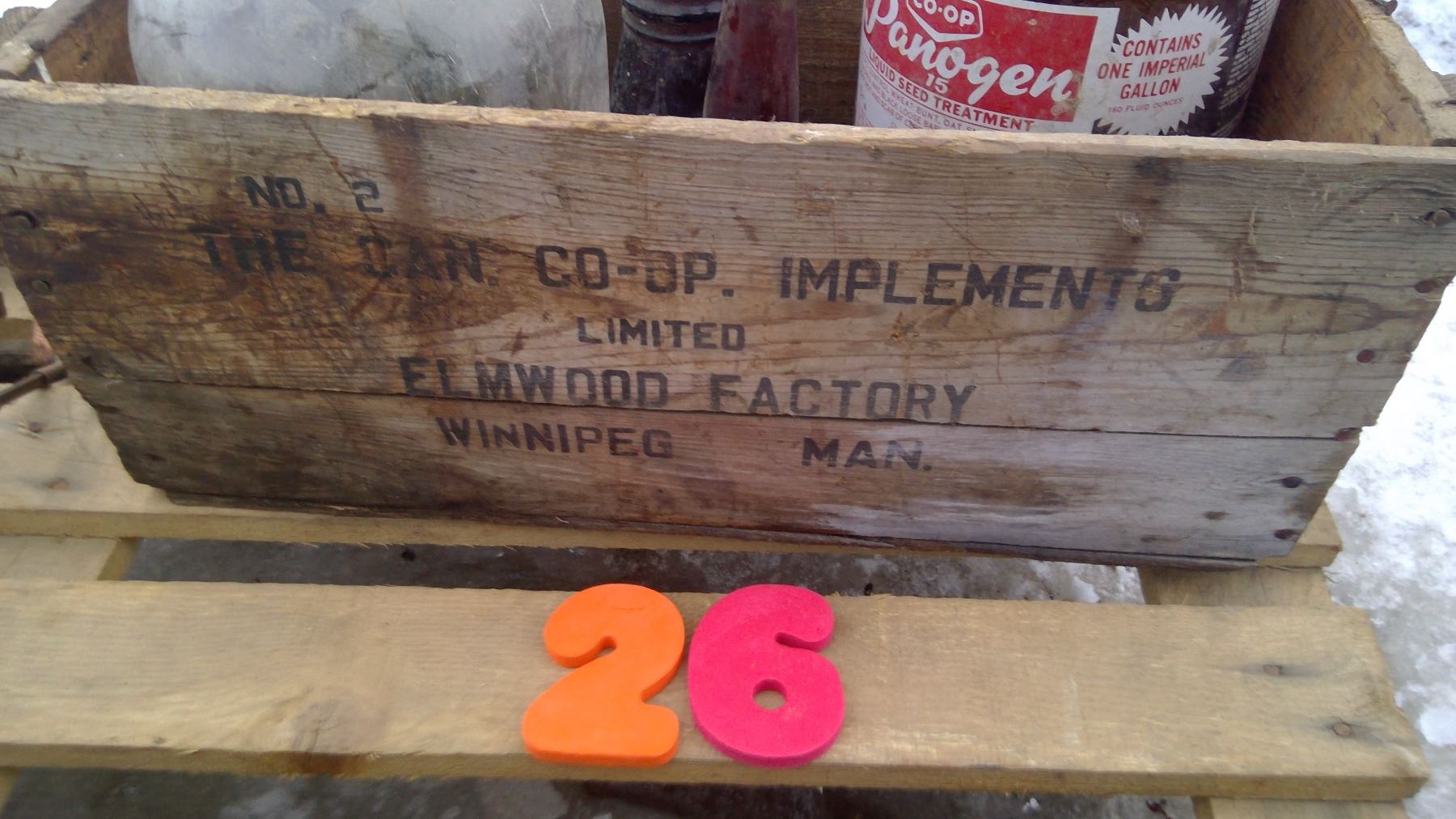 COOP IMPLEMENT WOODEN BOX FULL OF OLD BOTTLES