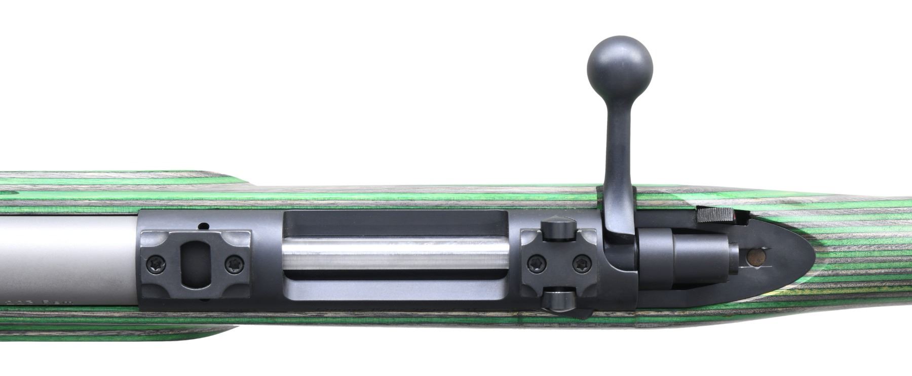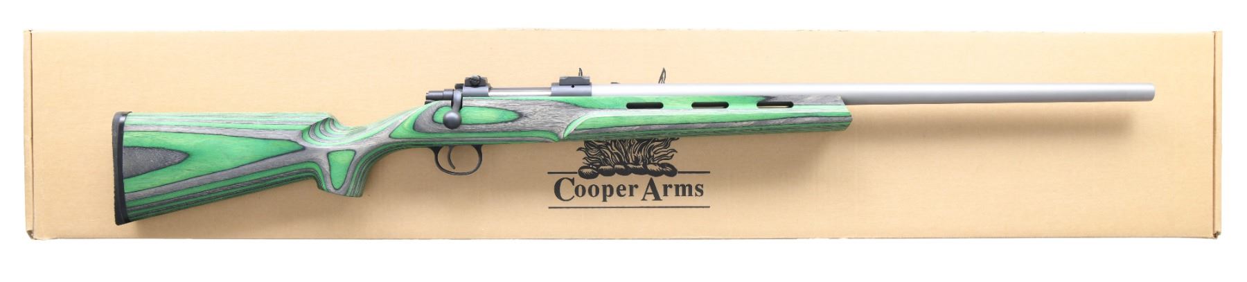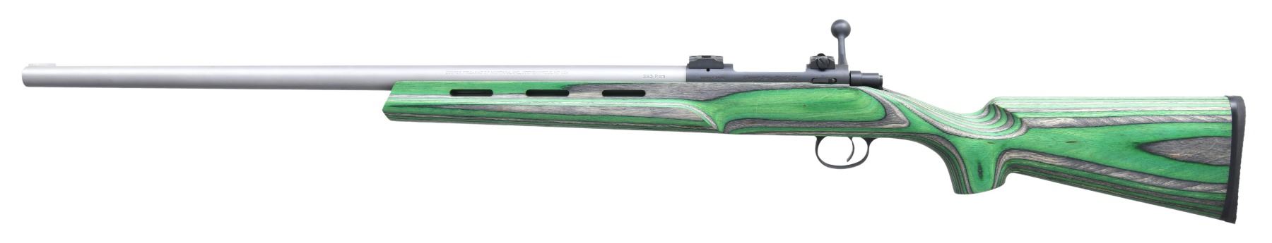 RIFLE. Cal. 223 Rem. S# SCHEELS 0594. Bbl. 24" stainless steel varmint weight w/o sights. Blue finished single shot action is equipped w/ scope bases. Green & gray laminated stock w/ vented beavertail forearm & black rifle pad. WEIGHT: 8 lbs, 1.6 oz. UNATTACHED ACCESSORIES: foam-lined box & shipping box containing owner's manual. CONDITION: as new w/ box. (24-3402/DS). MODERN. $1,500-2,000.
