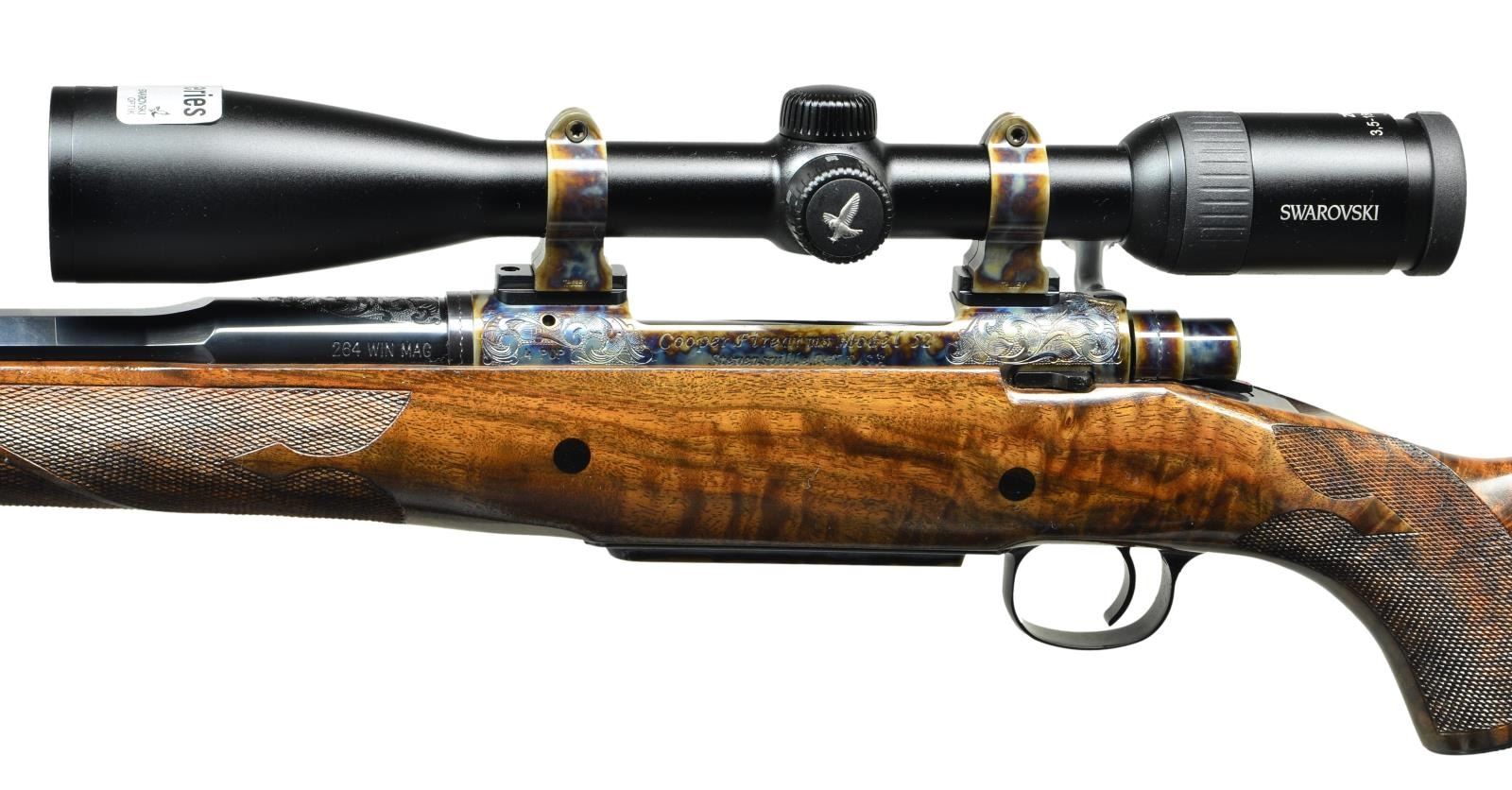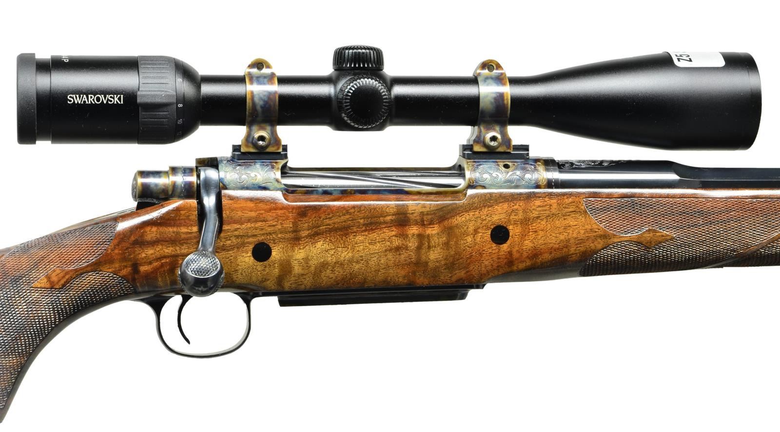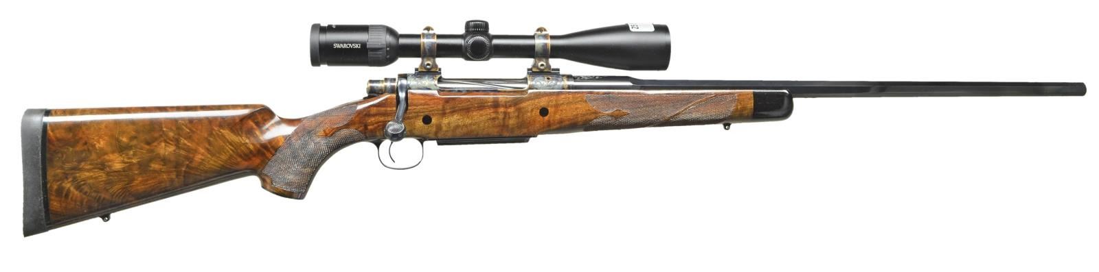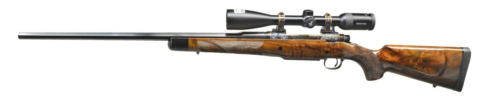 ACTION RIFLE. Cal. 264 Win. Mag. S# 4PUP. Bbl. 24" tapered octagon without sight. Receiver has full coverage foliate scroll engraving with beaded backgrounds. Engraving extends to breech end of barrel, trigger guard bow and magazine floorplate. 3 Lug short throw action with spiral fluted bolt. Bolt knob has 3 panel checkering. Top tang safety and cocking indicator. Single stage trigger. Blue finish with case colored receiver, cocking piece and magazine floorplate. Swarovski Z5 3.5-18X44P gloss finished scope with heavy duplex reticle on Talley bases and case colored rings. Classic straight comb cheekpiece stock of gloss finished Exhibition Grade walnut. Features include rosewood forearm tip, engraved skeleton steel grip cap, inletted swivel bases, 2 stock reinforcing lugs and fancy segmented borderless checkering. MAGS: 2 - 3 round detachable. UNATTACHED ACCESSORIES: original box containing owners manual, test target and spare mag. CONDITION: near new. Bright near excellent bore. Scope has bright optics. (22-2895/DS). MODERN. $4,500-7,500.