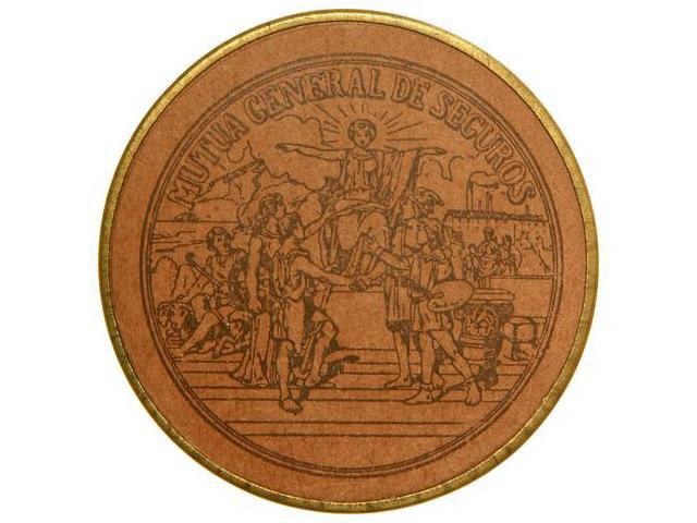 COOPERATIVE AND ADVERTISING TOKENS - 10 Céntimos. S/F (1939-1945). MUTUA GENERAL DE SEGUROS. BALMES 17. BARCELONA. Disco de cartulina marrón con circunferencia metálica y sello de Franco en reverso. Ø 44 mm. RARÍSIMA. L-1395. EBC-.