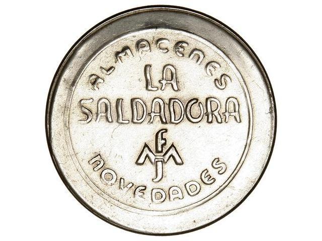 COOPERATIVE AND ADVERTISING TOKENS - 10 Céntimos. S/F. ALMACENES LA SALDADORA. NOVEDADES. BARCELONA. Al. Ø 36 mm. Disco de aluminio con sello del Cid en reverso. MUY RARA. L-1388. EBC-.