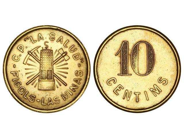 COOPERATIVE AND ADVERTISING TOKENS - 10 Cèntims. Guerra Civil. COOPERATIVA POPULAR LA SALUD. FIGOLS LAS MINAS. Latón. Ø 26 mm. ESCASA. L-3111. MBC+.