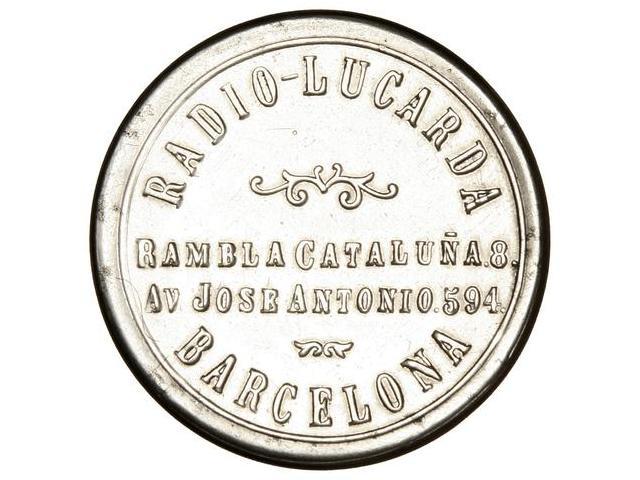 COOPERATIVE AND ADVERTISING TOKENS - 15 Céntimos. S/F. RADIO LUCARDA. RBLA. CATALUNYA 8, AVDA. JOSÉ ANTONIO, 594. BARCELONA. Al. Ø 36 mm. Disco de aluminio con sello del Cid en reverso. ESCASA. L-1399. MBC+.