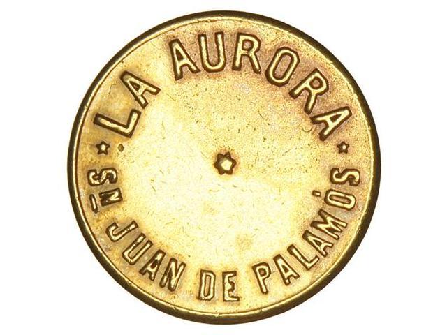 COOPERATIVE AND ADVERTISING TOKENS - 2 Céntimos. S/F. LA AURORA. SAN JUAN DE PALAMÓS. Latón. Ø 21 mm. (Pequeñas oxidaciones). MUY RARA. L-2153. MBC+.